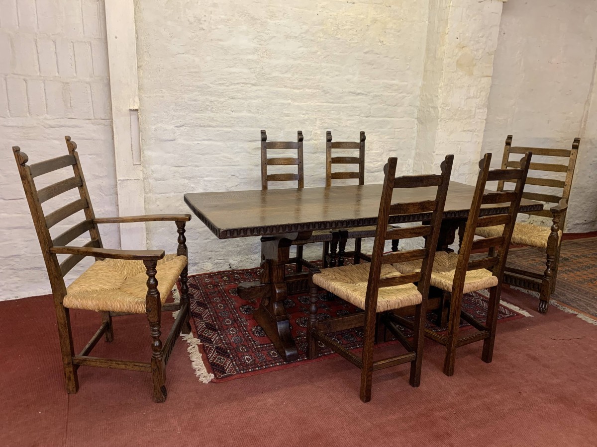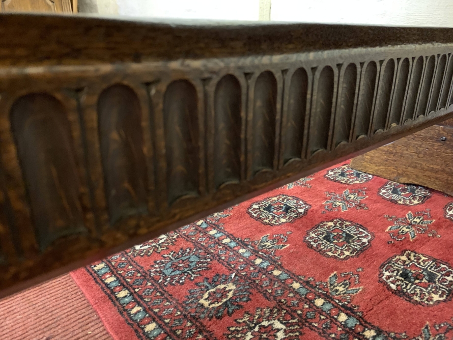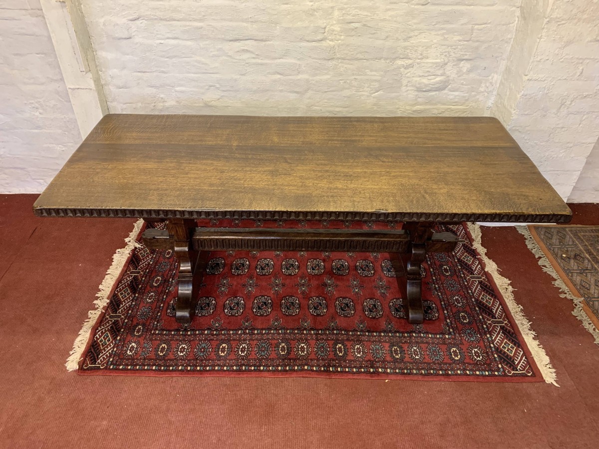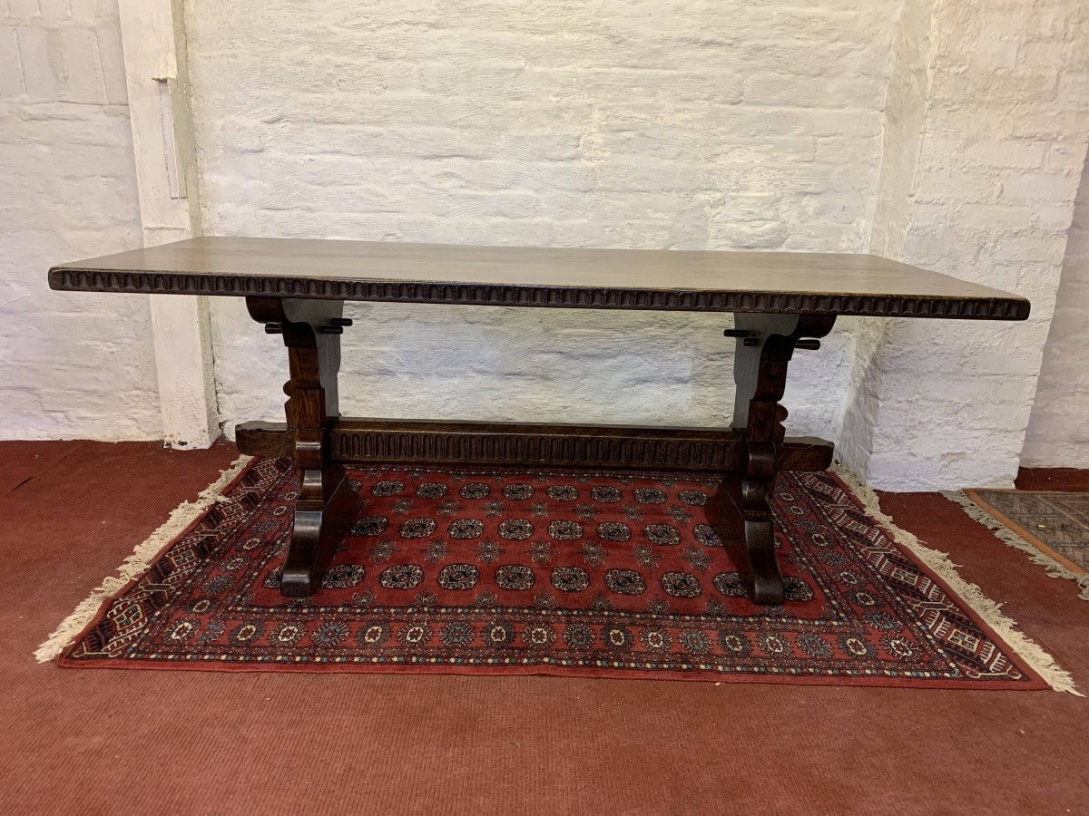This fantastic solid carved oak table was made by the renowned Rupert Nigel Griffiths furniture makers. Each of their items is individually crafted with hand cut dovetails and is carved, stained and polished by hand. Made entirely of quality solid oak with a beautiful graining throughout the thick top table has a carved edge. Having outstretched legs with sturdy blocked feet, carved central stretcher held in place by two handmade pegs at either end, its a stunning table which is in excellent condition.
