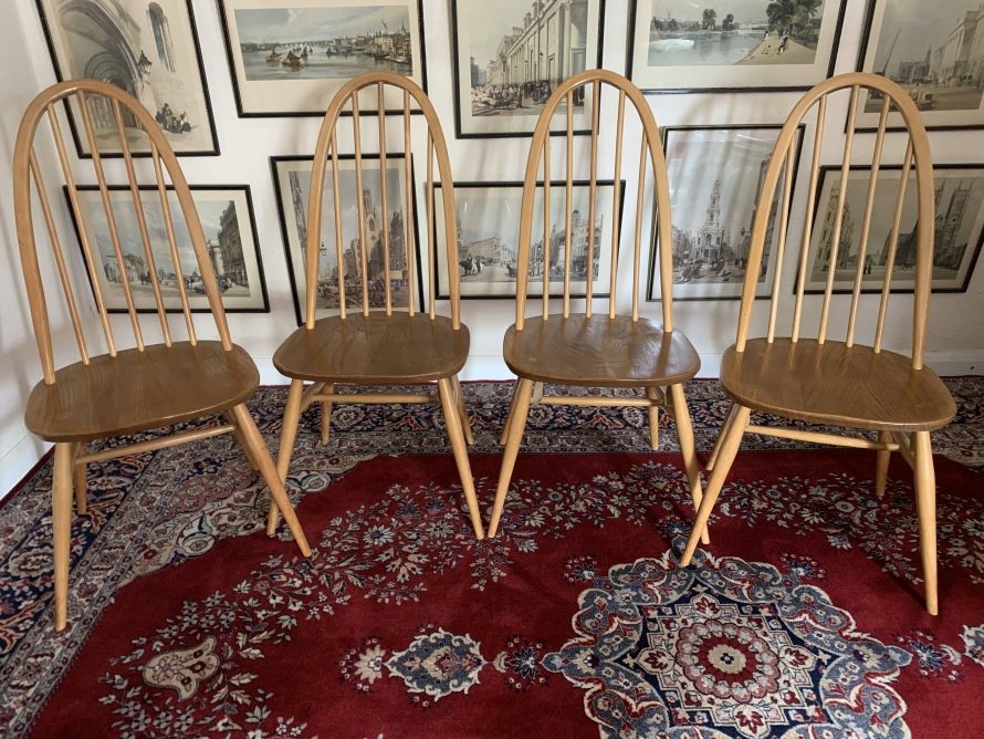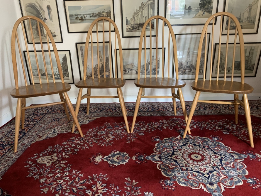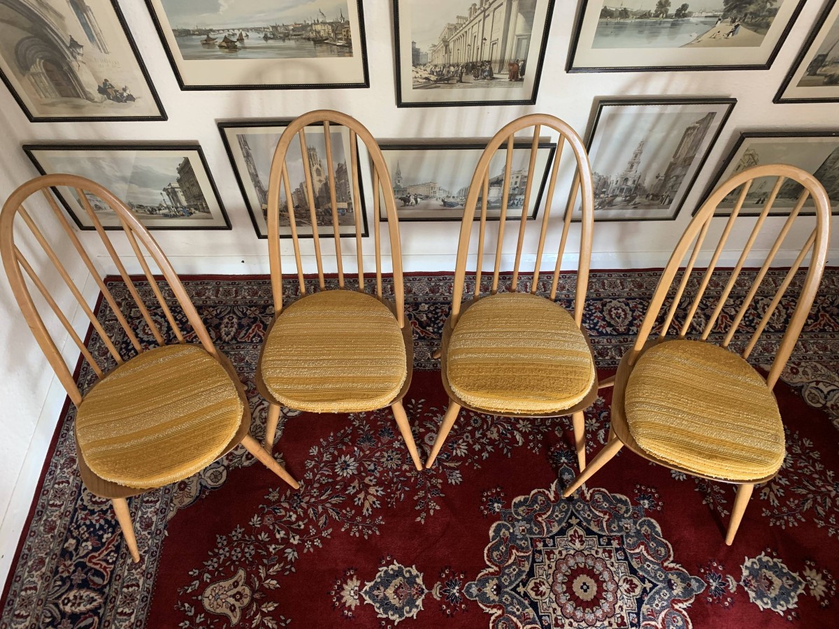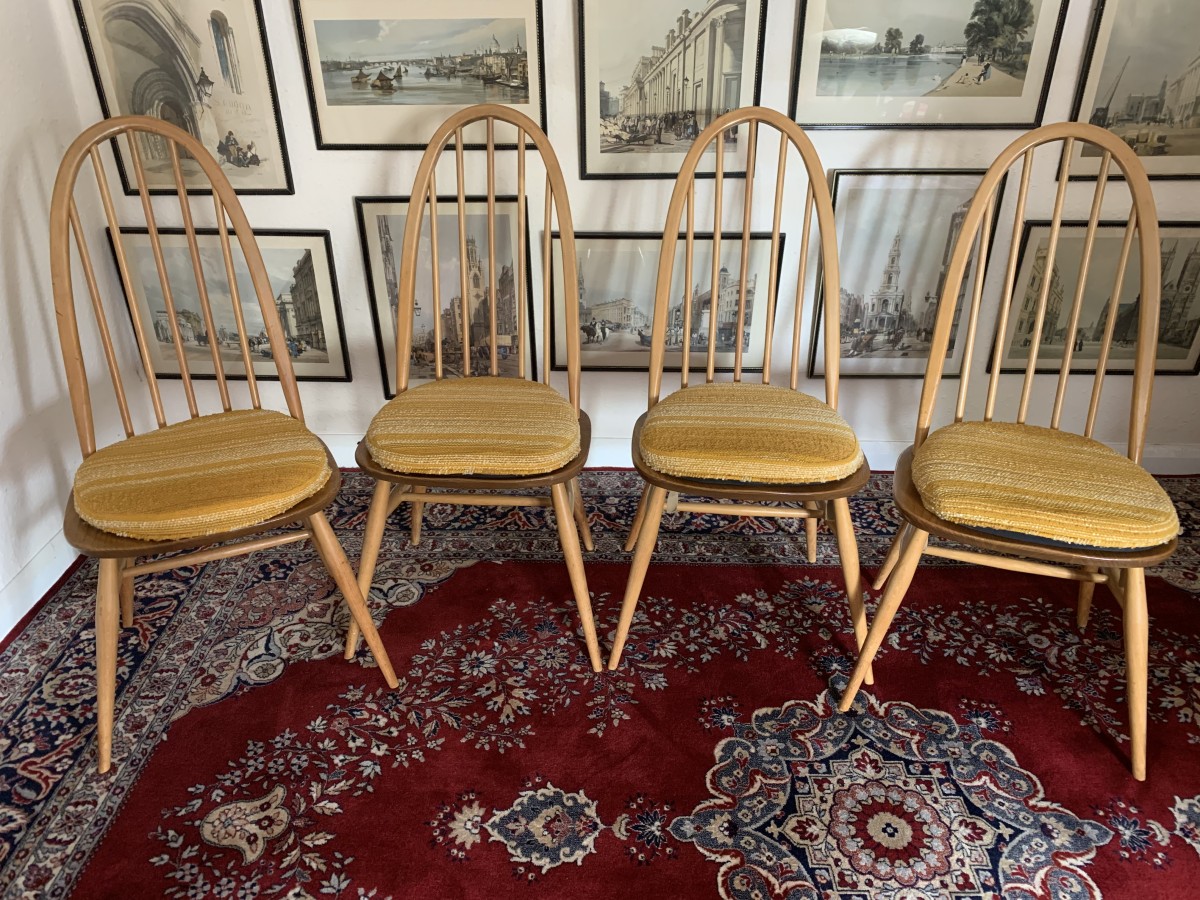 Retro personified with this beautiful set of four midcentury blonde Ercol quaker chairs. Made from glorious blonde elm these chairs would enhance any home. Removable original set pads included.