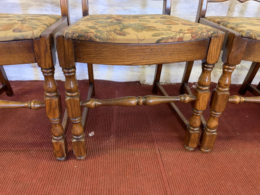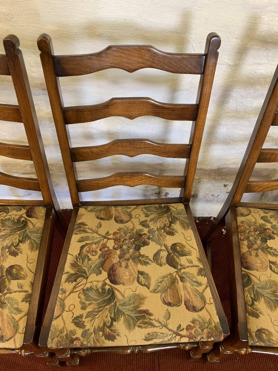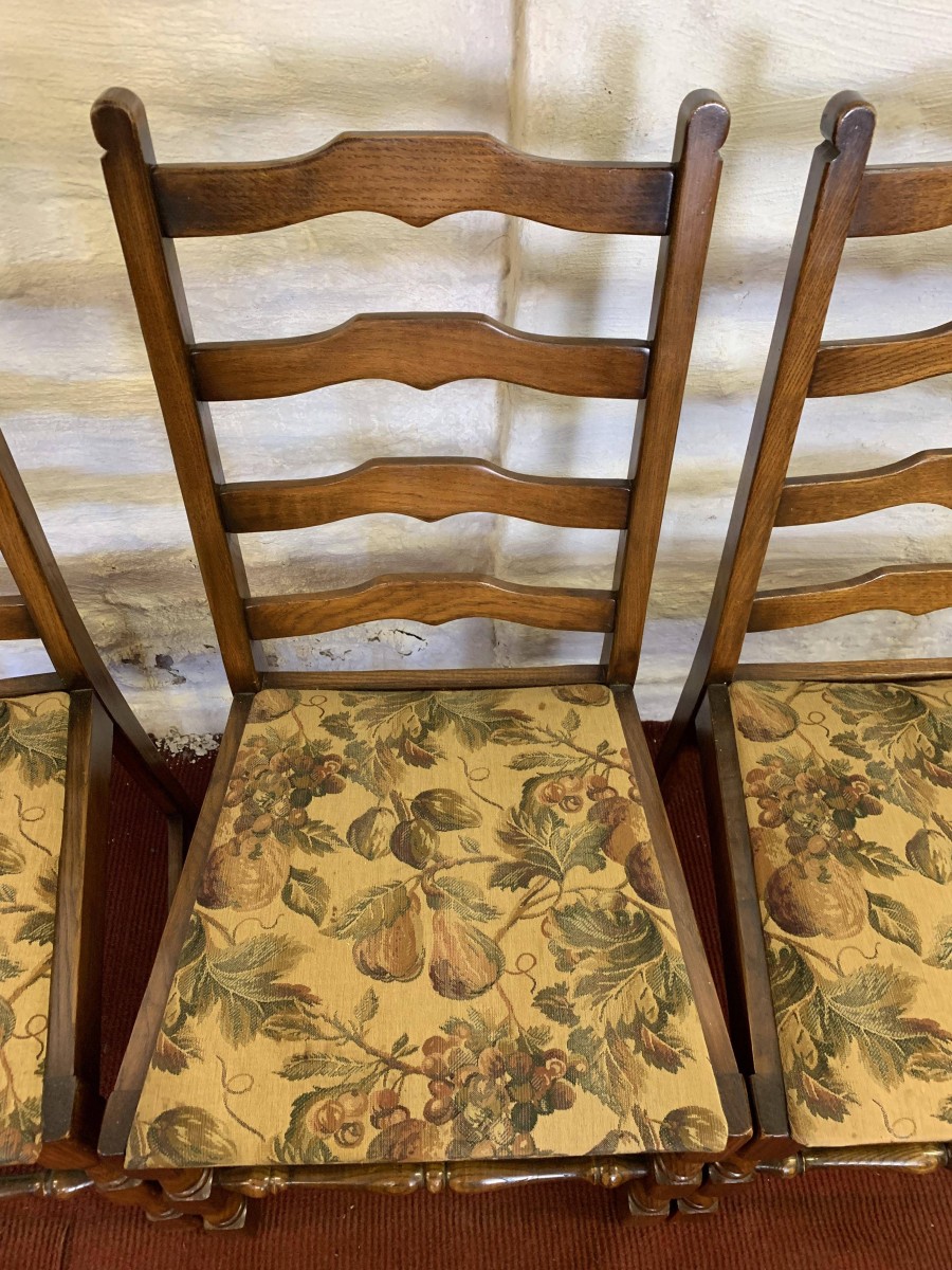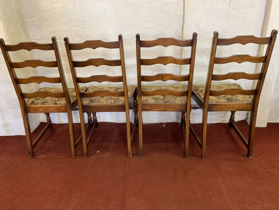We are delighted to offer this lovely set of four chairs which are in excellent condition. Each chair has a ladderback and upholstered cushioned seat. Turned legs to the front and a front turned stretcher.