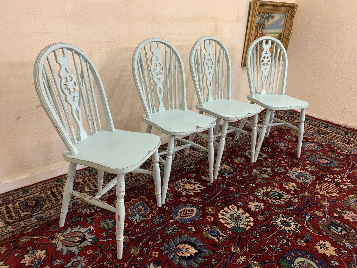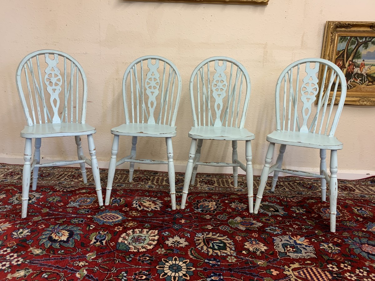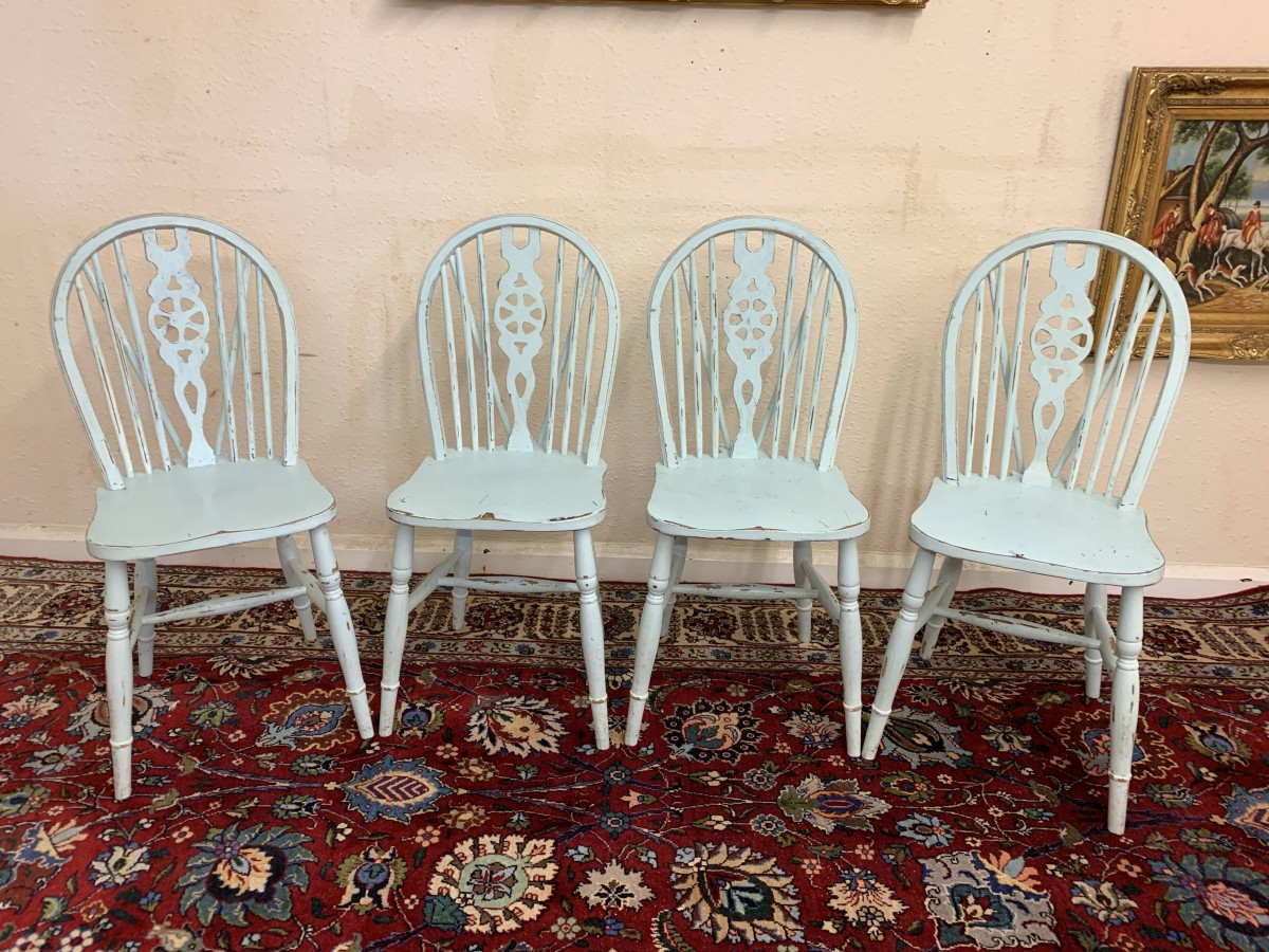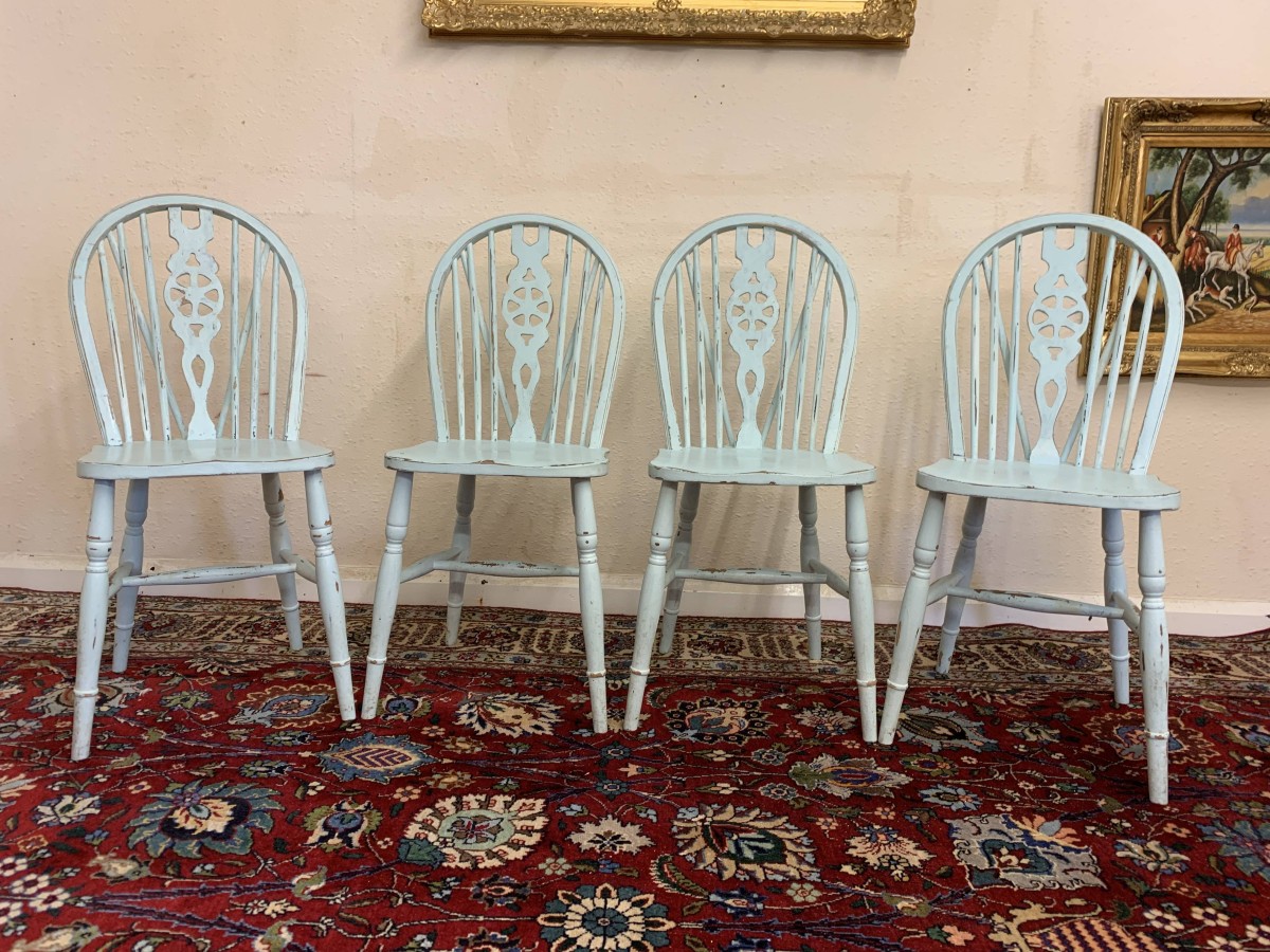 Tastefully painted to give a superb vintage look each chair having a wheel back, four turned legs with three turned stretcher supports.