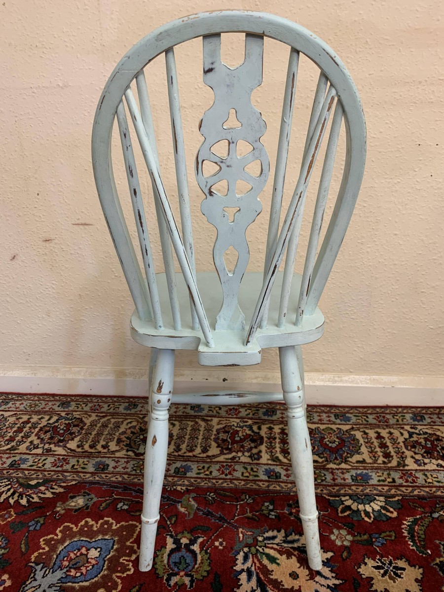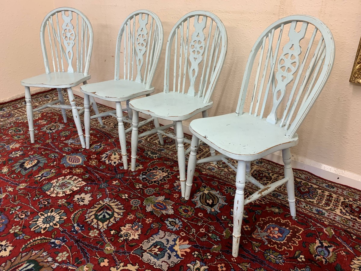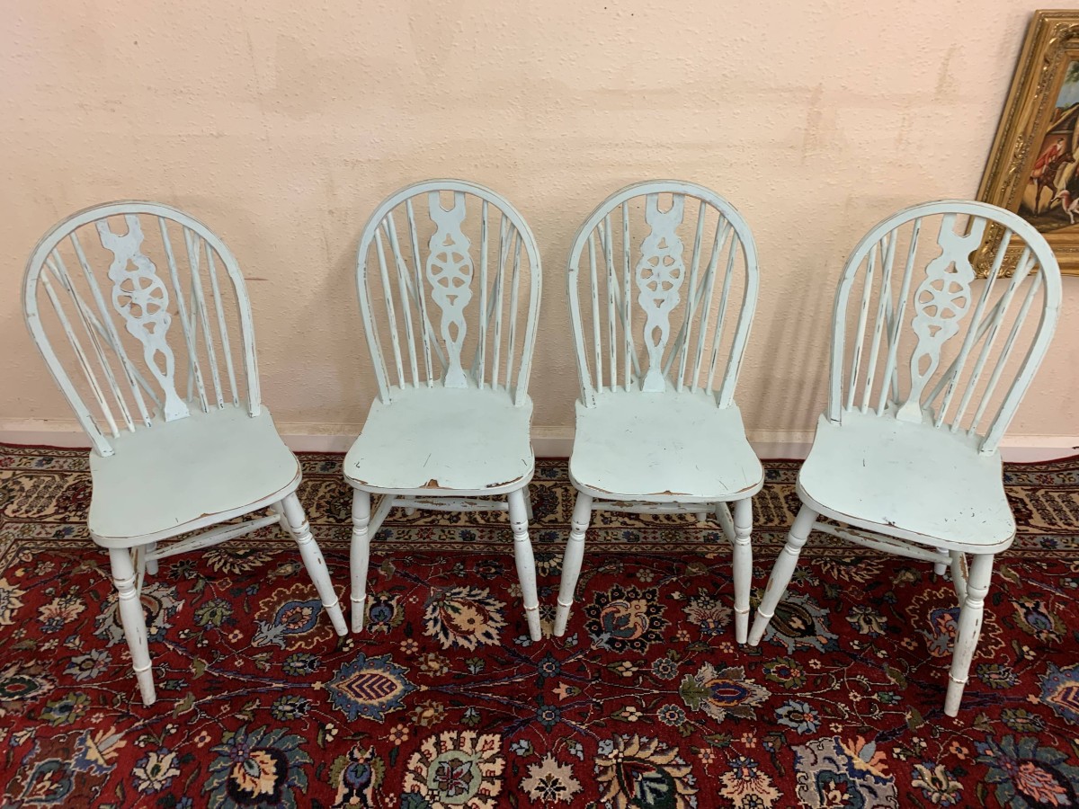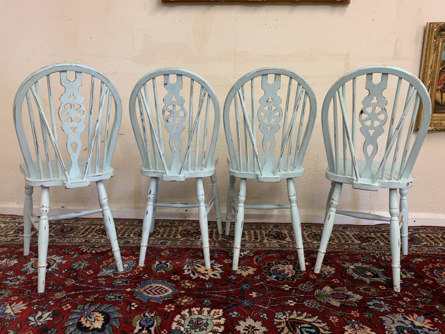 Tastefully painted to give a superb vintage look each chair having a wheel back, four turned legs with three turned stretcher supports.