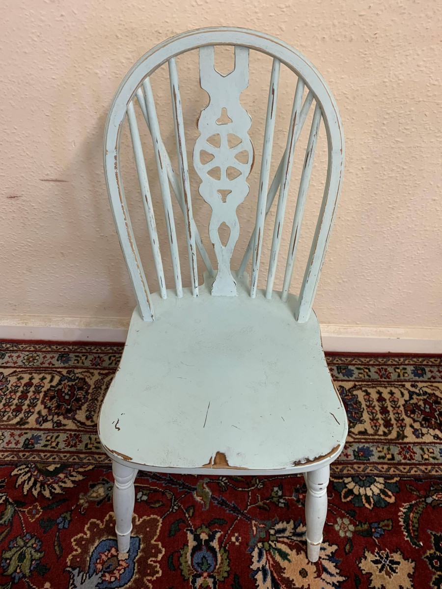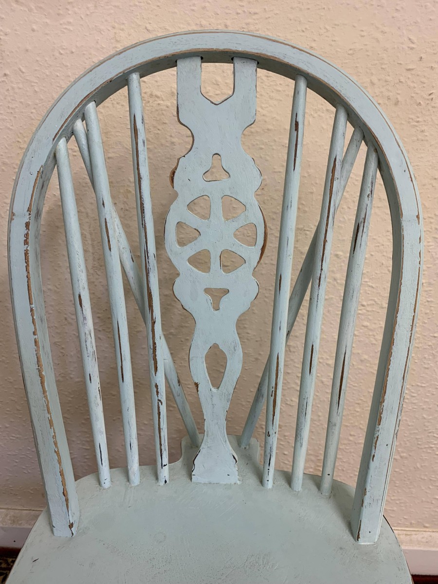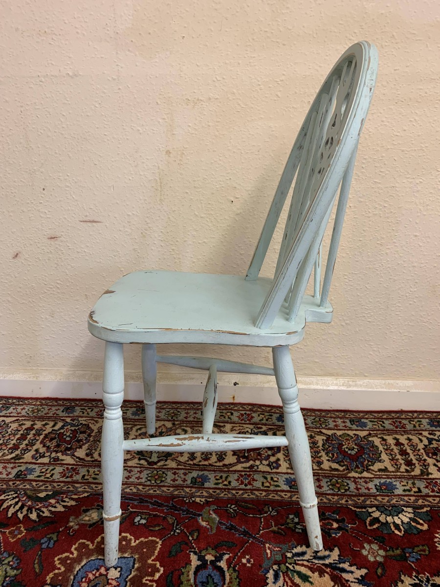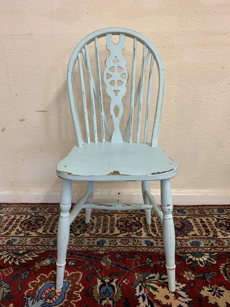 Tastefully painted to give a superb vintage look each chair having a wheel back, four turned legs with three turned stretcher supports.