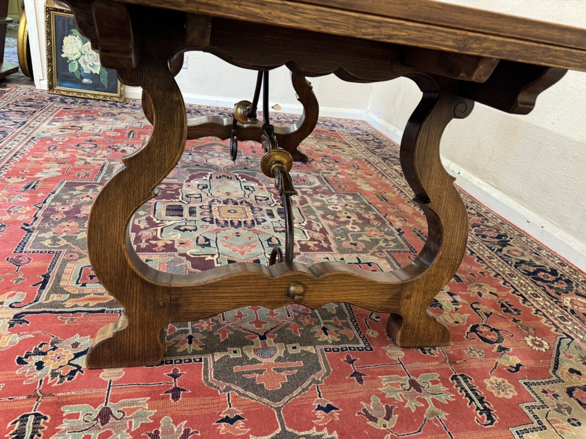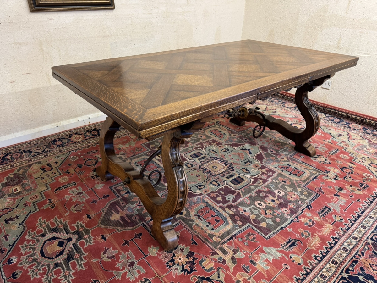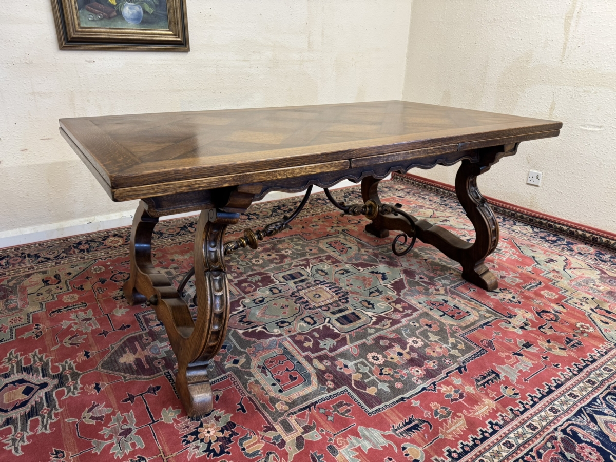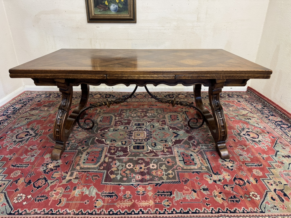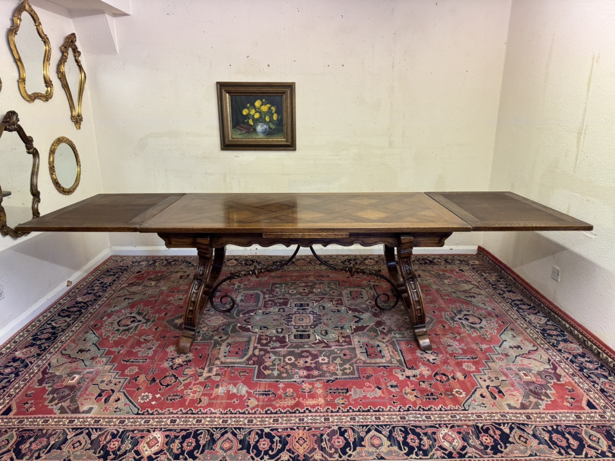 This super Spanish table is in excellent condition. The beautiful parquetry top conceals two sliding extension leaves which pull out easily from each end extending the table capacity extensively. Two carved silhouette ends with a stunning shaped and carved metal stretcher support. This exceptional table is in excellent condition.