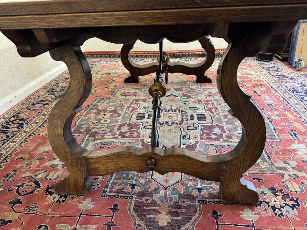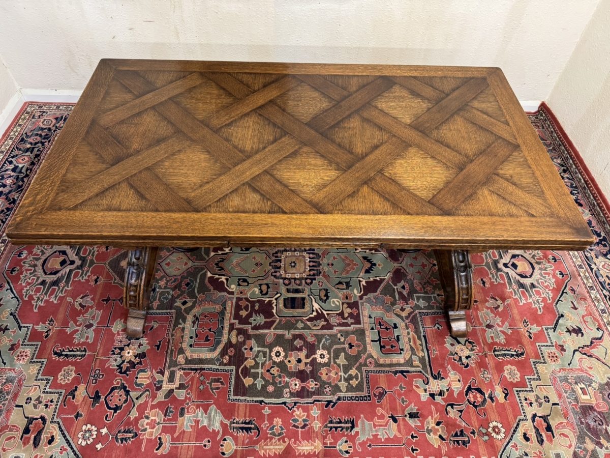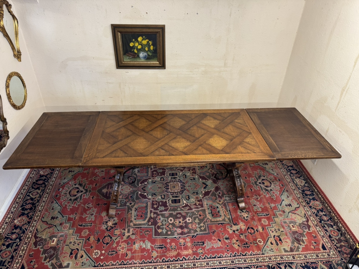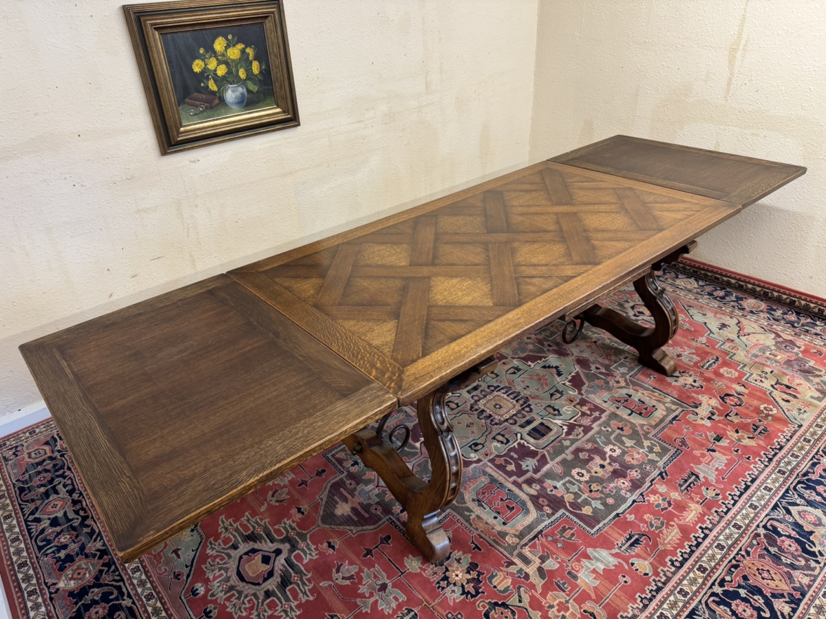 This super Spanish table is in excellent condition. The beautiful parquetry top conceals two sliding extension leaves which pull out easily from each end extending the table capacity extensively. Two carved silhouette ends with a stunning shaped and carved metal stretcher support. This exceptional table is in excellent condition.