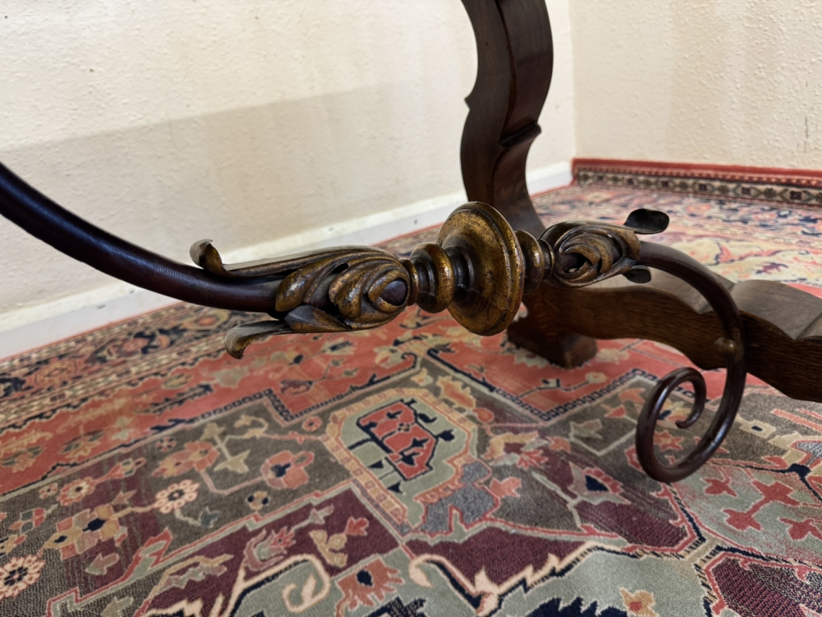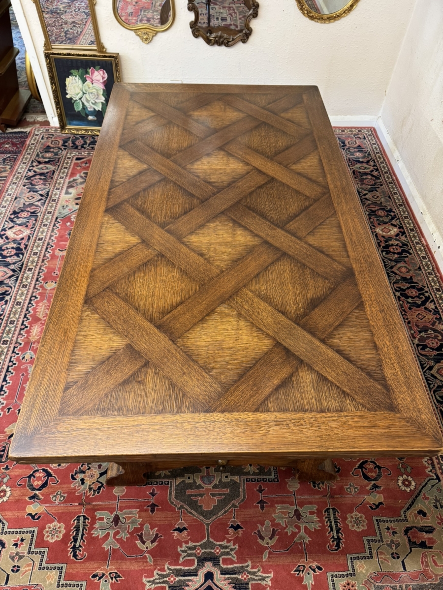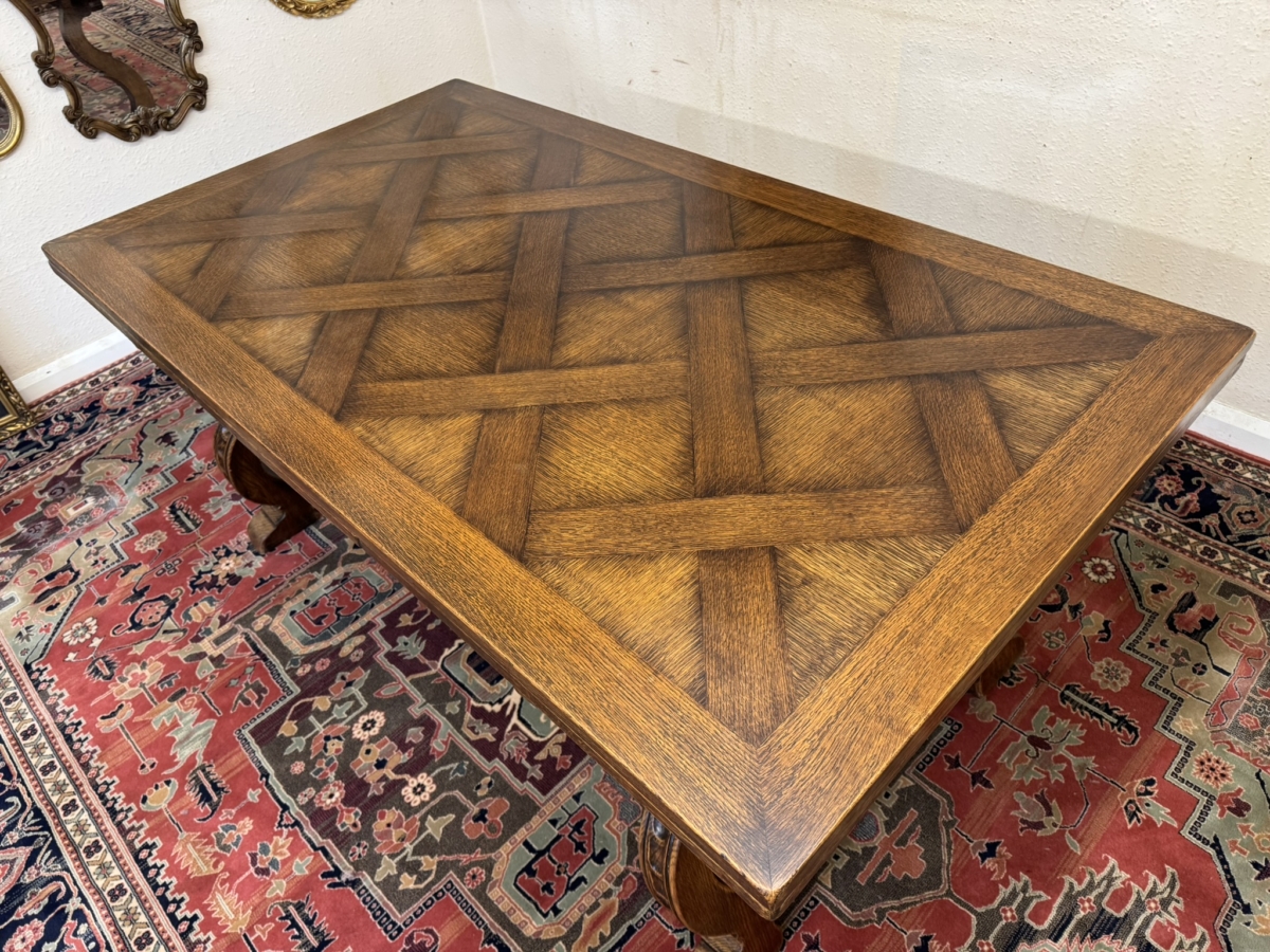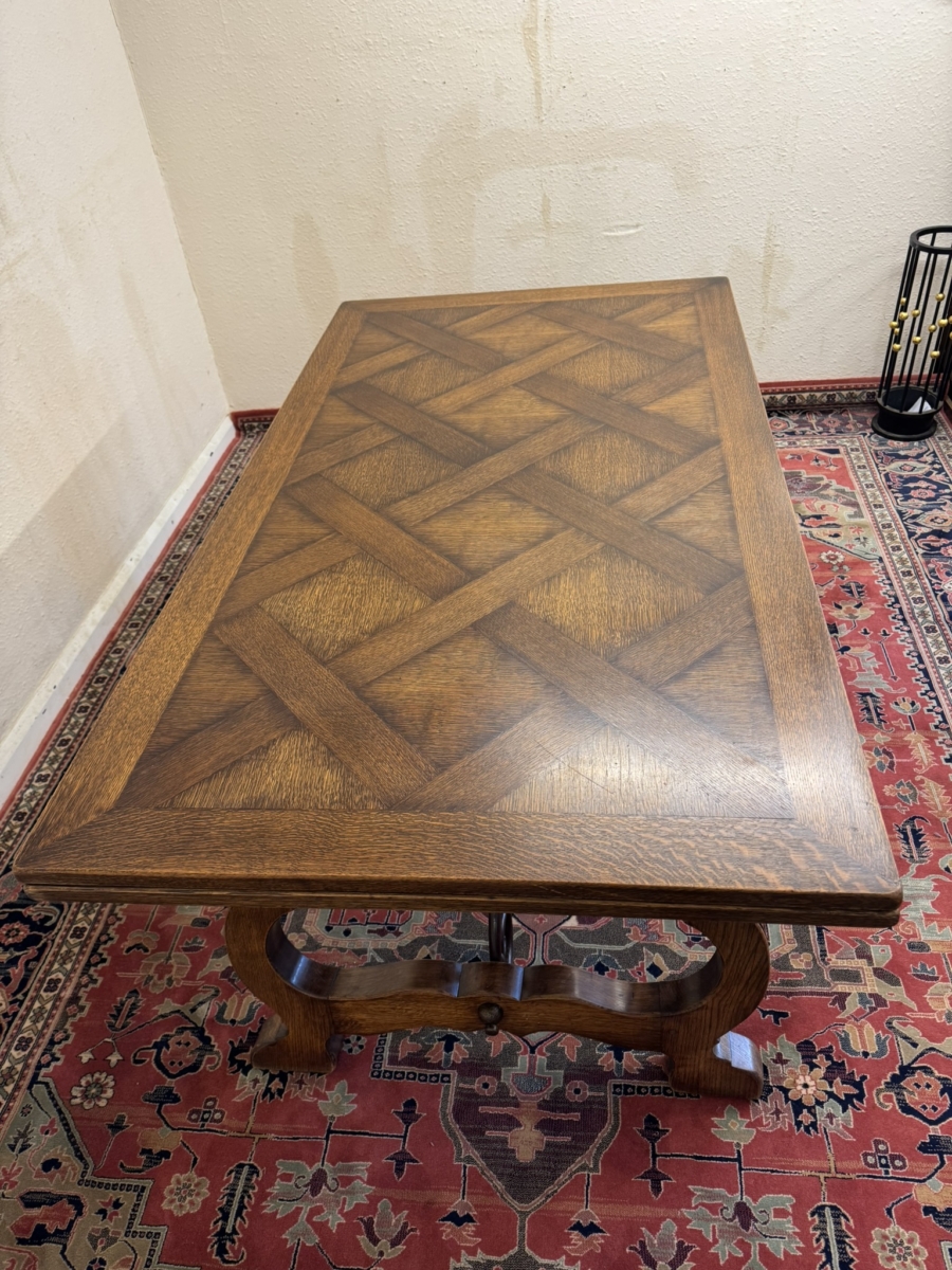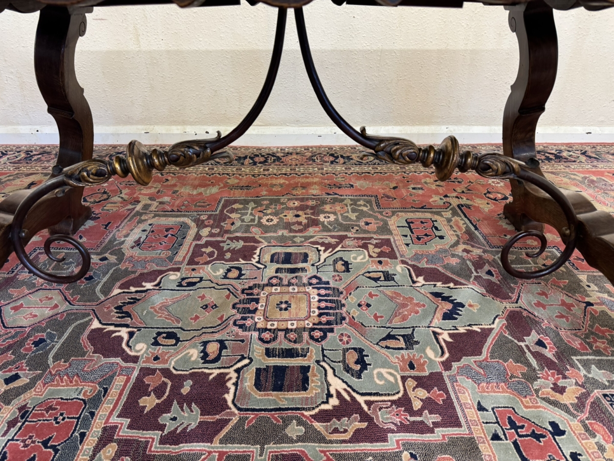 This super Spanish table is in excellent condition. The beautiful parquetry top conceals two sliding extension leaves which pull out easily from each end extending the table capacity extensively. Two carved silhouette ends with a stunning shaped and carved metal stretcher support. This exceptional table is in excellent condition.