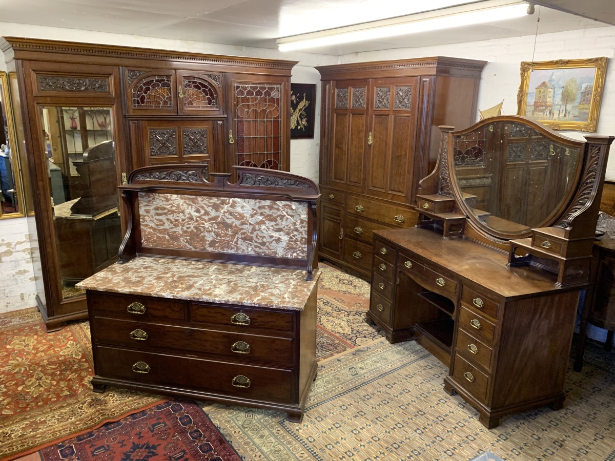 The washstand has a shaped carved back with a marble insert which sits above two short and three long drawers. The drawers having brass handles. The washstand sits on bracket feet. WARDROBE: Width 2m 41cm Height 2m 20cm Depth 56cm LINEN CUPBOARD: Width 1m 65cm Height 2m 20cm Depth 68cm DRESSING TABLE: Width 1m 46cm Height 1m 70cm Depth 61cm WASHSTAND: Width 1 m 38cm Height 1m 40cm Depth 61cm