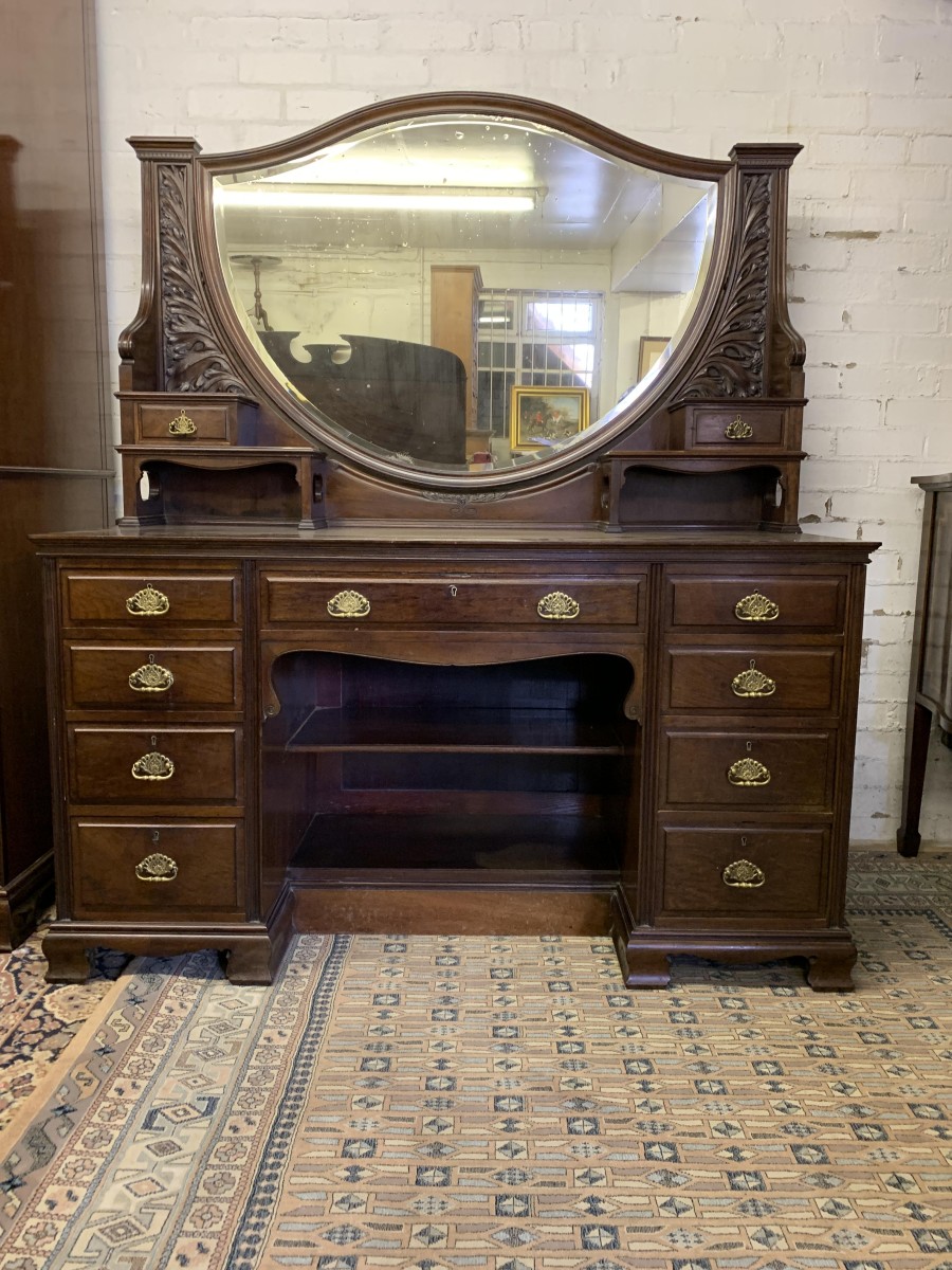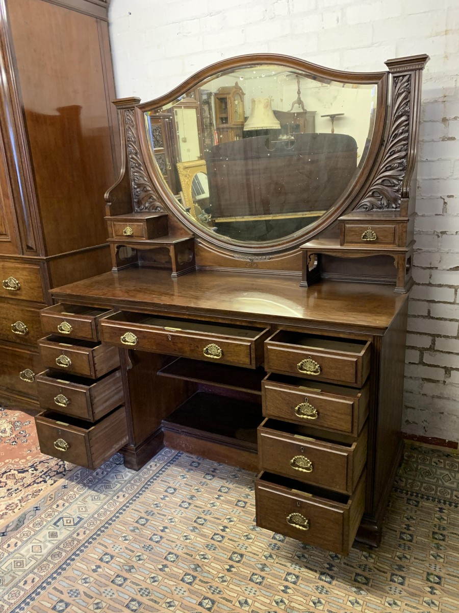 The dressing table has a shield bevelled mirror which sits inside carved leaf decorated supports with two drawers below, each drawer having a brass handle. Central drawer is flanked by four graduated drawers. The dressing table sits on bracket feet.