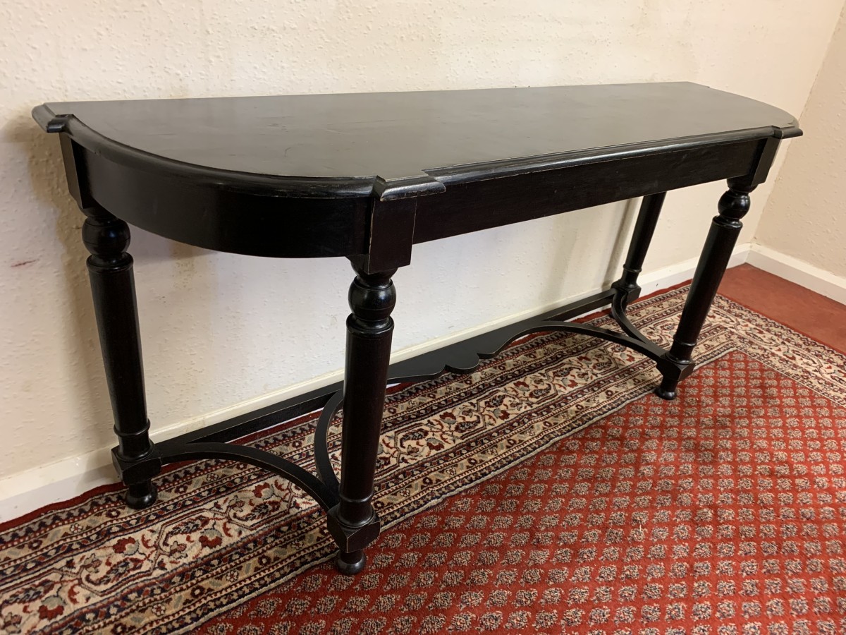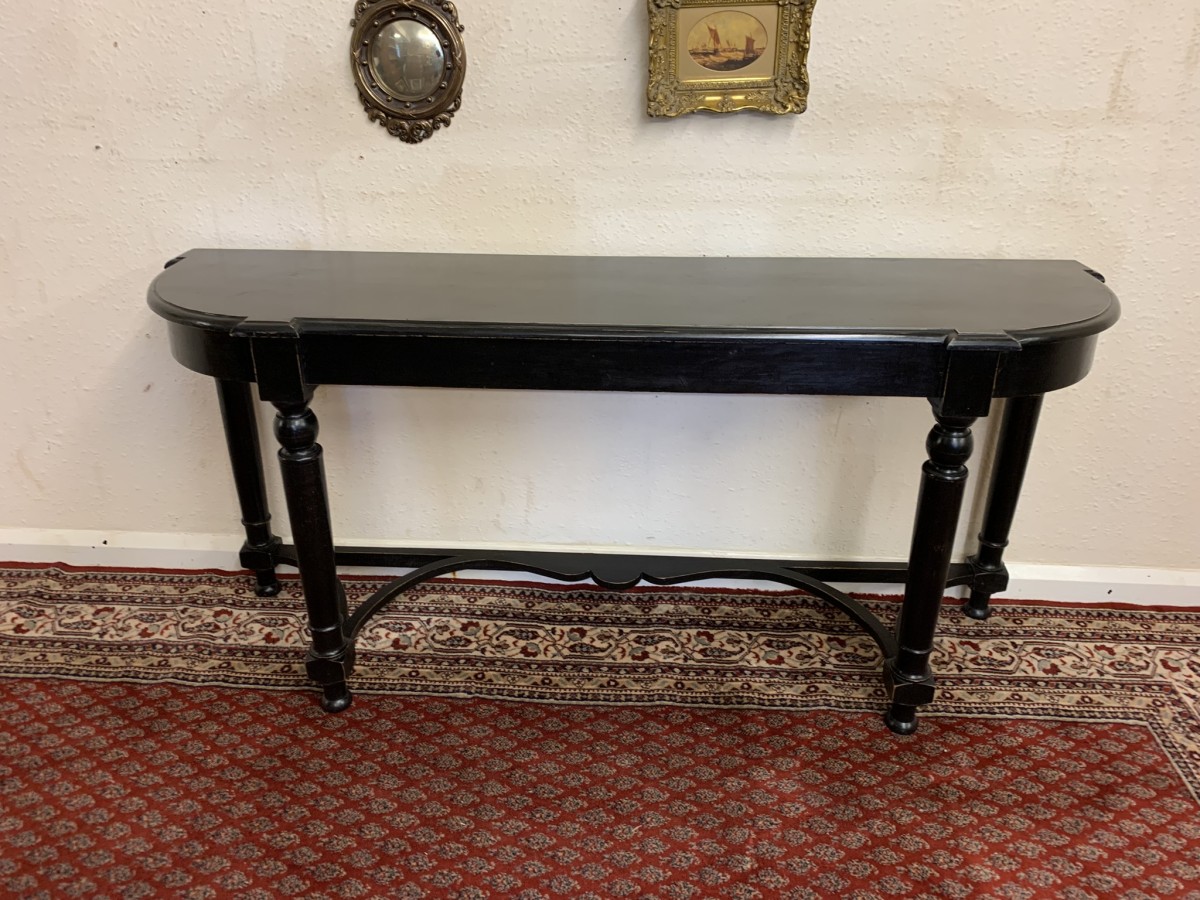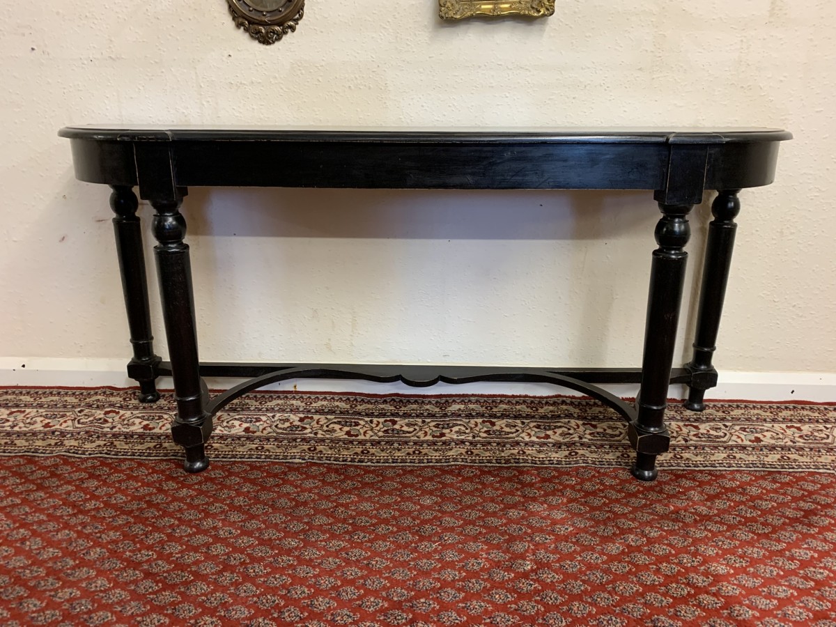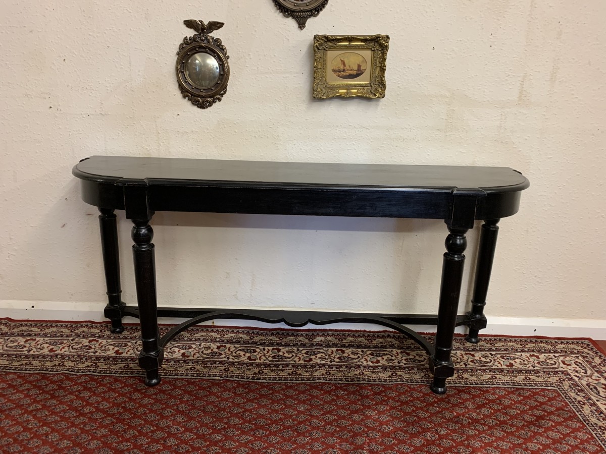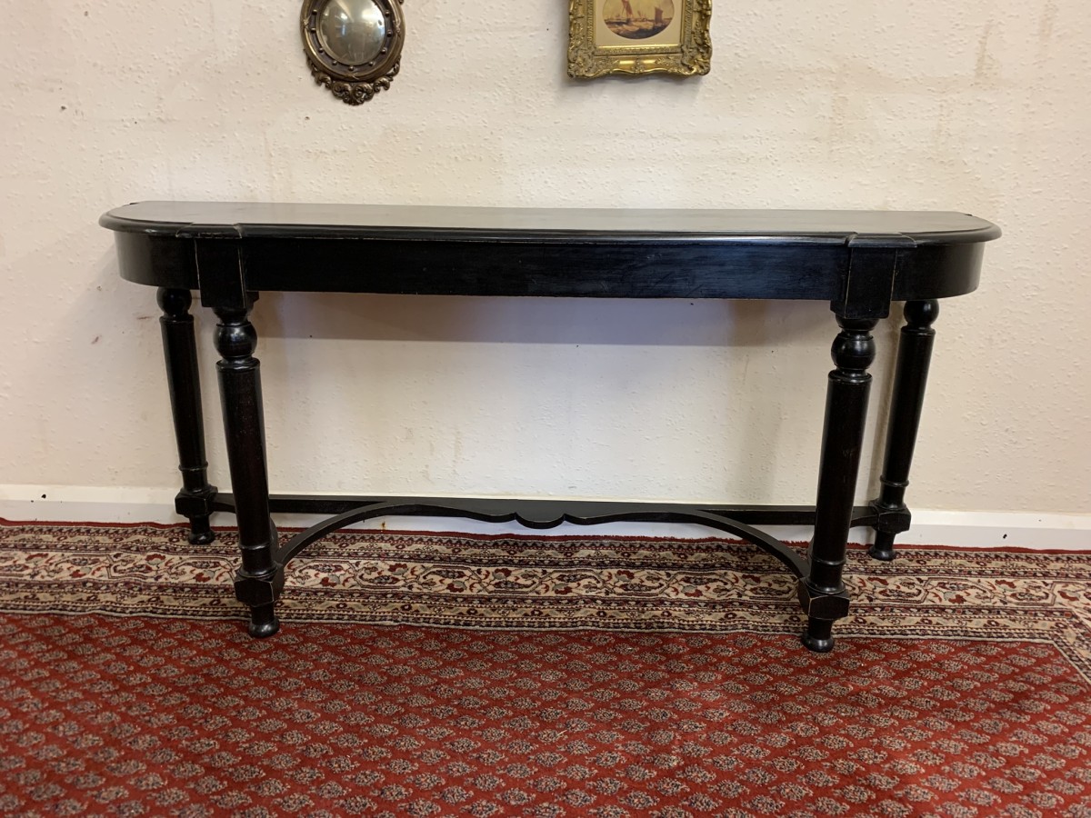 This stylish console has curved ends, four turned legs, shaped stretcher support and stands on turned feet.