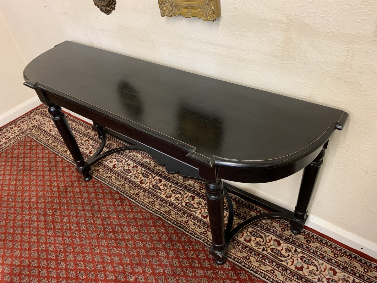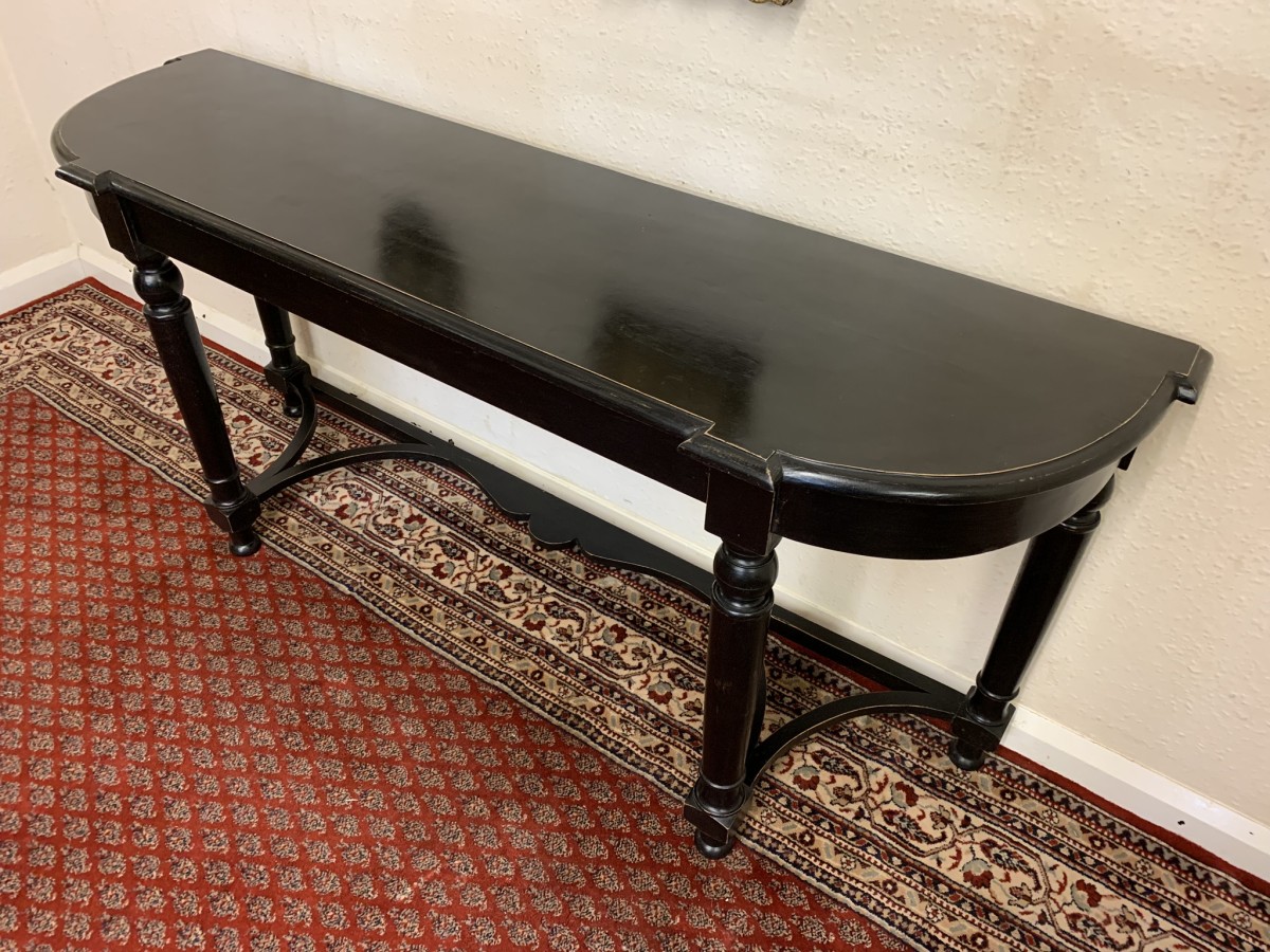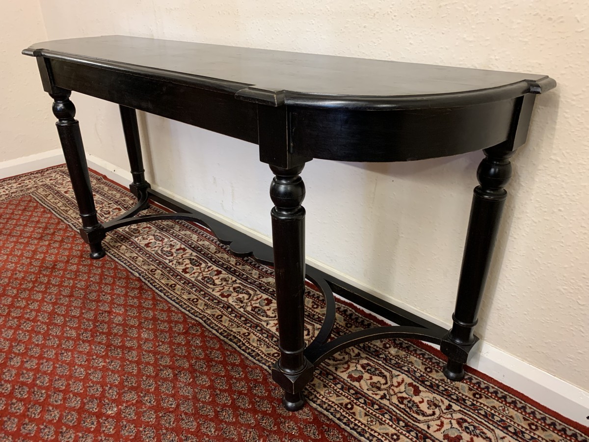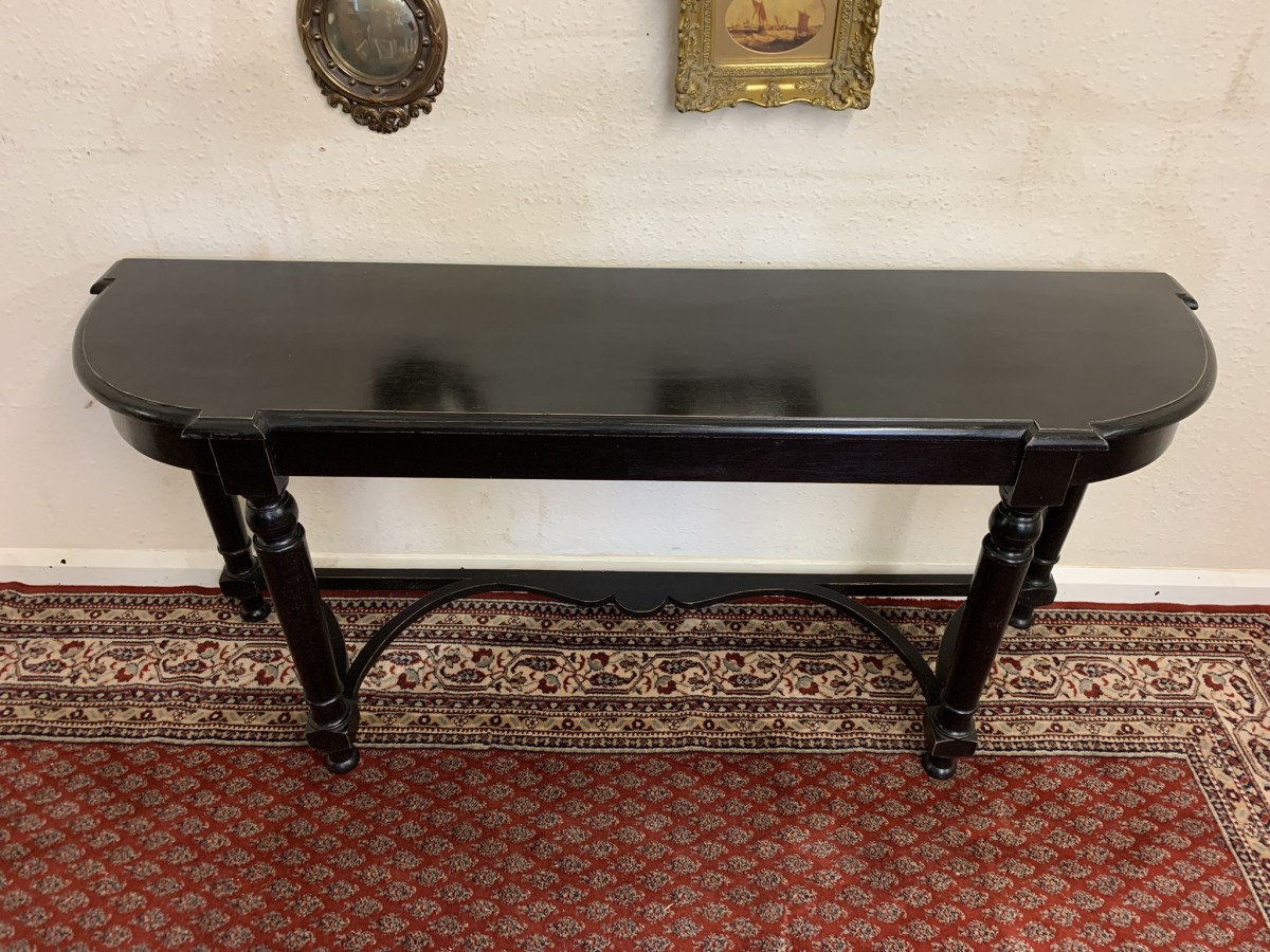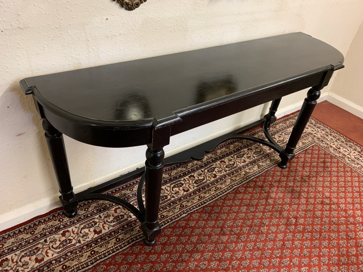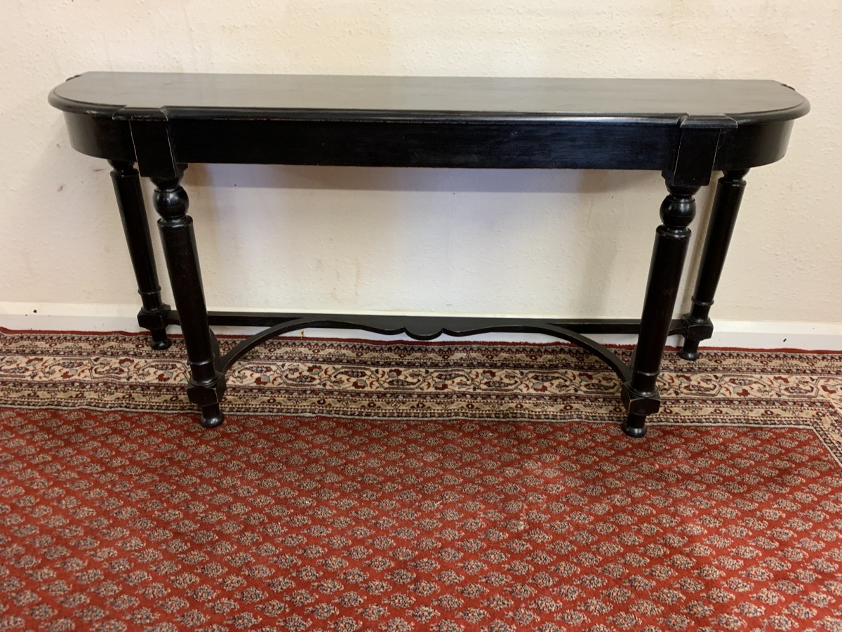 This stylish console has curved ends, four turned legs, shaped stretcher support and stands on turned feet.
