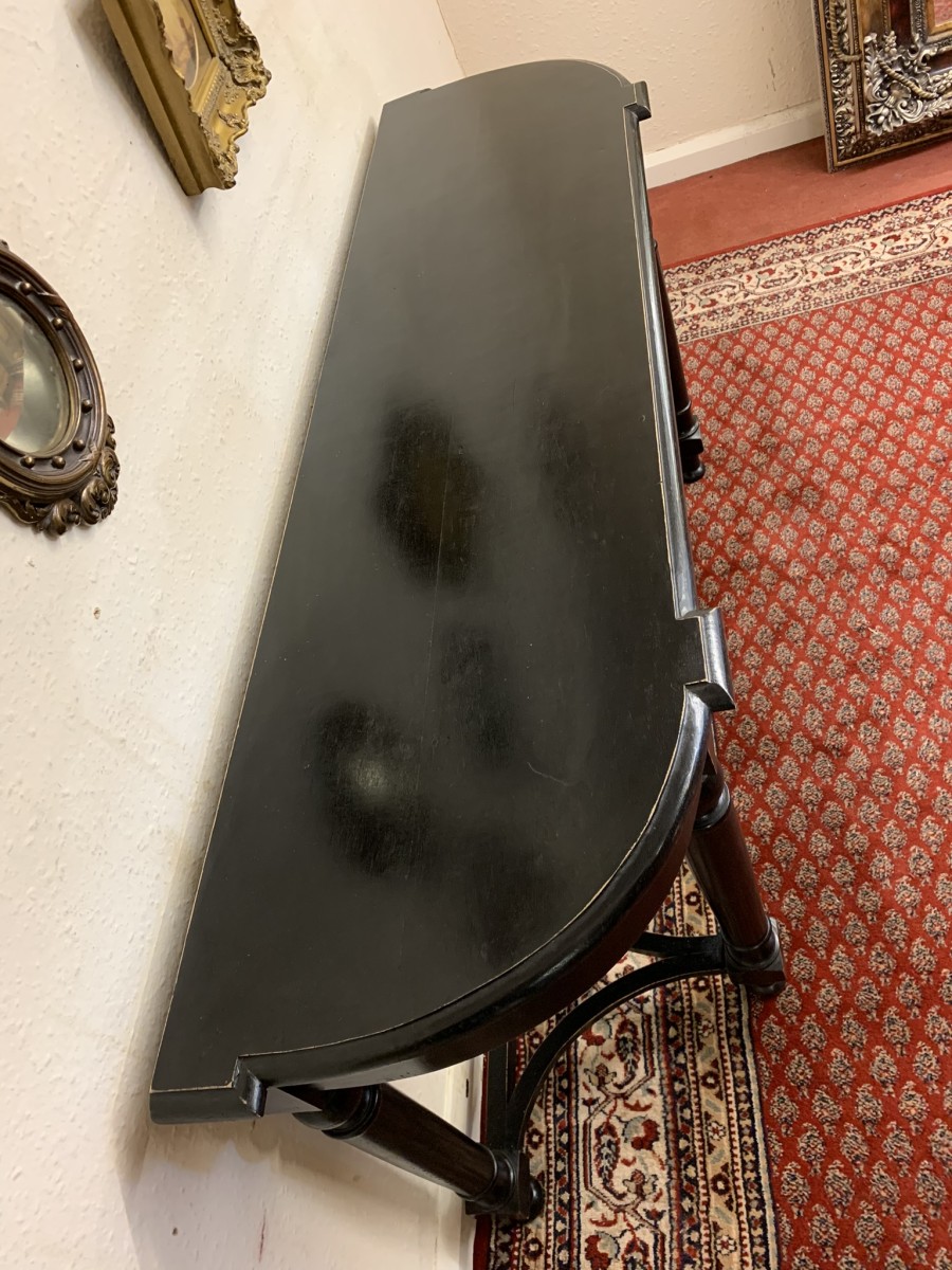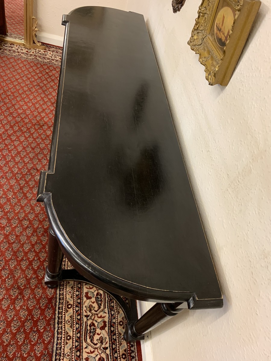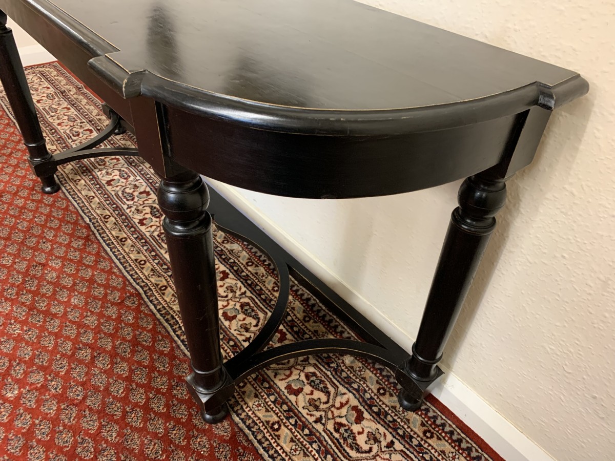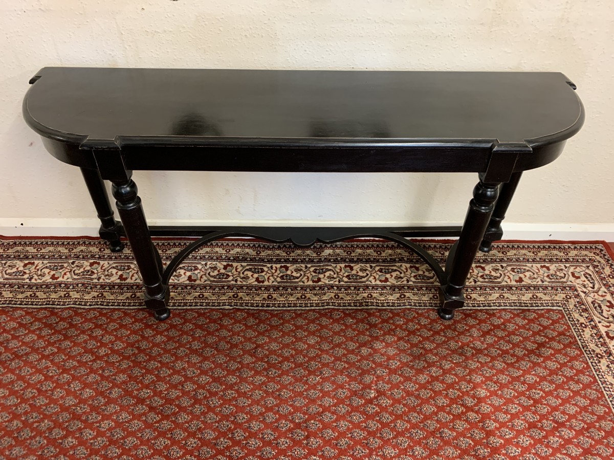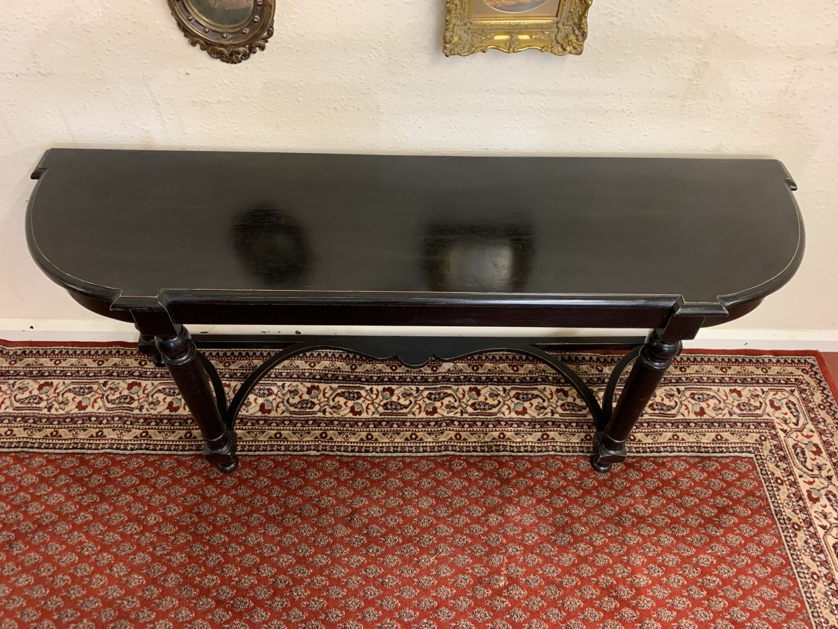 This stylish console has curved ends, four turned legs, shaped stretcher support and stands on turned feet.