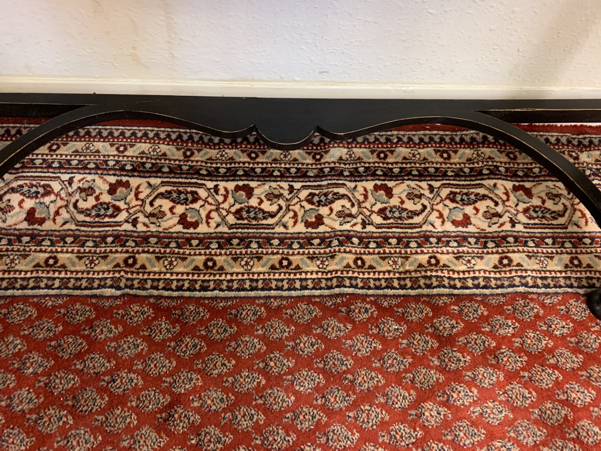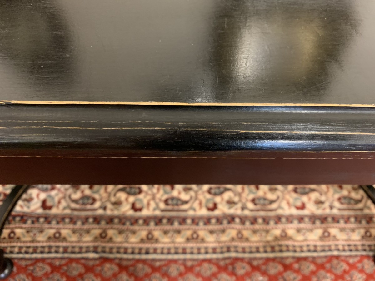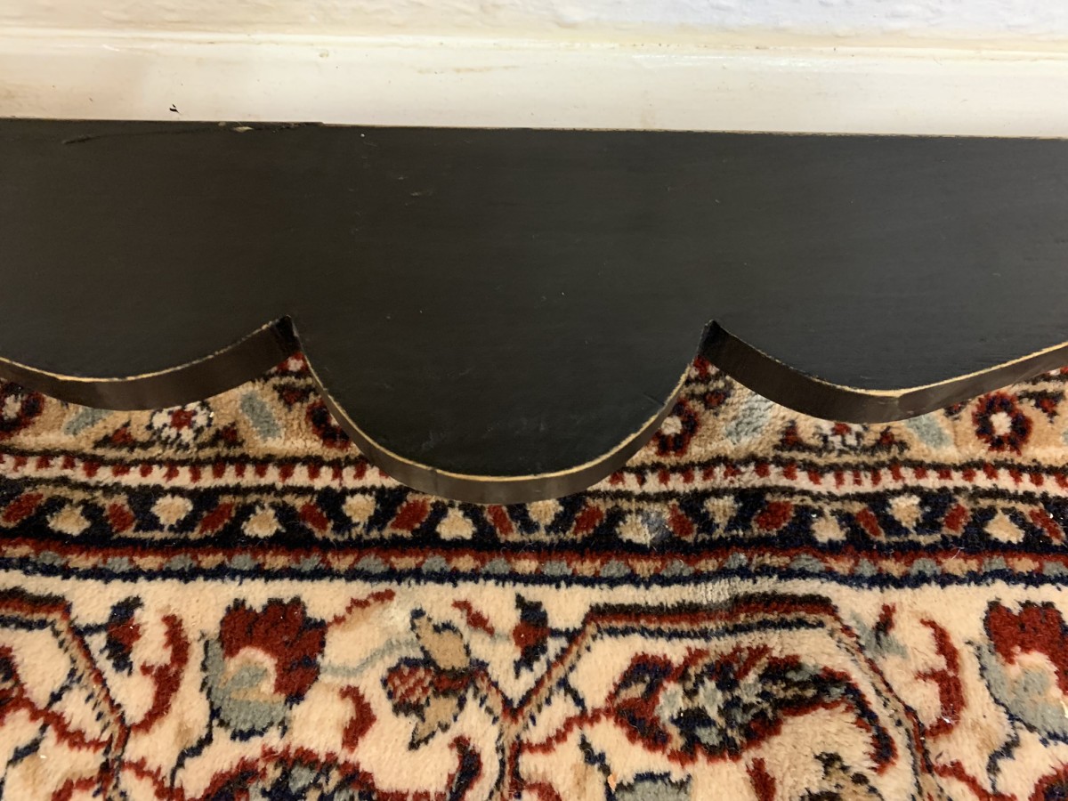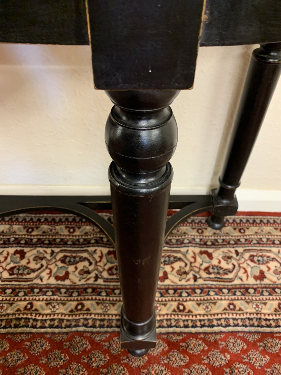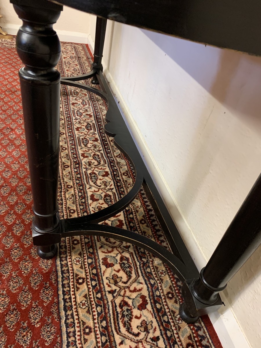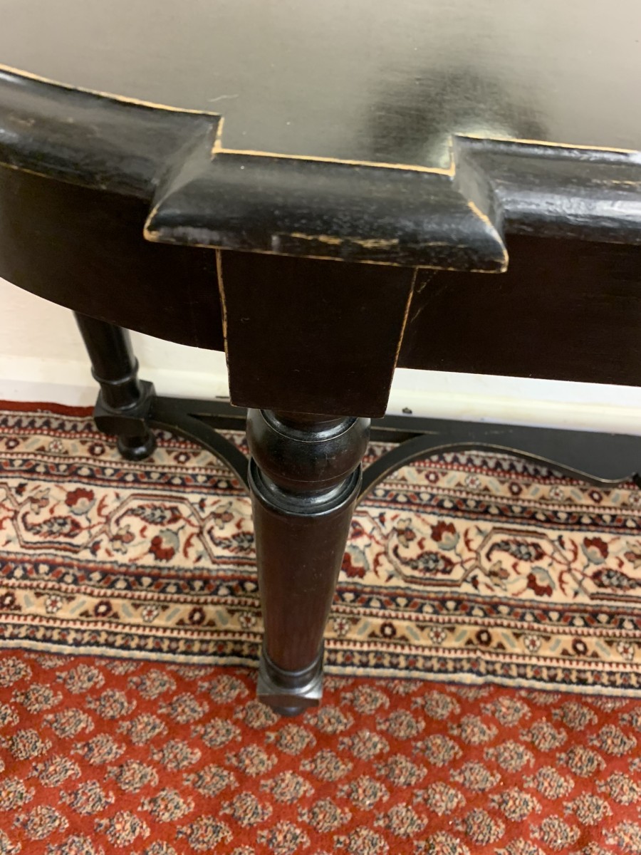 This stylish console has curved ends, four turned legs, shaped stretcher support and stands on turned feet.