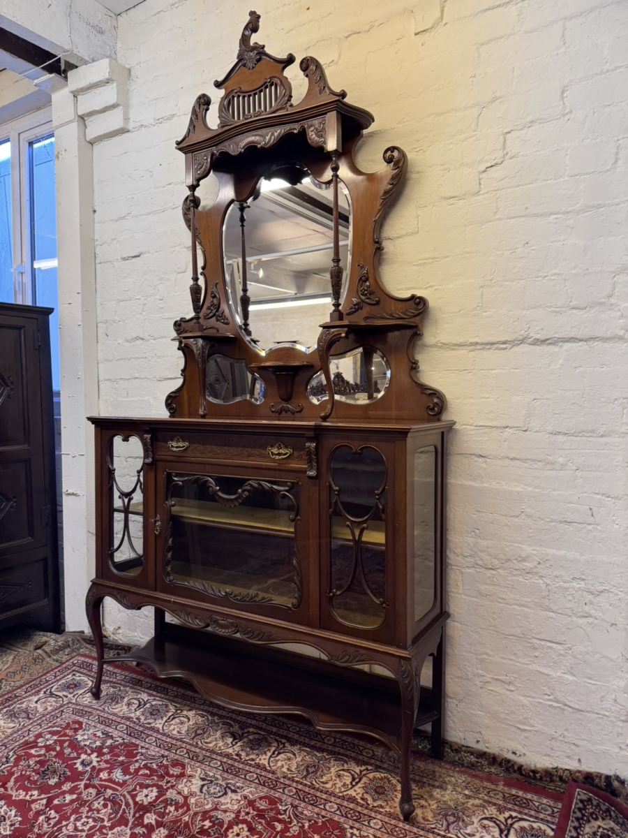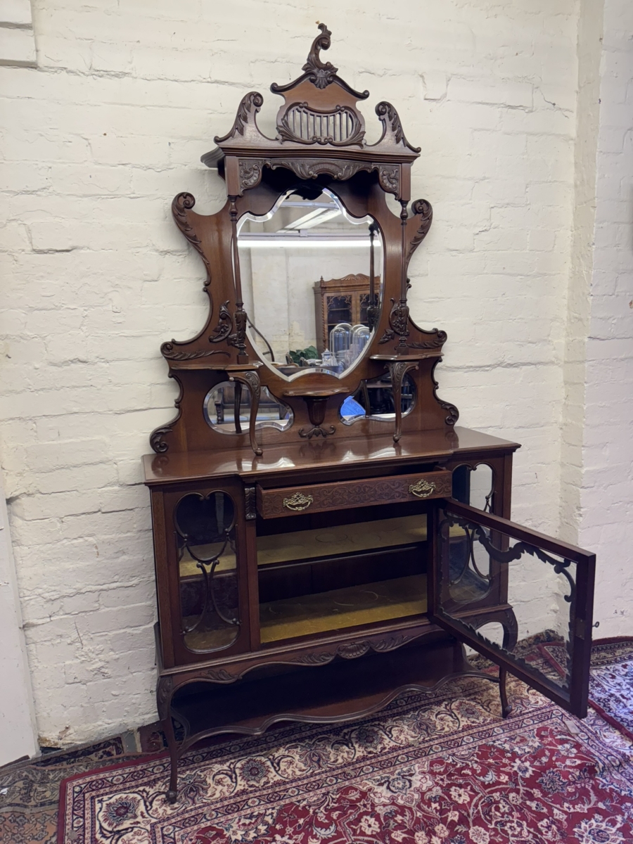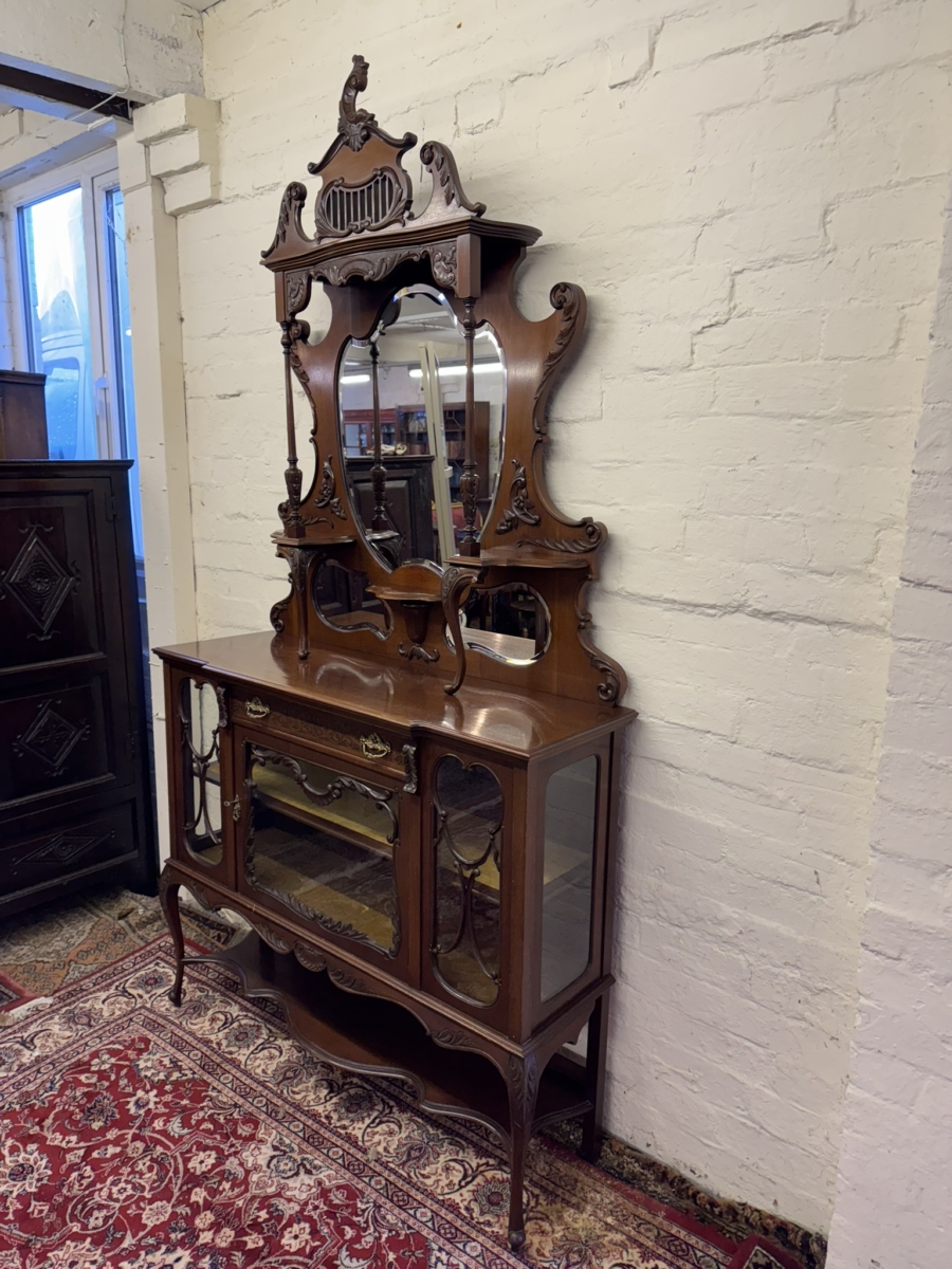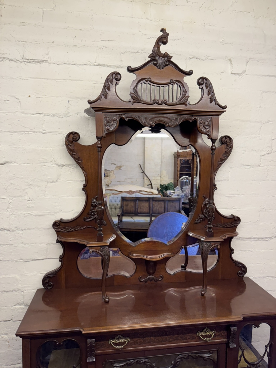 This elegant carved mahogany chiffonier dates circa 1900. The bevel edged shield shaped mirror is housed in an elaborate back. The base section has a carved drawer, lockable central glazed door with glazed panels to the sides, carved skirt, shaped shelf and standing on elegant carved cabriole shaped legs to the front.