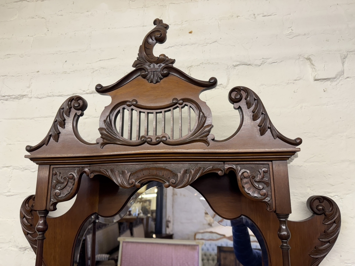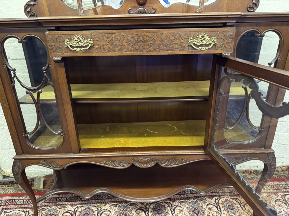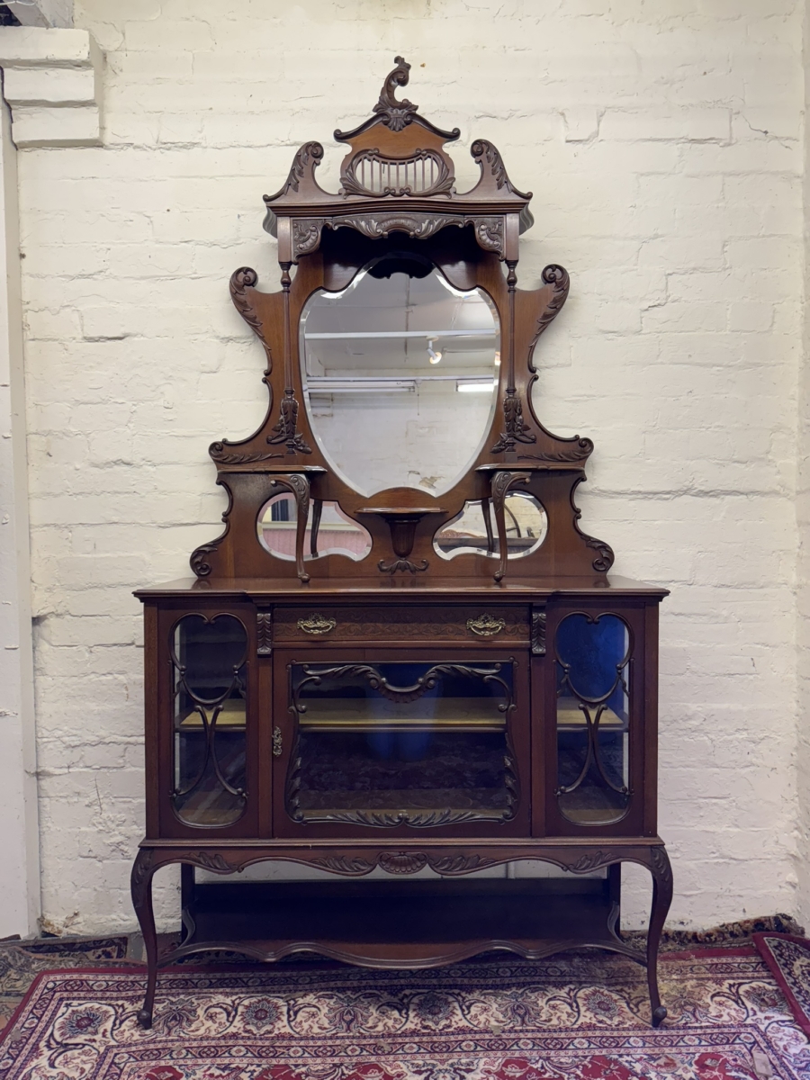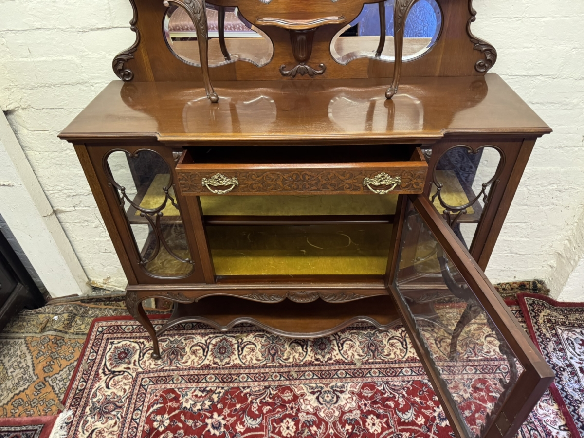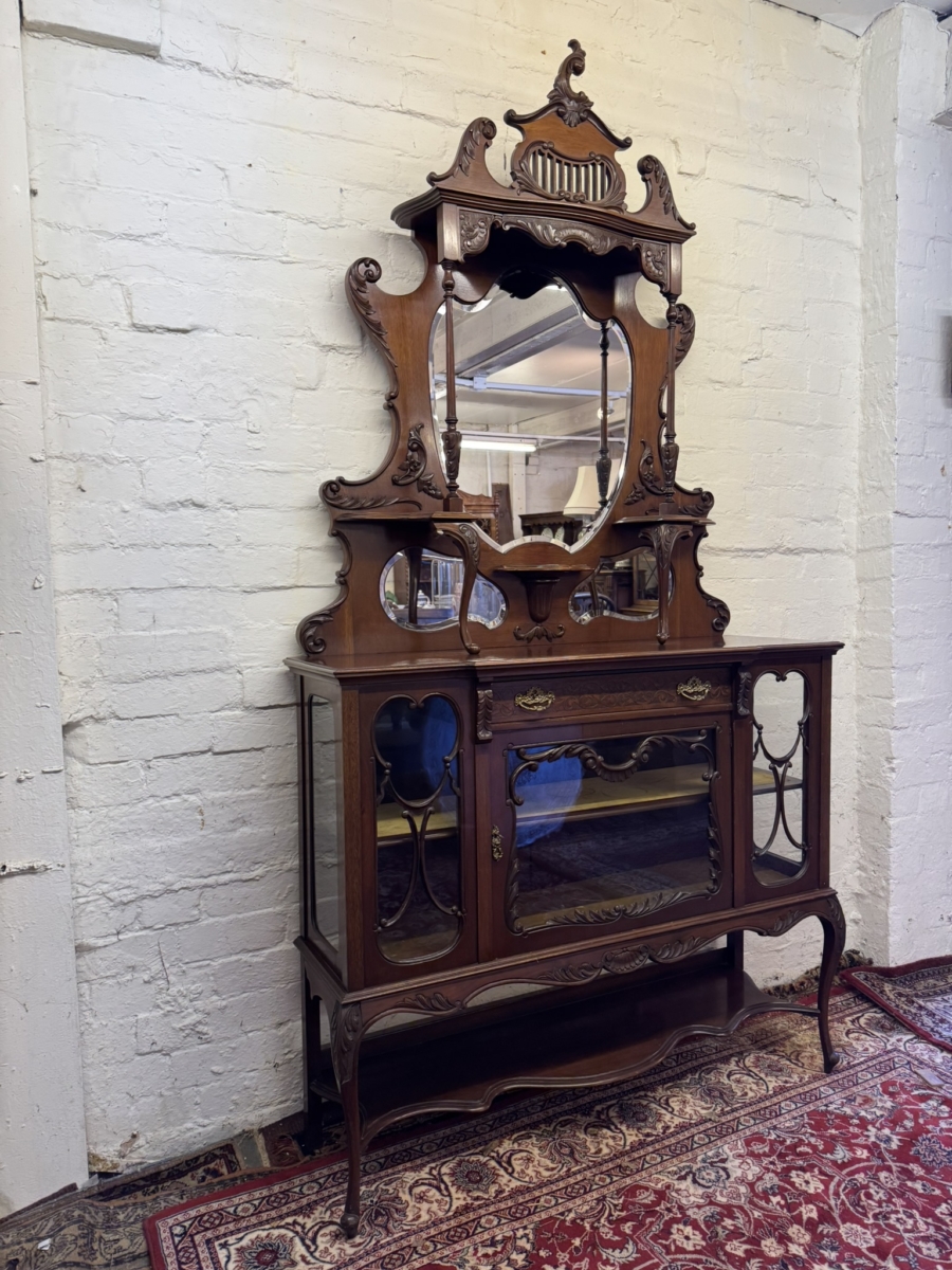 This elegant carved mahogany chiffonier dates circa 1900. The bevel edged shield shaped mirror is housed in an elaborate back. The base section has a carved drawer, lockable central glazed door with glazed panels to the sides, carved skirt, shaped shelf and standing on elegant carved cabriole shaped legs to the front.