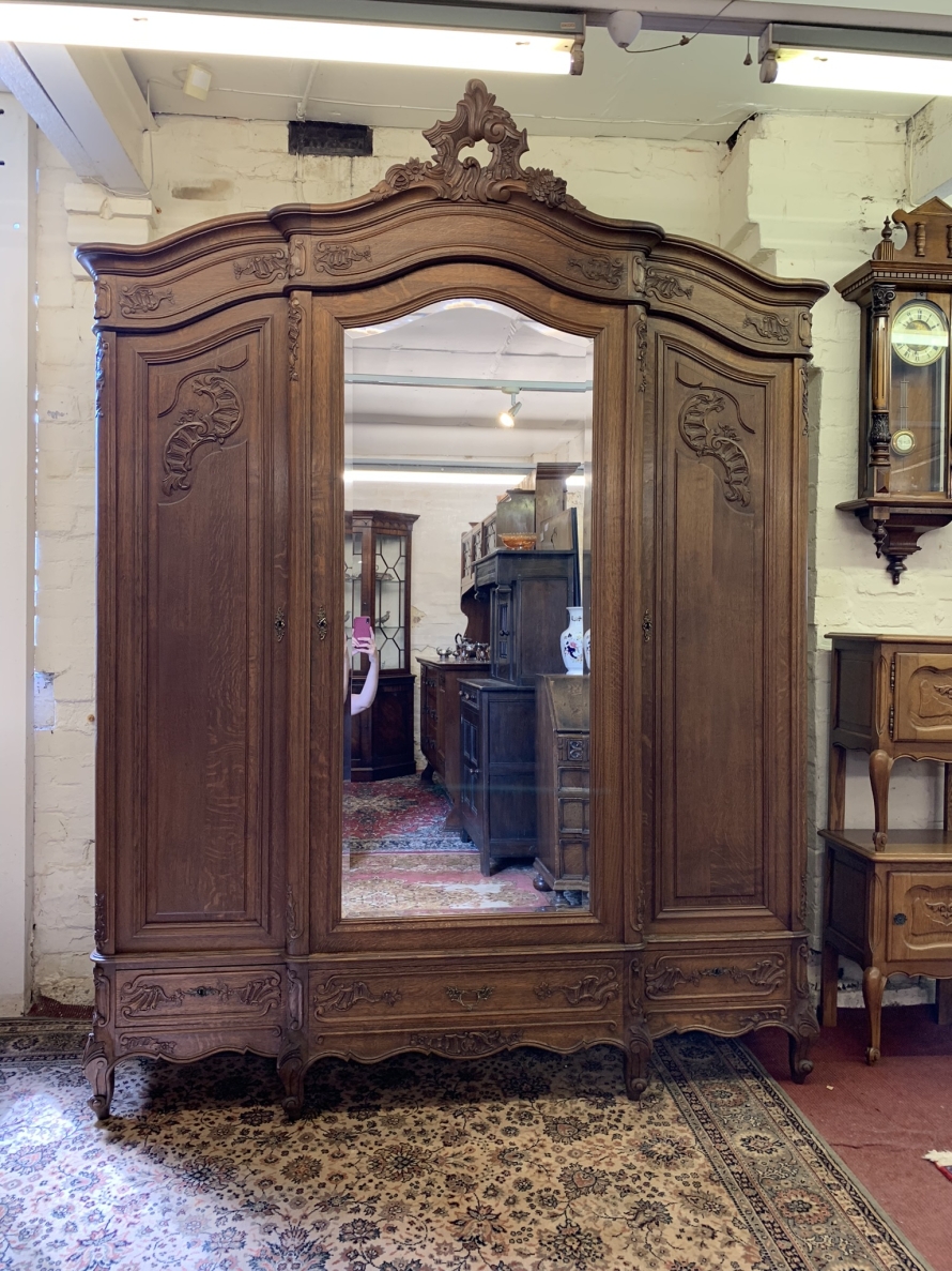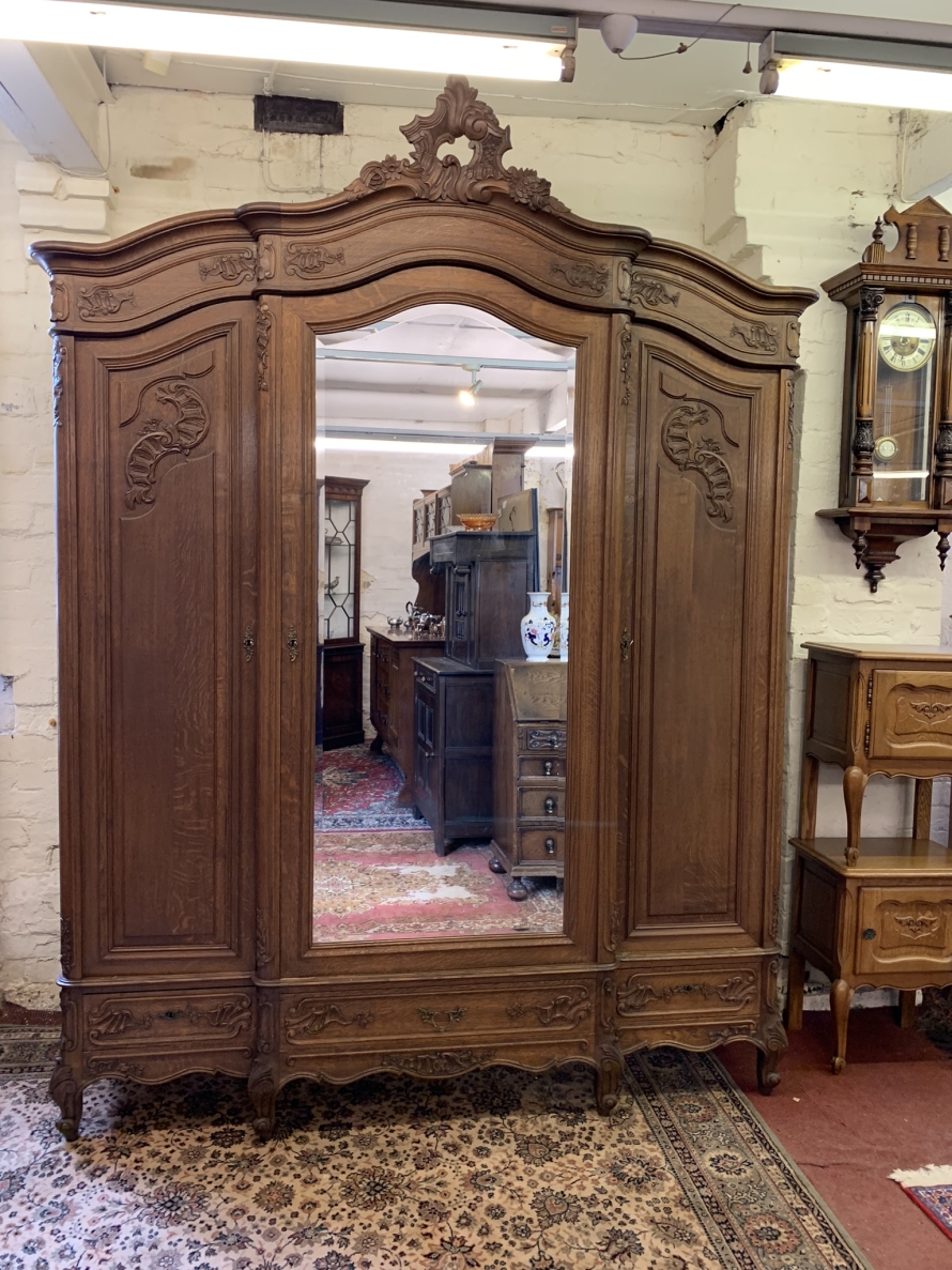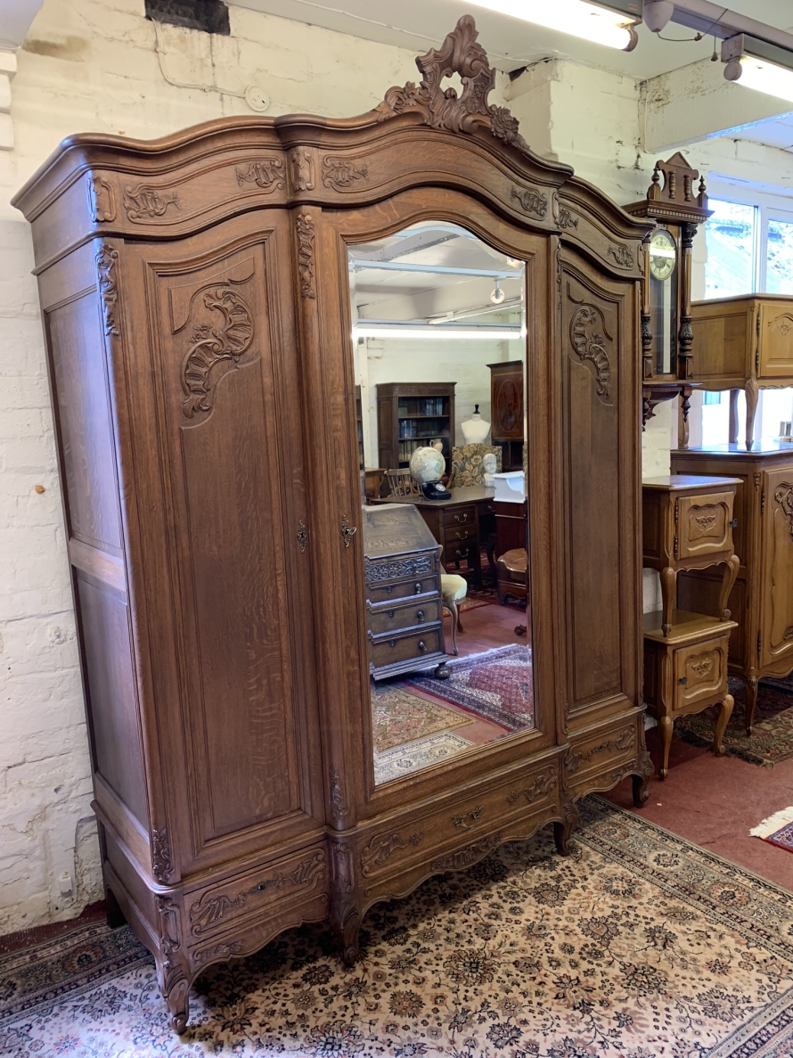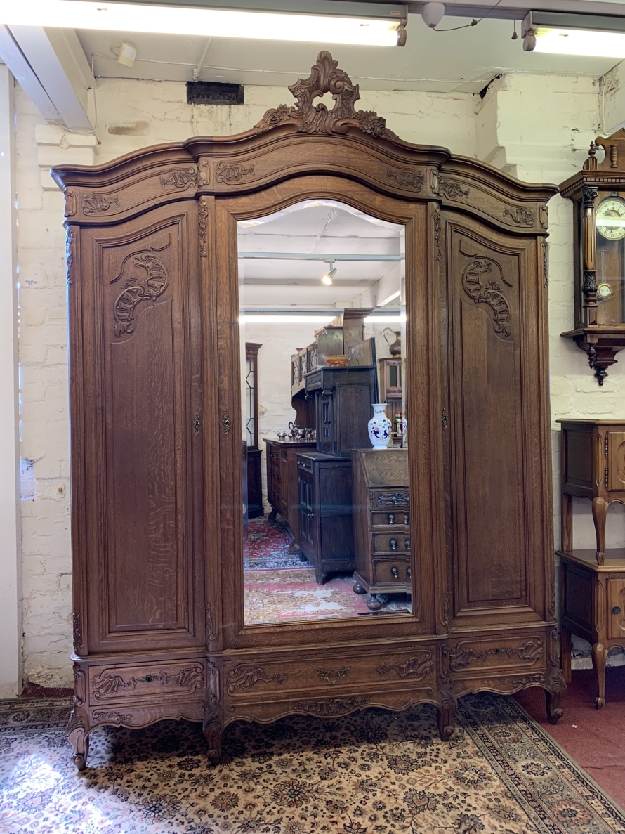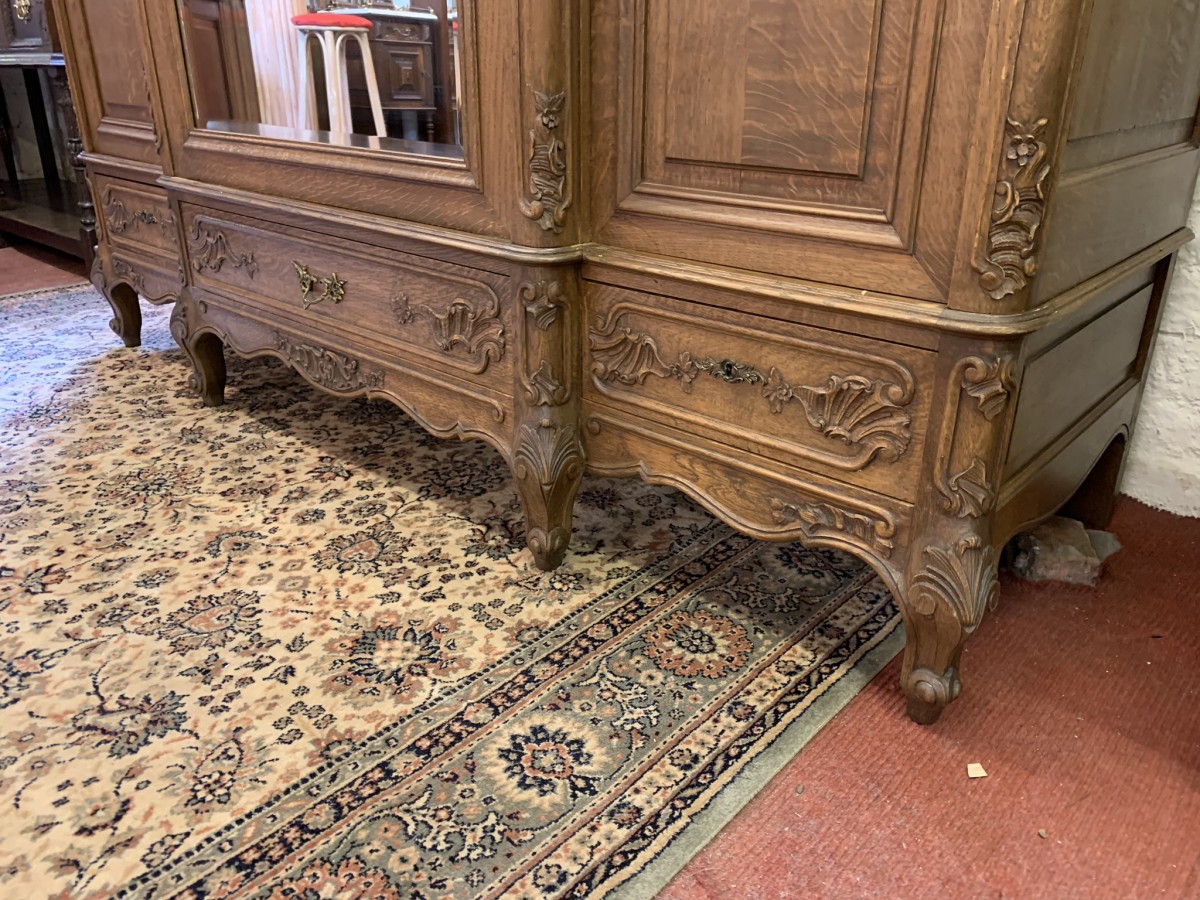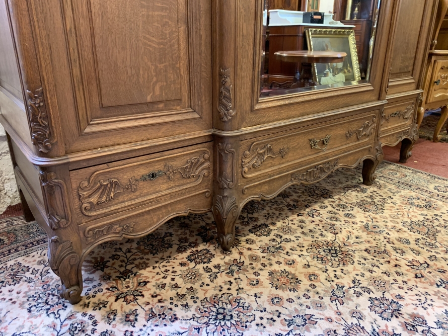 This outstanding quality oak armoire dates circa 1900. The shaped oversailing top rises to a fabulous central carving, below is a central brakefront lockable full length bevel edged mirrored door, the central brakefront door is flanked by a pair of lockable carved recessed panelled doors. The left-hand door opens to reveal a hanging rail and two brass hooks The central brakefront mirror door opens to reveal a metal hanging rail and three brass hooks. The right-hand door opens to reveal a hanging rail and two brass hooks. Below each door is a carved drawer. Recessed panelled sides, shaped carved skirt with central carving this stunning antique French armoire stands on four elegant carved cabriole legs to the front. Please note this armoire completely splits down for easy transportation and delivery into any home.