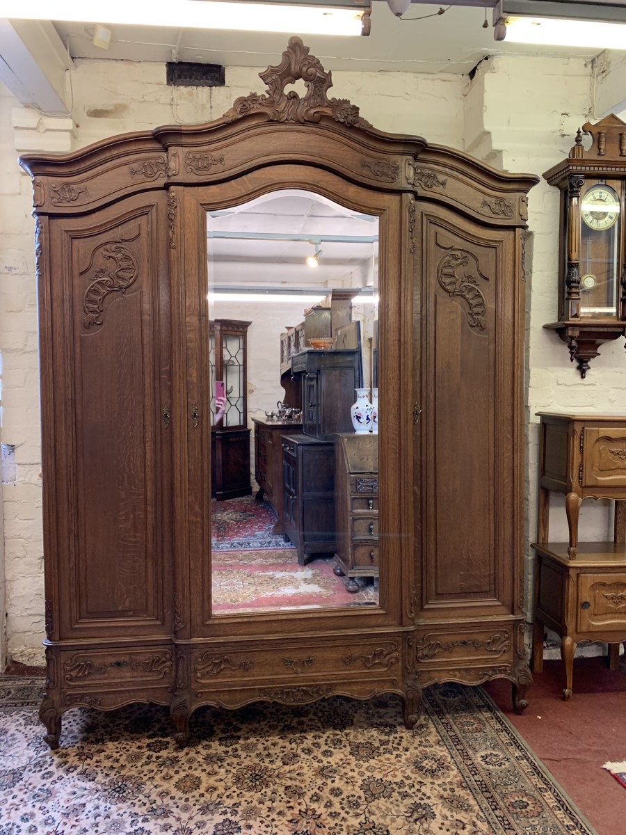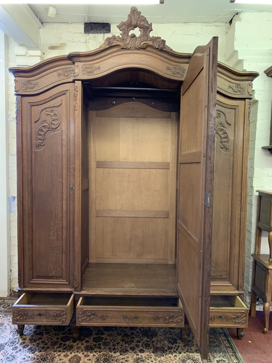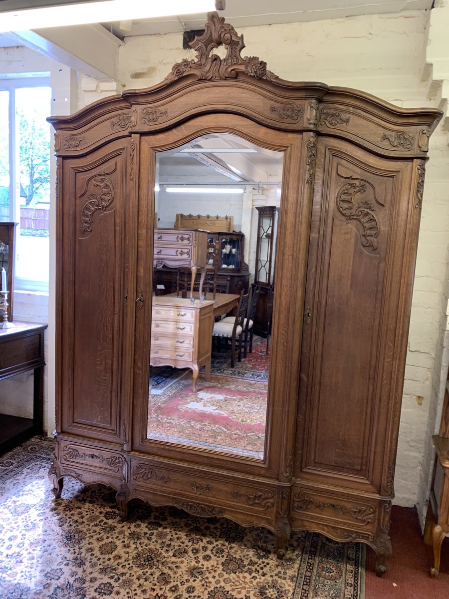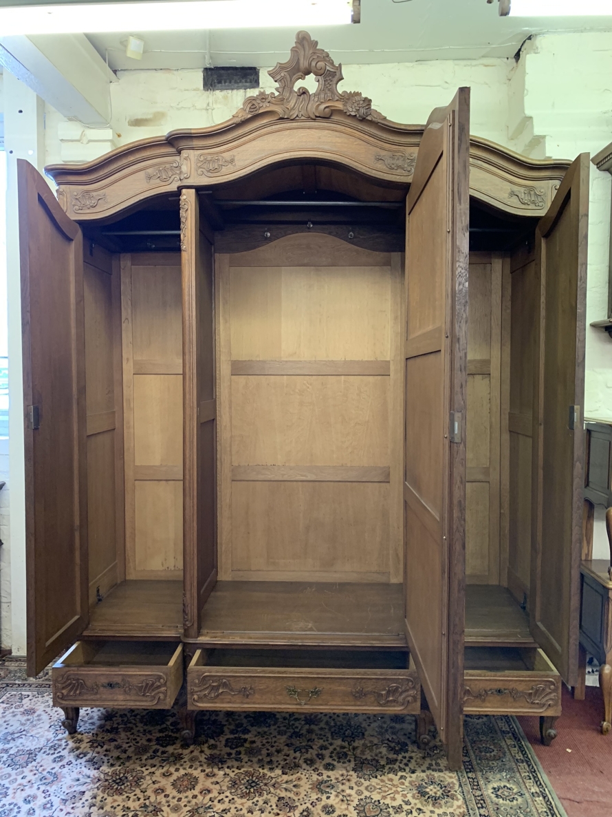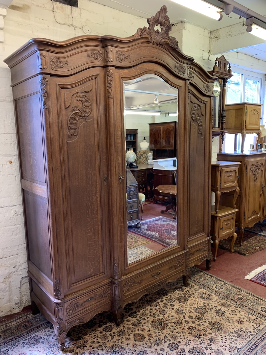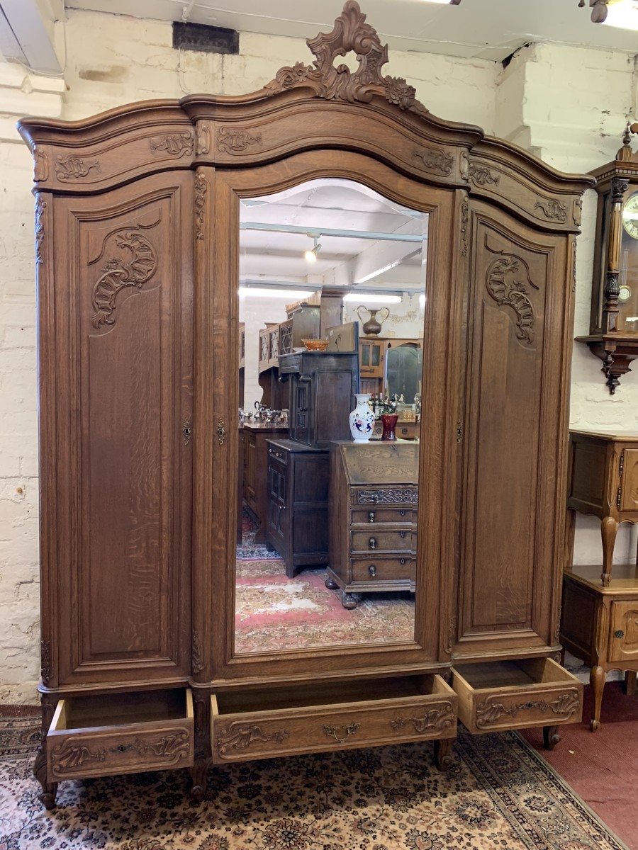 This outstanding quality oak armoire dates circa 1900. The shaped oversailing top rises to a fabulous central carving, below is a central brakefront lockable full length bevel edged mirrored door, the central brakefront door is flanked by a pair of lockable carved recessed panelled doors. The left-hand door opens to reveal a hanging rail and two brass hooks The central brakefront mirror door opens to reveal a metal hanging rail and three brass hooks. The right-hand door opens to reveal a hanging rail and two brass hooks. Below each door is a carved drawer. Recessed panelled sides, shaped carved skirt with central carving this stunning antique French armoire stands on four elegant carved cabriole legs to the front. Please note this armoire completely splits down for easy transportation and delivery into any home.