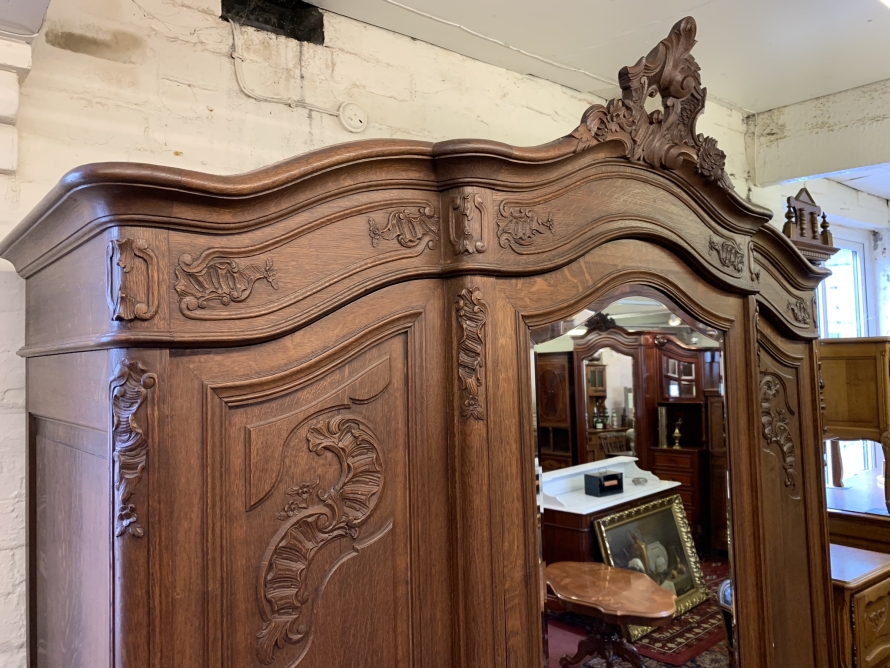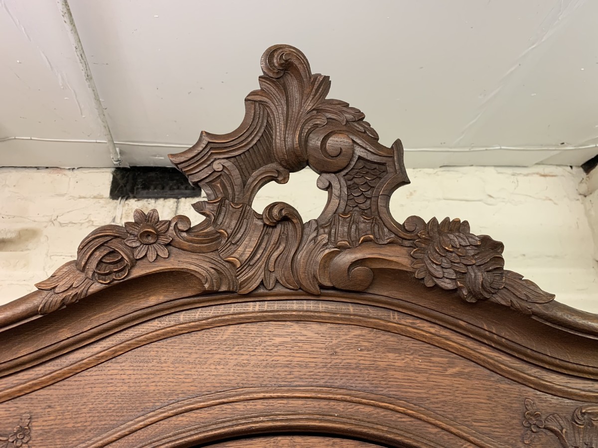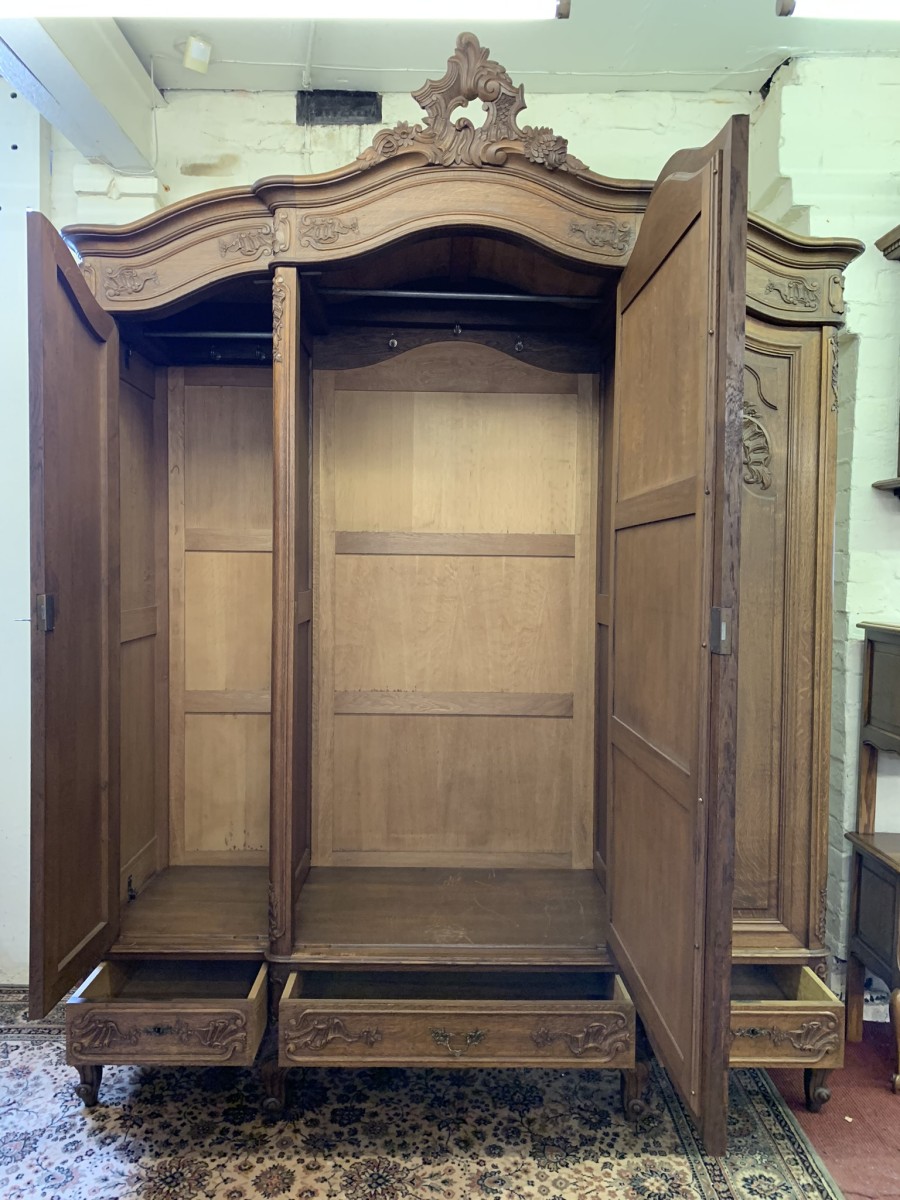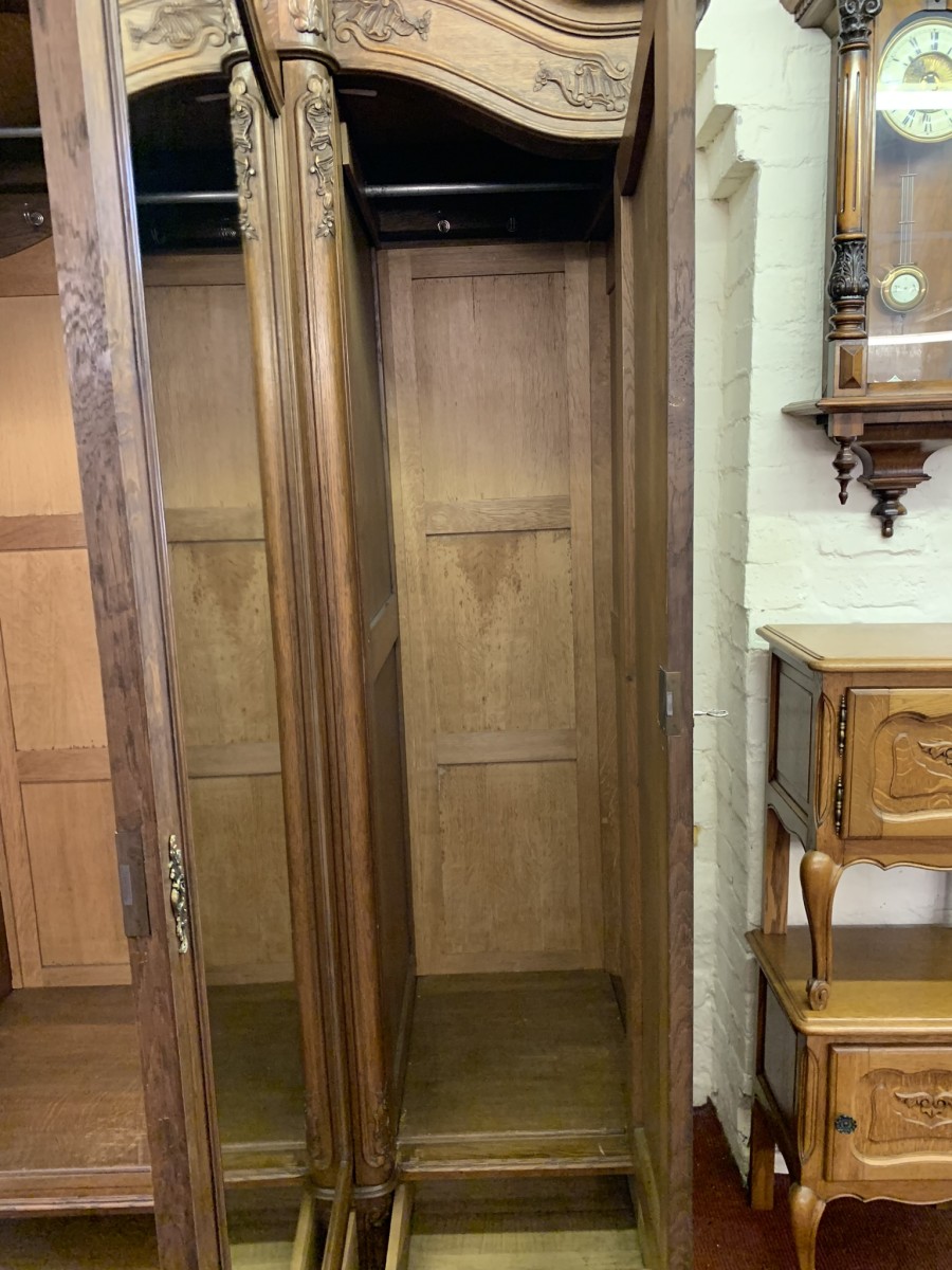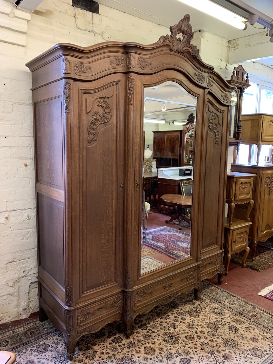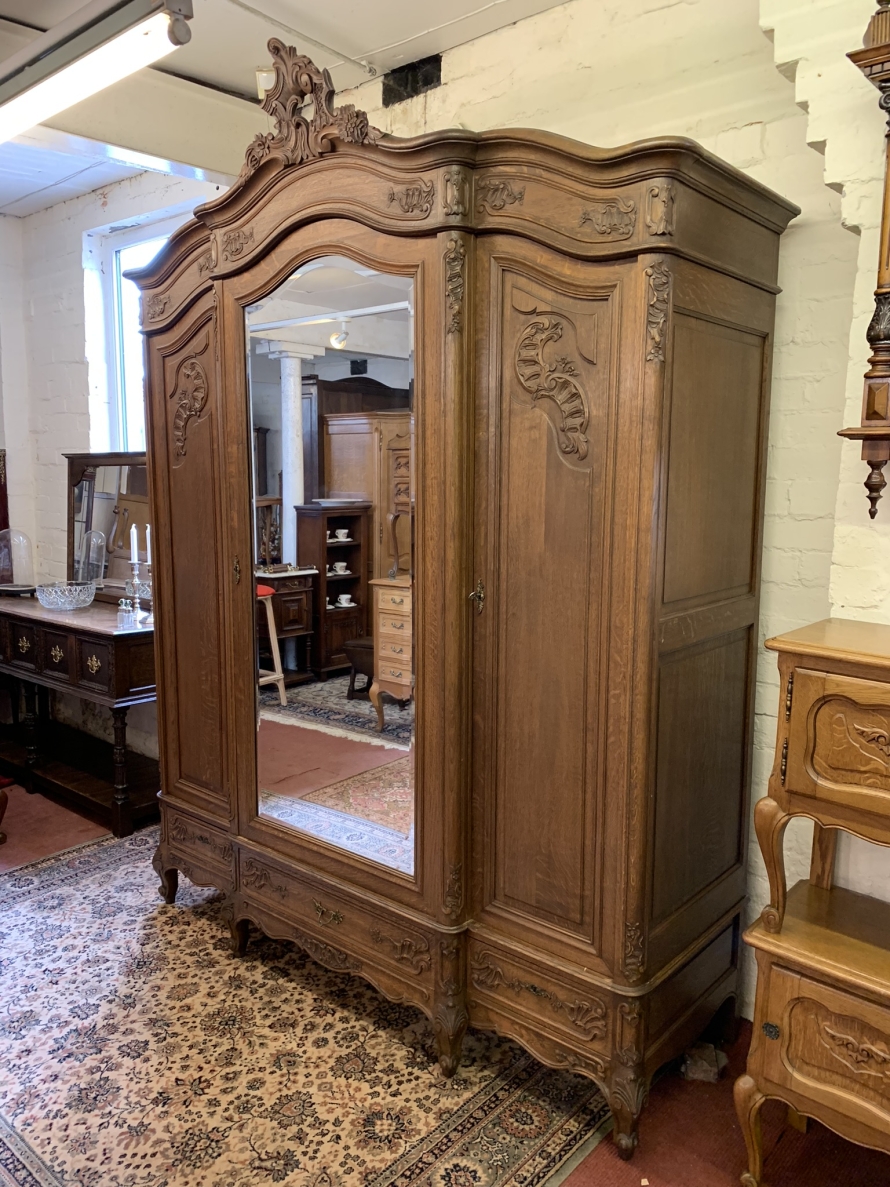 This outstanding quality oak armoire dates circa 1900. The shaped oversailing top rises to a fabulous central carving, below is a central brakefront lockable full length bevel edged mirrored door, the central brakefront door is flanked by a pair of lockable carved recessed panelled doors. The left-hand door opens to reveal a hanging rail and two brass hooks The central brakefront mirror door opens to reveal a metal hanging rail and three brass hooks. The right-hand door opens to reveal a hanging rail and two brass hooks. Below each door is a carved drawer. Recessed panelled sides, shaped carved skirt with central carving this stunning antique French armoire stands on four elegant carved cabriole legs to the front. Please note this armoire completely splits down for easy transportation and delivery into any home.