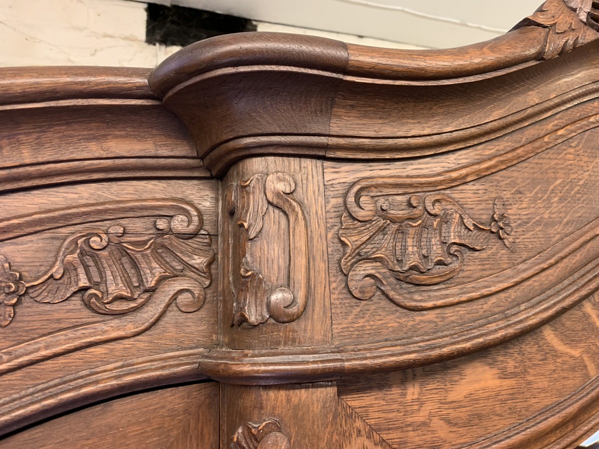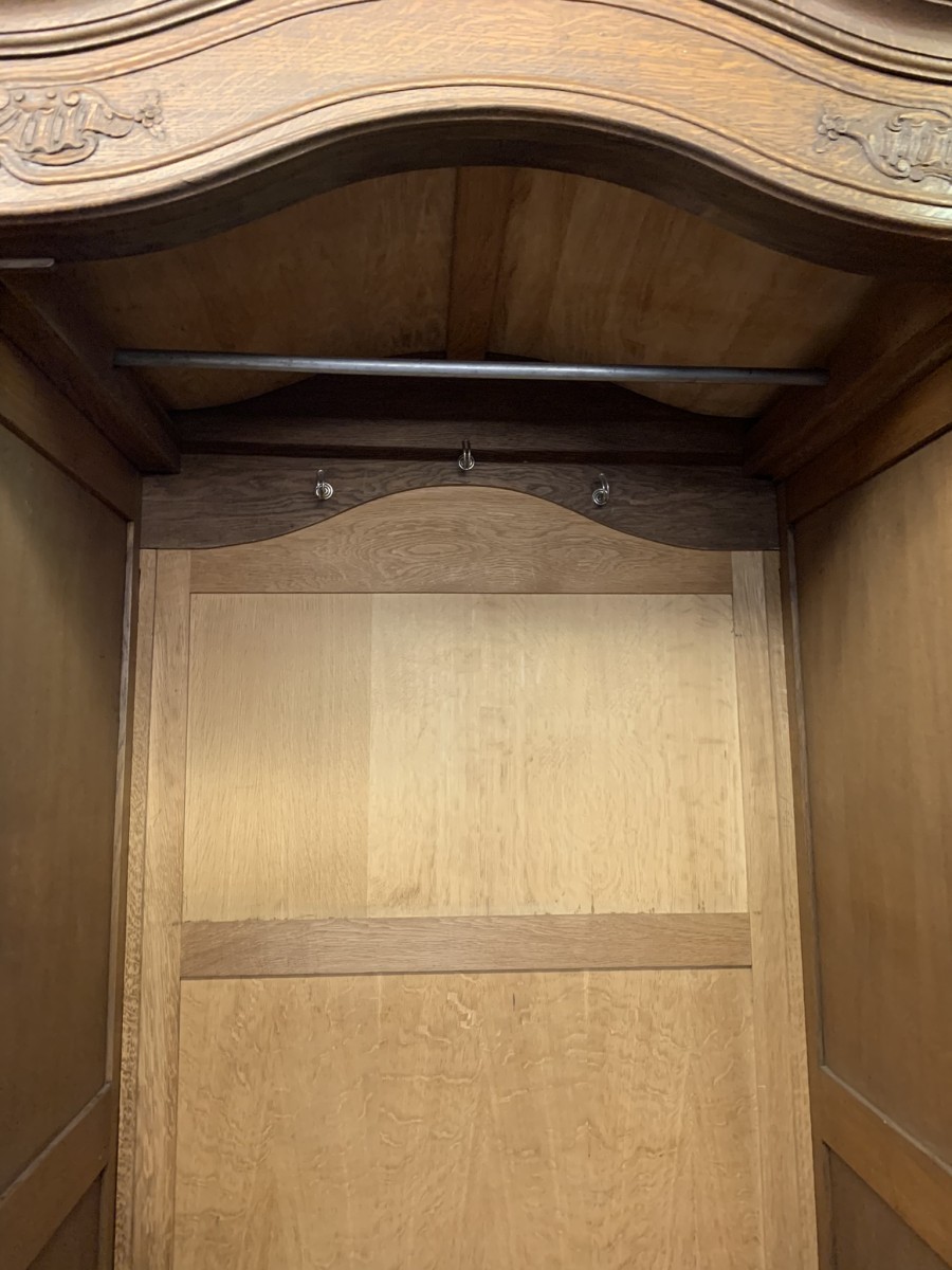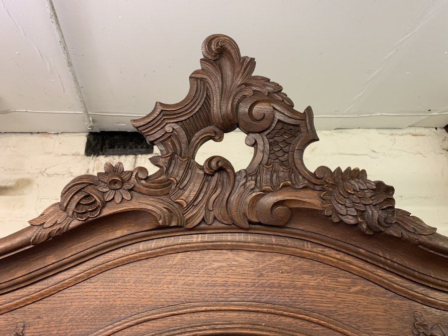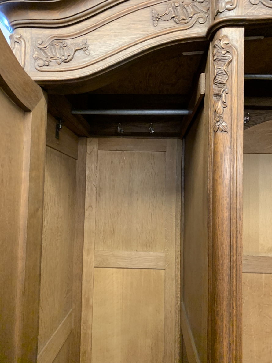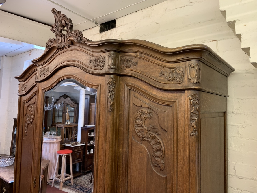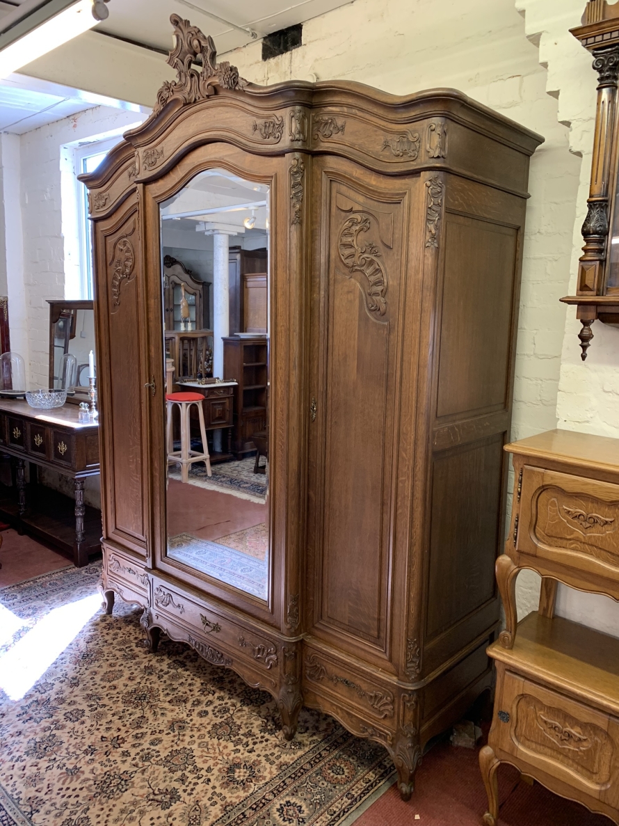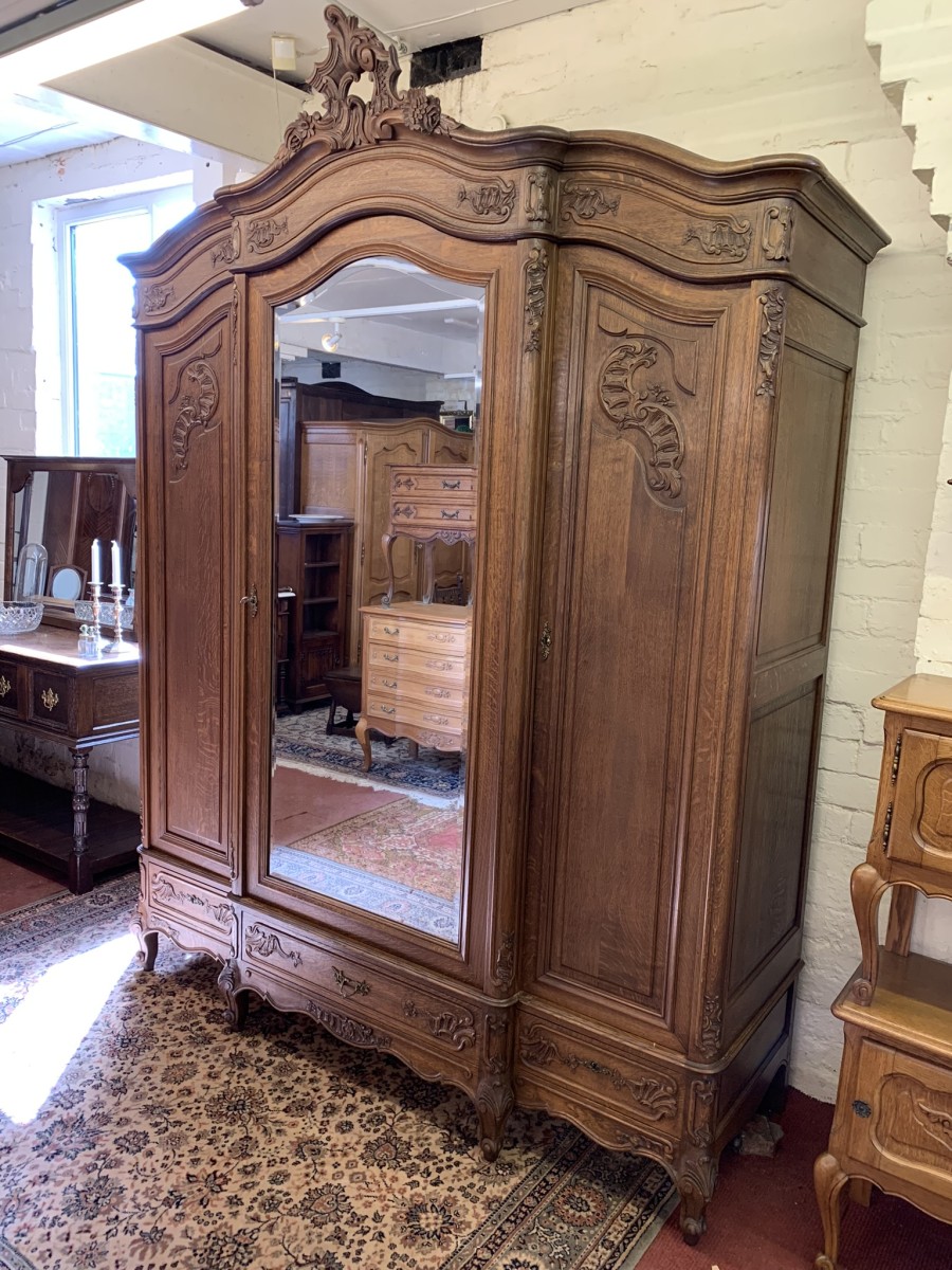 This outstanding quality oak armoire dates circa 1900. The shaped oversailing top rises to a fabulous central carving, below is a central brakefront lockable full length bevel edged mirrored door, the central brakefront door is flanked by a pair of lockable carved recessed panelled doors. The left-hand door opens to reveal a hanging rail and two brass hooks The central brakefront mirror door opens to reveal a metal hanging rail and three brass hooks. The right-hand door opens to reveal a hanging rail and two brass hooks. Below each door is a carved drawer. Recessed panelled sides, shaped carved skirt with central carving this stunning antique French armoire stands on four elegant carved cabriole legs to the front. Please note this armoire completely splits down for easy transportation and delivery into any home.