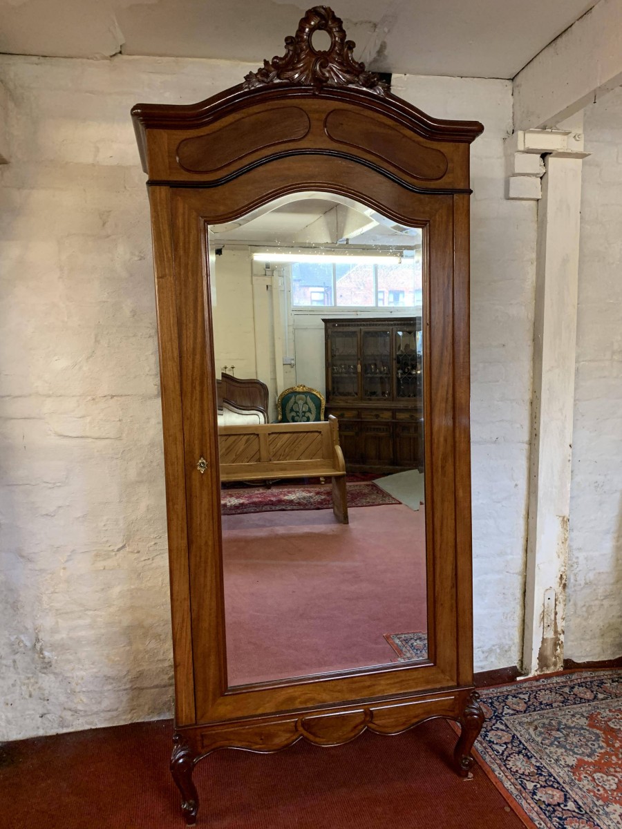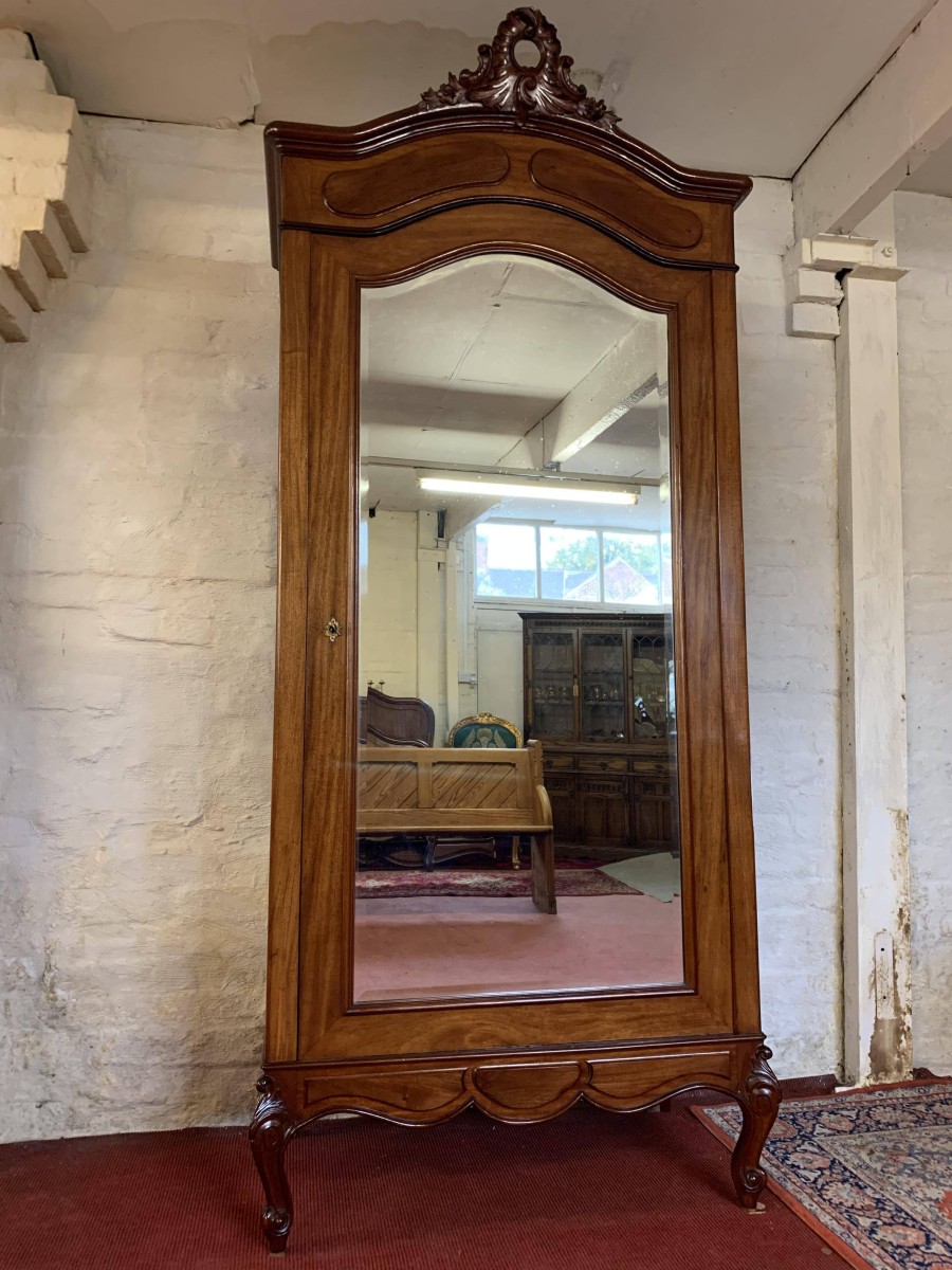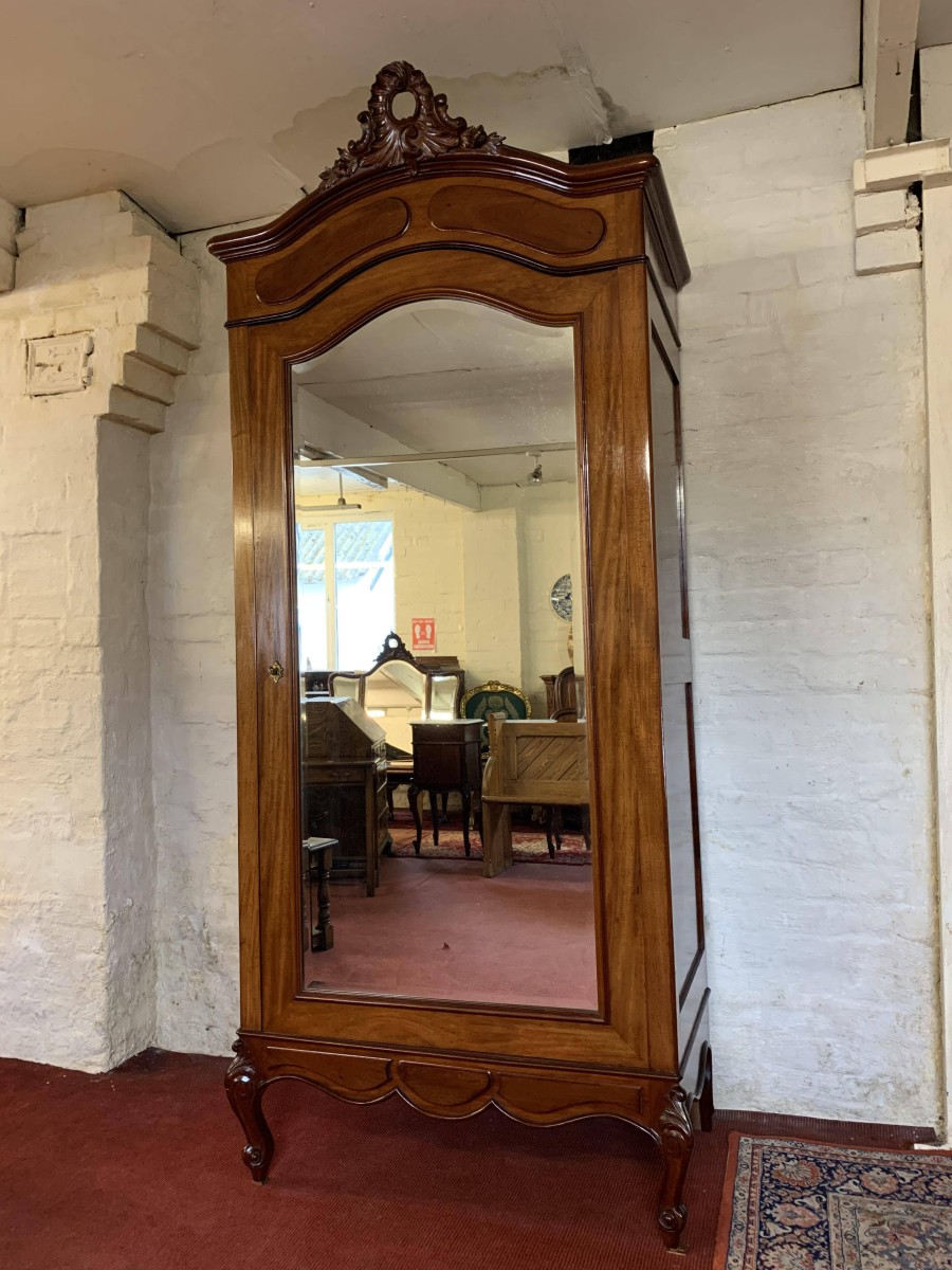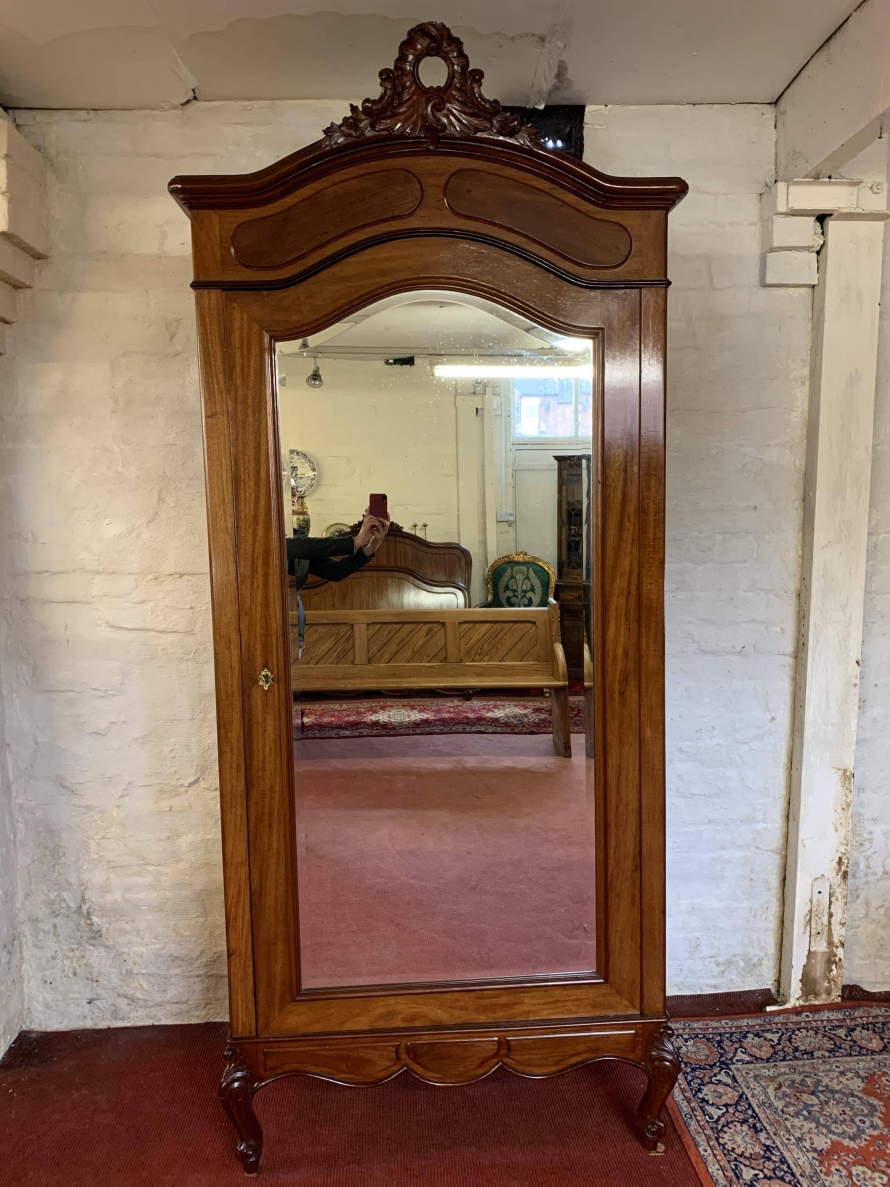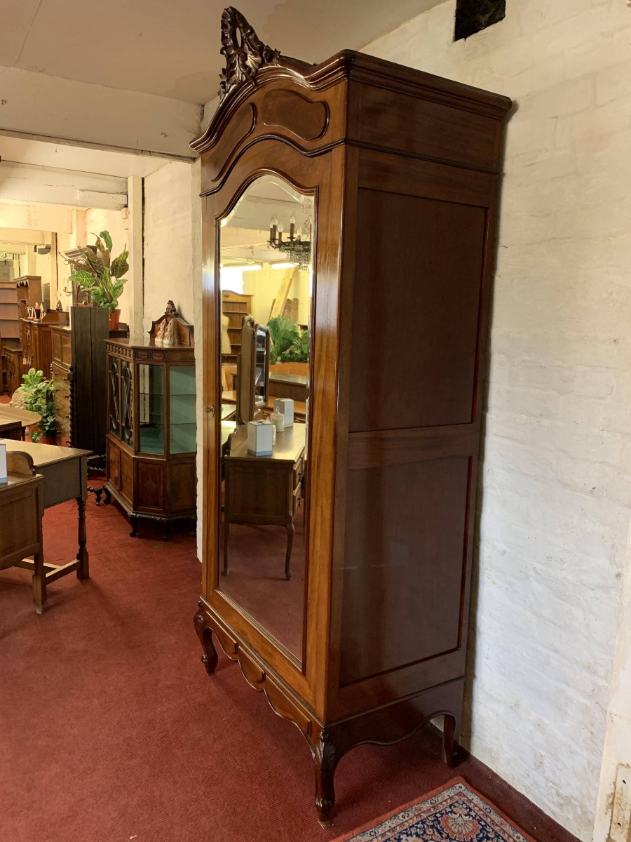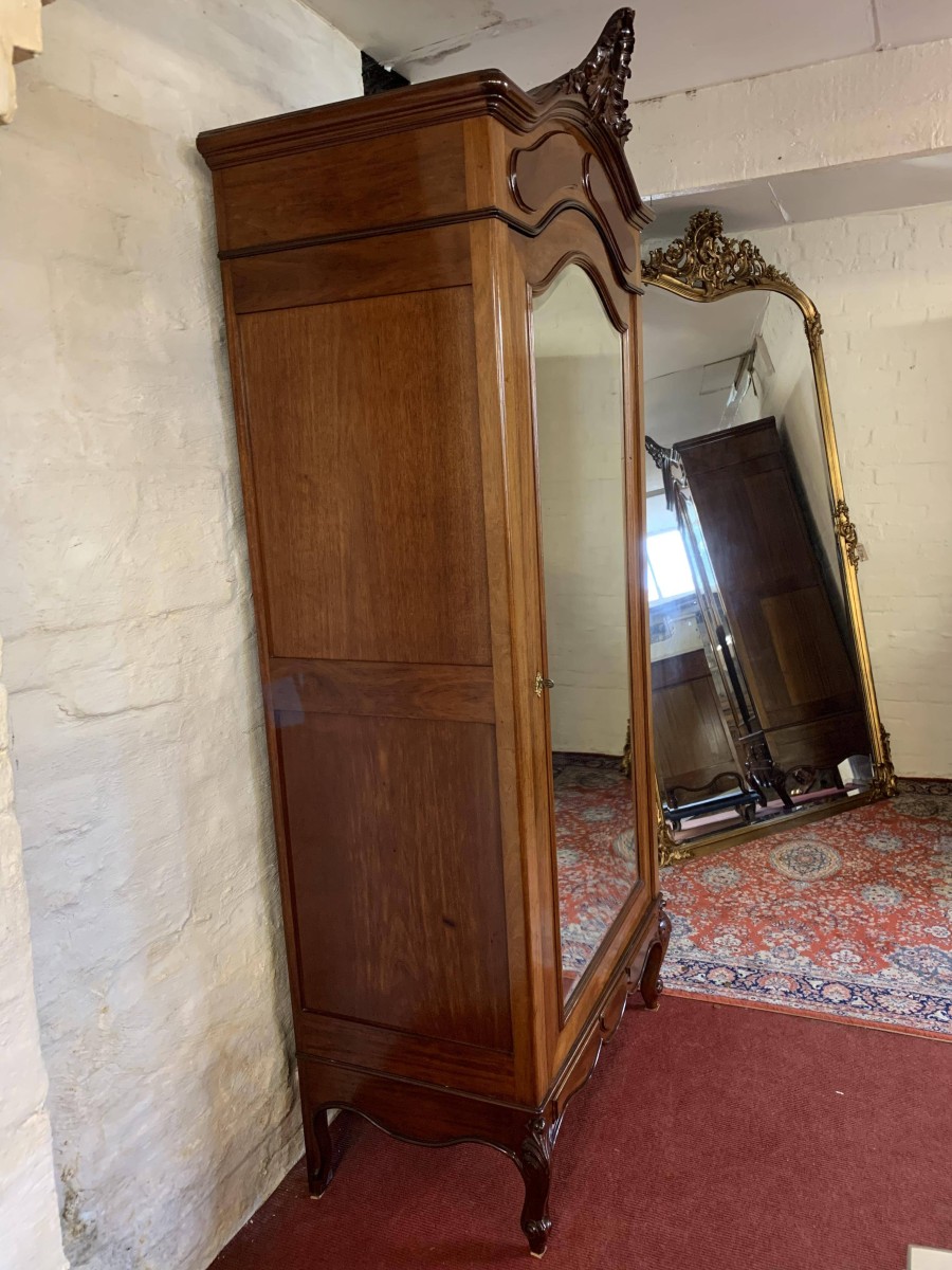A beautiful French armoire dating circa 1880 which is in fantastic condition. The shaped oversailing top rises to a impressive central carving. Below is a full length bevelled mirrored lockable door, the door opens to reveal three adjustable and removable storage shelves and a drawer to the base. Recessed panelled sides, shaped skirt, this outstanding quality armoire stands on two carved shaped cabriole legs to the front. Please note this armoire splits down for easy transportation and delivery into any home. We are also listing a matching double mirrored door armoire, a pair of marble top bedside cabinets, shaped carved double bed and a triple mirrored marble top dressing chest.