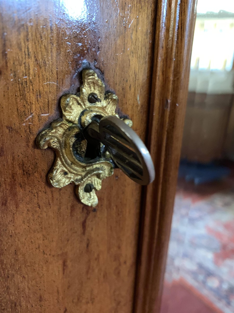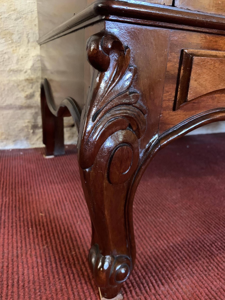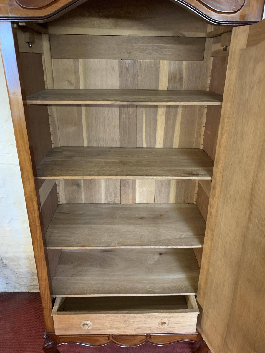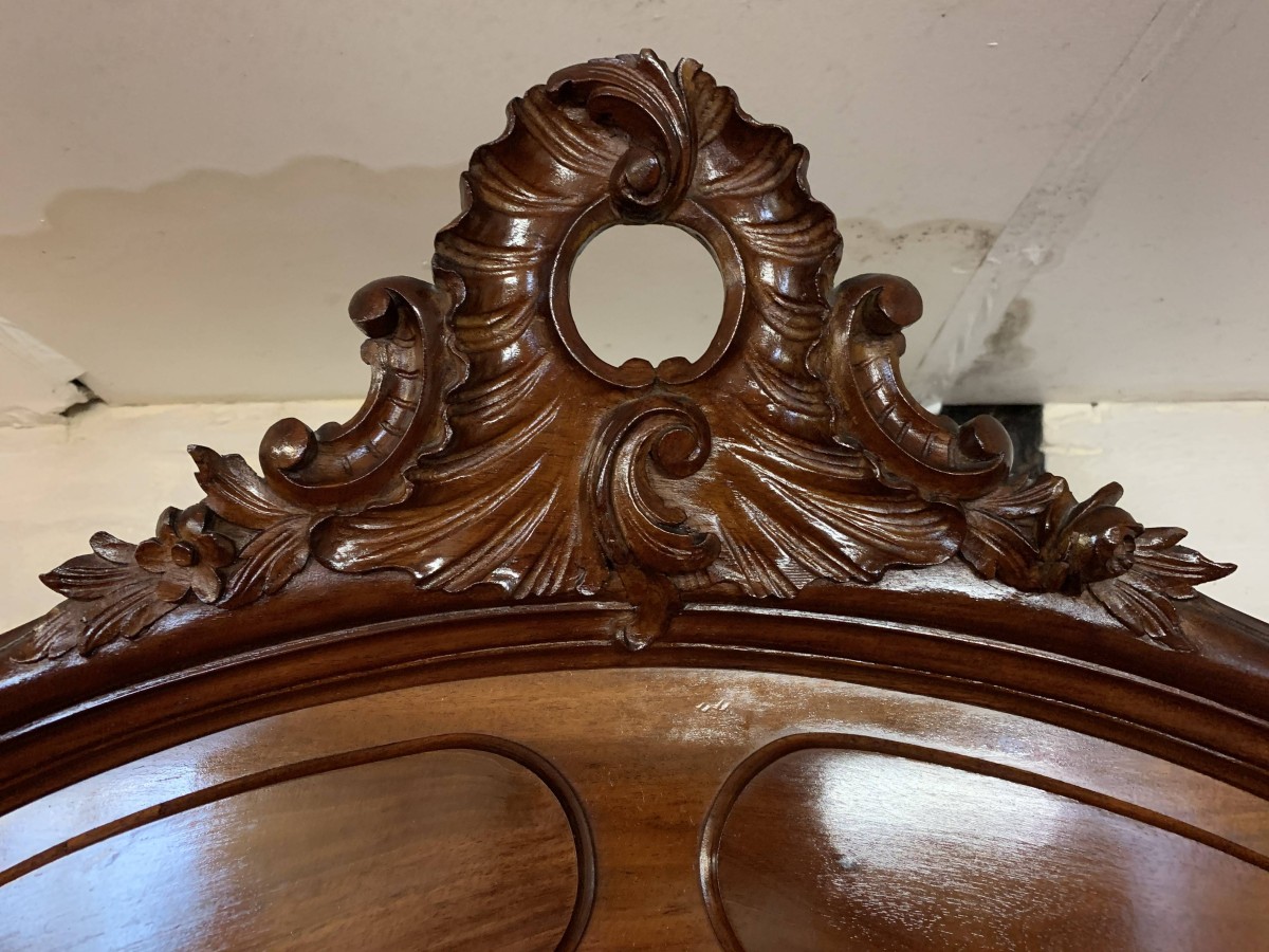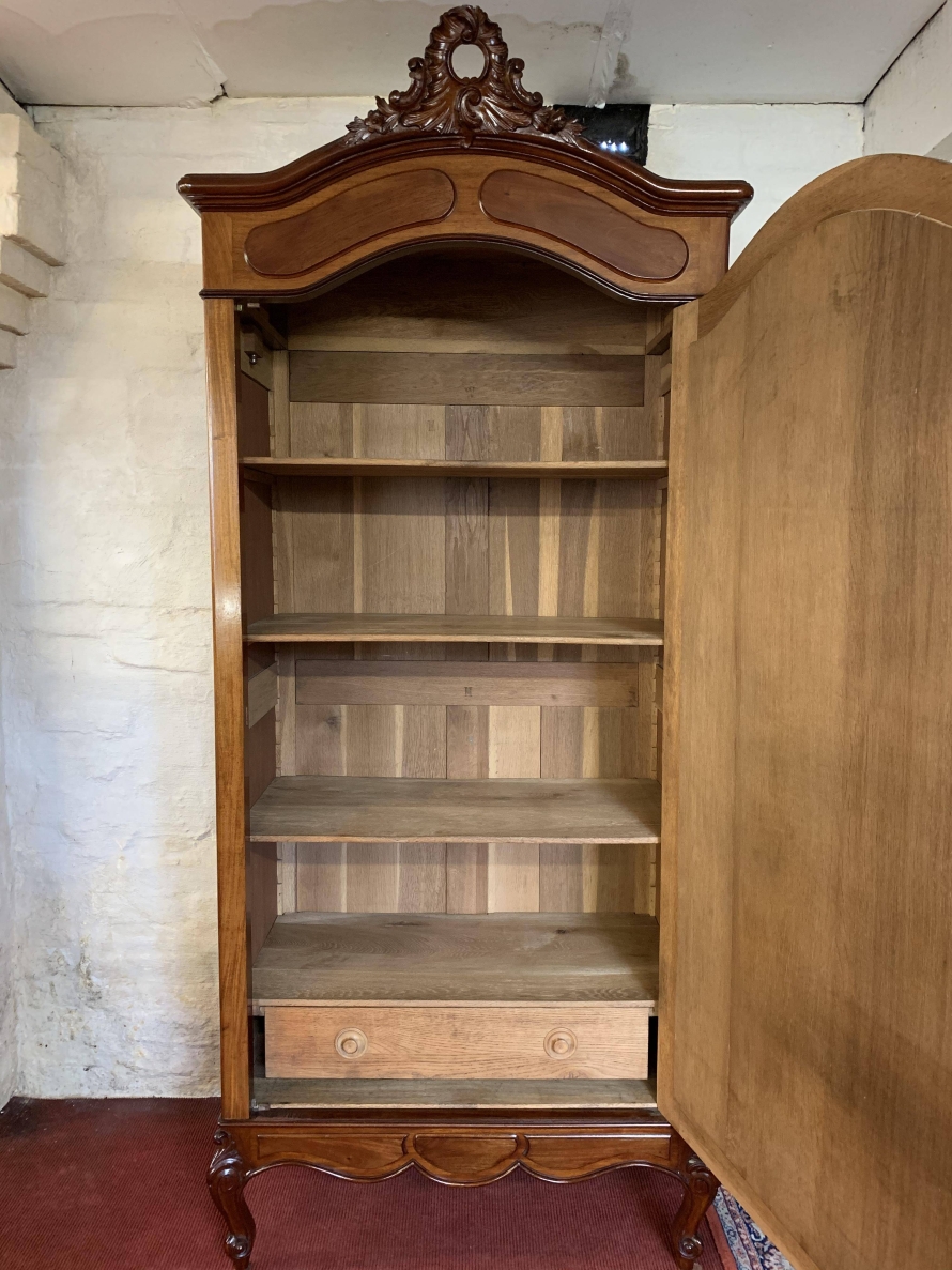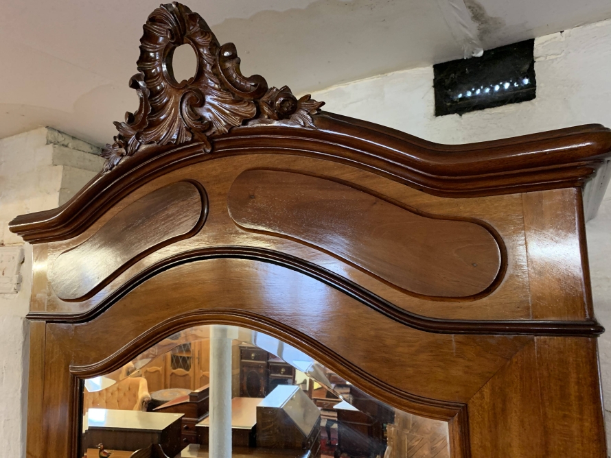 A beautiful French armoire dating circa 1880 which is in fantastic condition. The shaped oversailing top rises to a impressive central carving. Below is a full length bevelled mirrored lockable door, the door opens to reveal three adjustable and removable storage shelves and a drawer to the base. Recessed panelled sides, shaped skirt, this outstanding quality armoire stands on two carved shaped cabriole legs to the front. Please note this armoire splits down for easy transportation and delivery into any home. We are also listing a matching double mirrored door armoire, a pair of marble top bedside cabinets, shaped carved double bed and a triple mirrored marble top dressing chest.