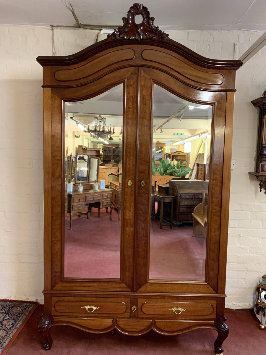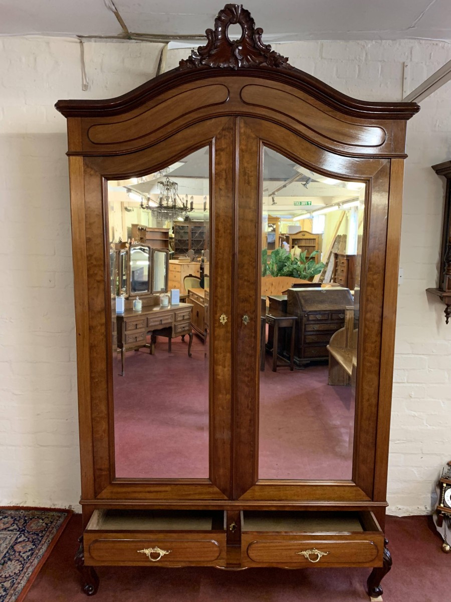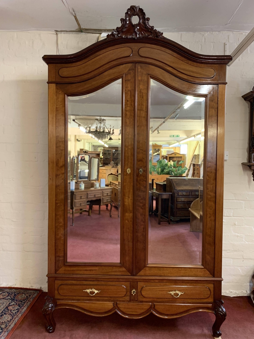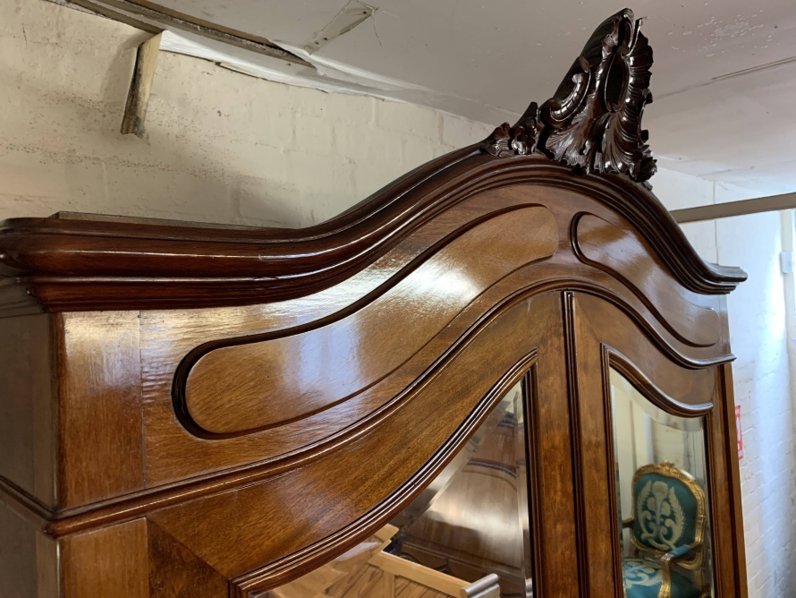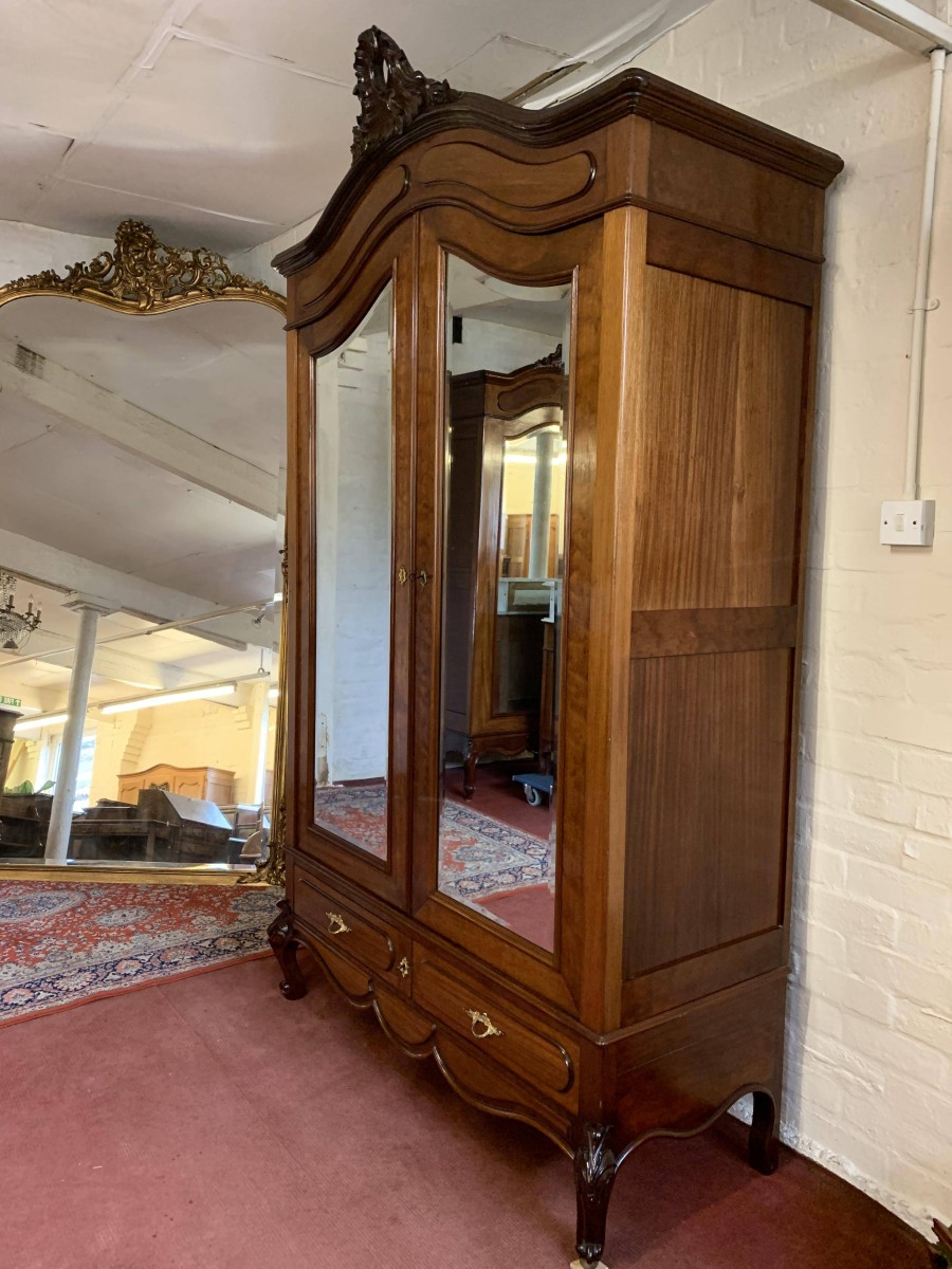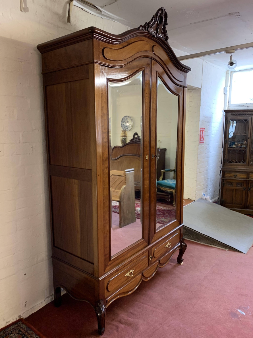 A beautiful Antique French armoire dating circa 1880 which is in excellent condition. The shaped over sailing top rises to an impressive central carving. Below are a pair of lockable bevel mirrored doors. The doors open to reveal a brass hanging rail and offering ample storage. Below are a pair of lockable drawers, each drawer having a decorative brass handle. Recessed panelled sides, shaped skirt, this outstanding quality mahogany armoire stands on two shaped carved cabriole legs to the front. Please note the armoire breaks down for easy transportation and delivery into any home. We are also listing a matching single mirrored armoire, triple mirrored marble top dressing chest, shaped carved double bed and a pair of matching bedside cabinets.