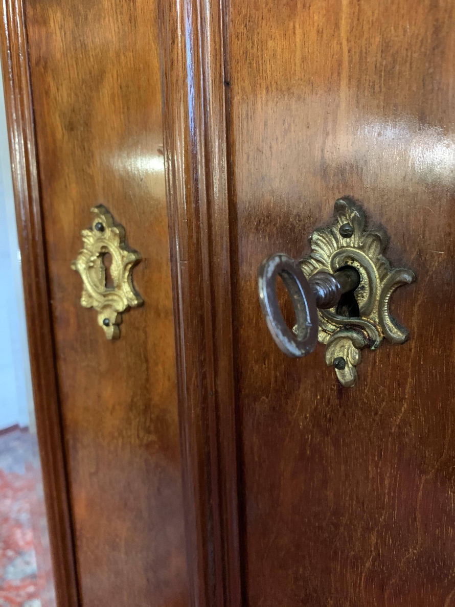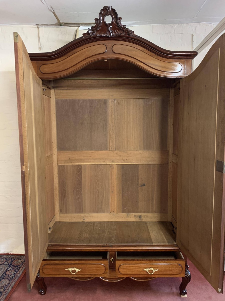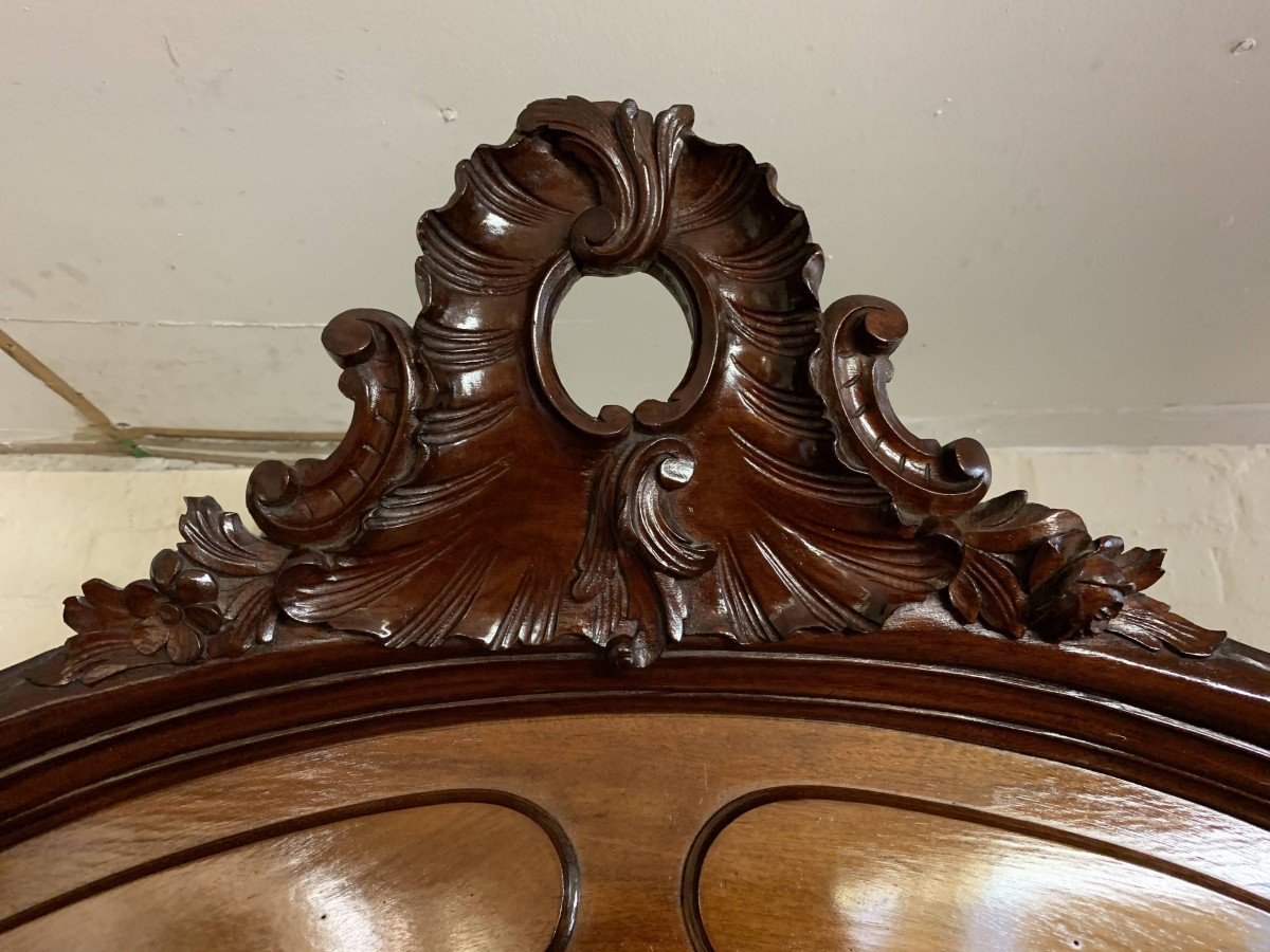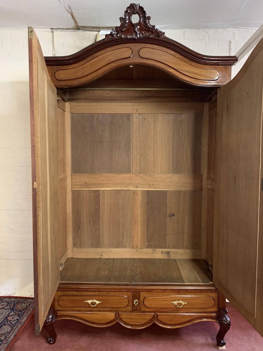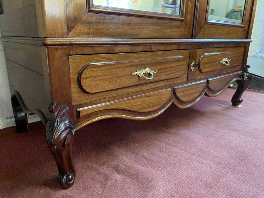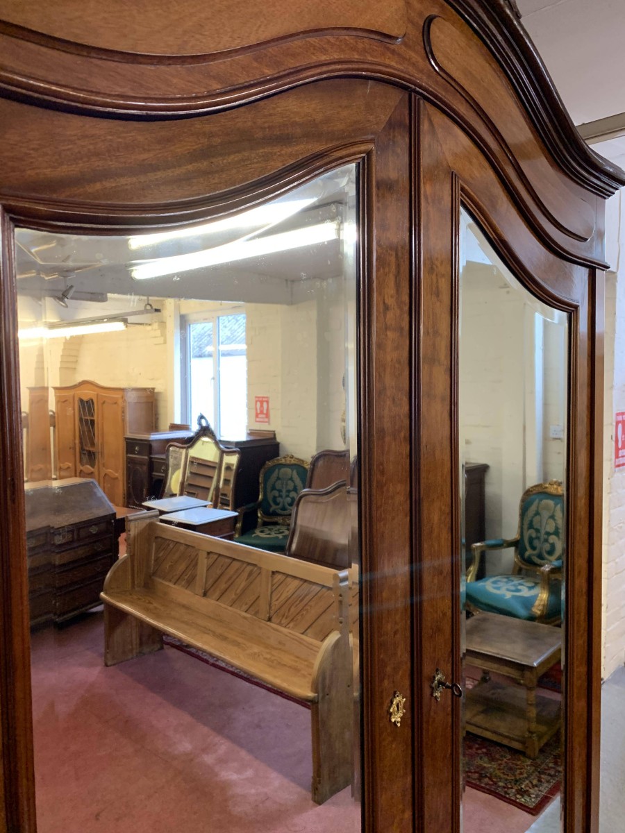 A beautiful Antique French armoire dating circa 1880 which is in excellent condition. The shaped over sailing top rises to an impressive central carving. Below are a pair of lockable bevel mirrored doors. The doors open to reveal a brass hanging rail and offering ample storage. Below are a pair of lockable drawers, each drawer having a decorative brass handle. Recessed panelled sides, shaped skirt, this outstanding quality mahogany armoire stands on two shaped carved cabriole legs to the front. Please note the armoire breaks down for easy transportation and delivery into any home. We are also listing a matching single mirrored armoire, triple mirrored marble top dressing chest, shaped carved double bed and a pair of matching bedside cabinets.