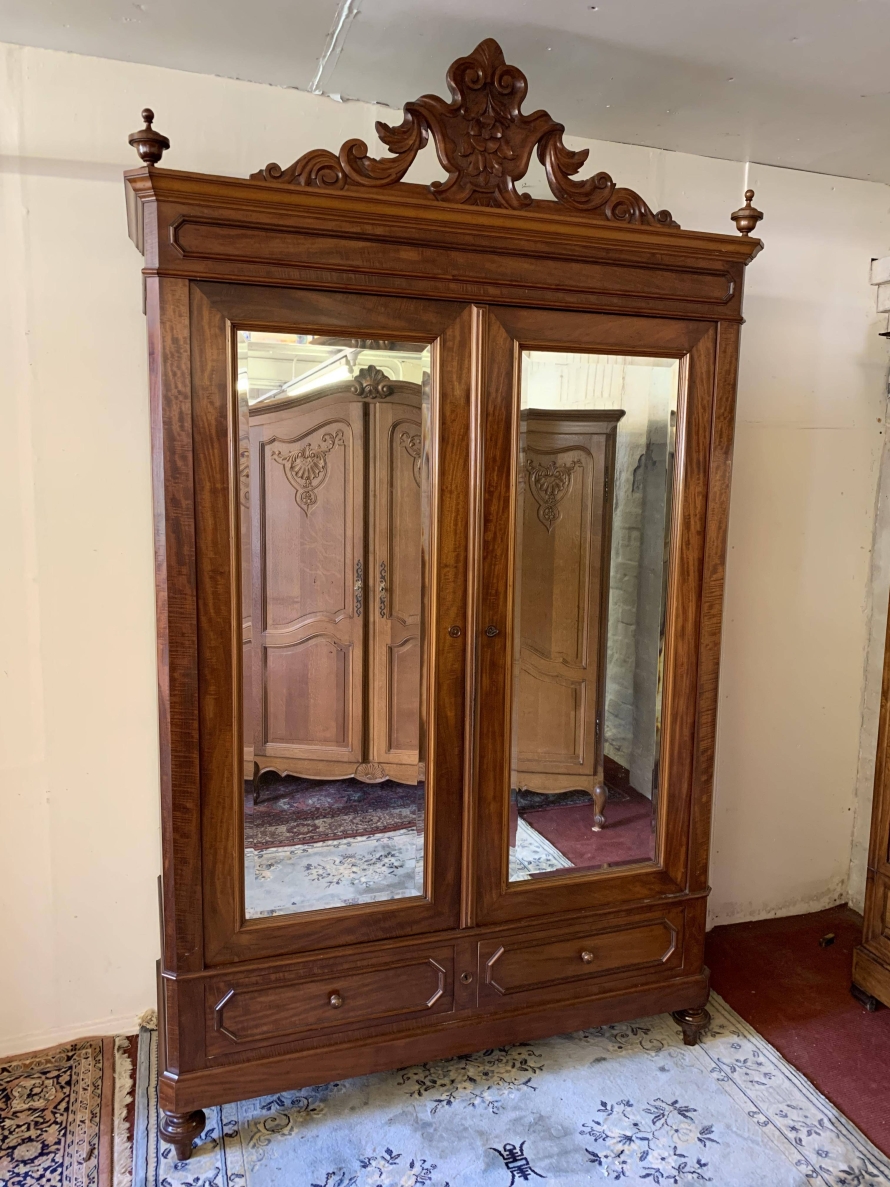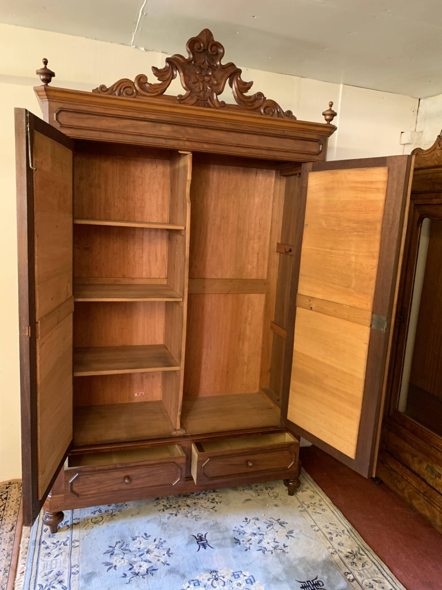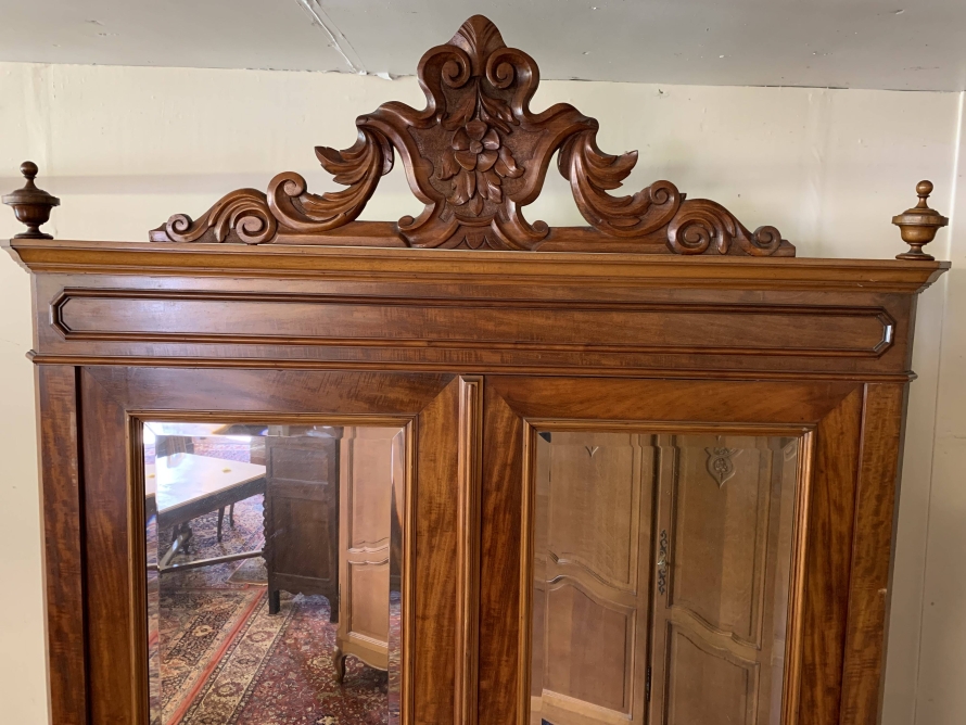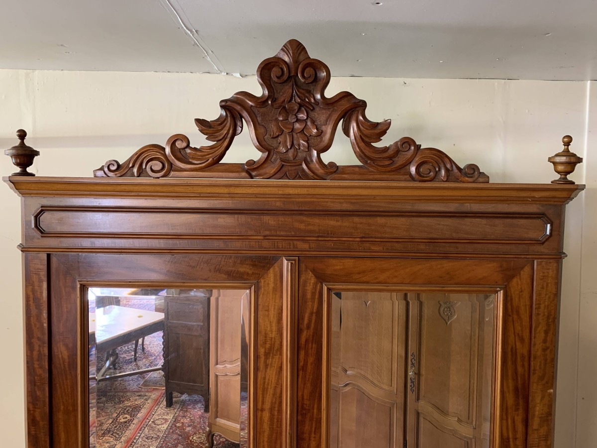 This fabulous armoire dates circa 1885. Fabulously carved crest to the top with turned finials to the sides. Having a pair of lockable full length bevel edged mirrored doors. The doors open to reveal a metal hanging rail. Below are a pair of drawers, each drawer having a turned knob handle. This outstanding armoire stands on two turned feet to the front. Please note this armoire splits down for easy transportation and delivery into any home.