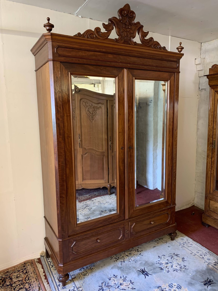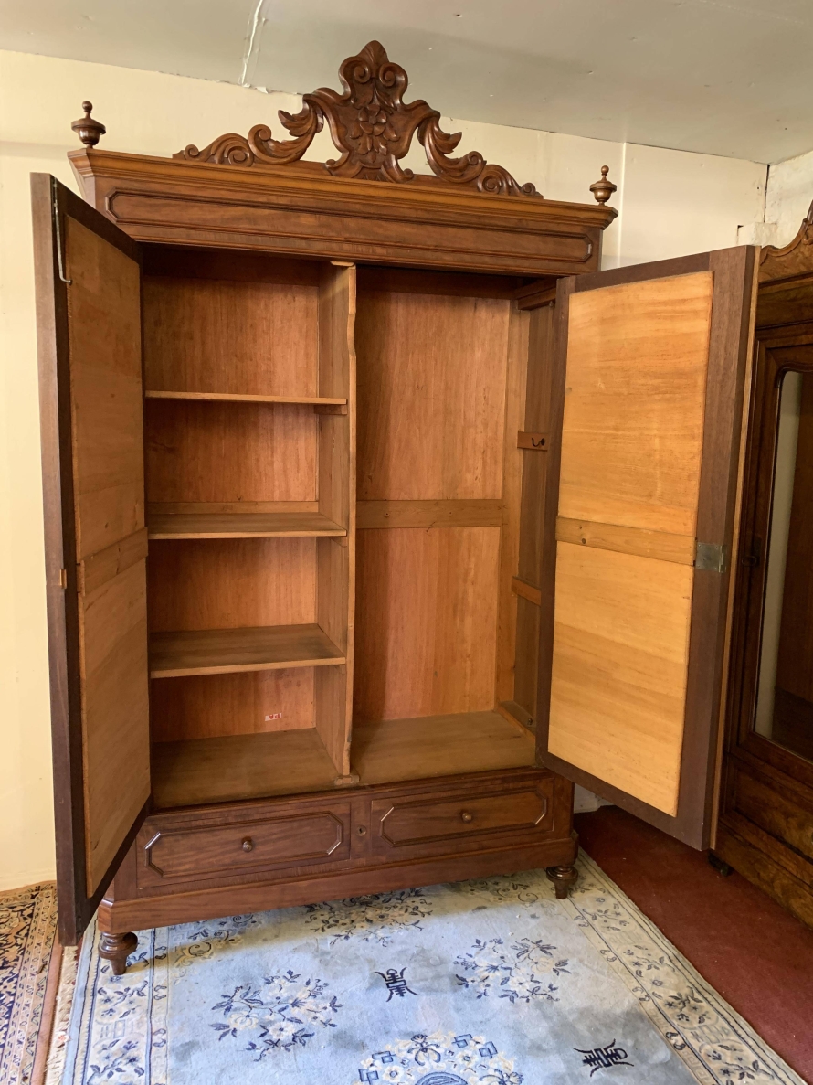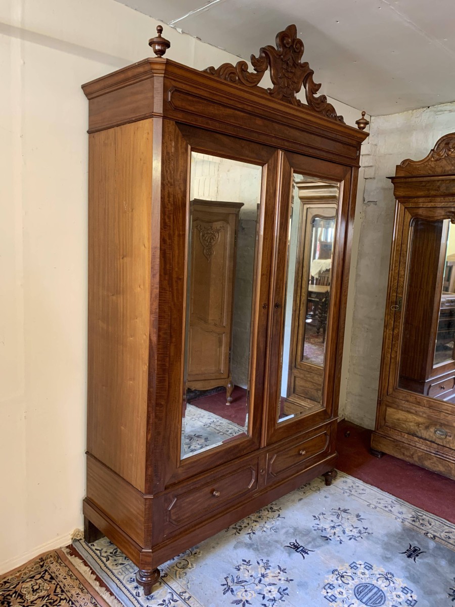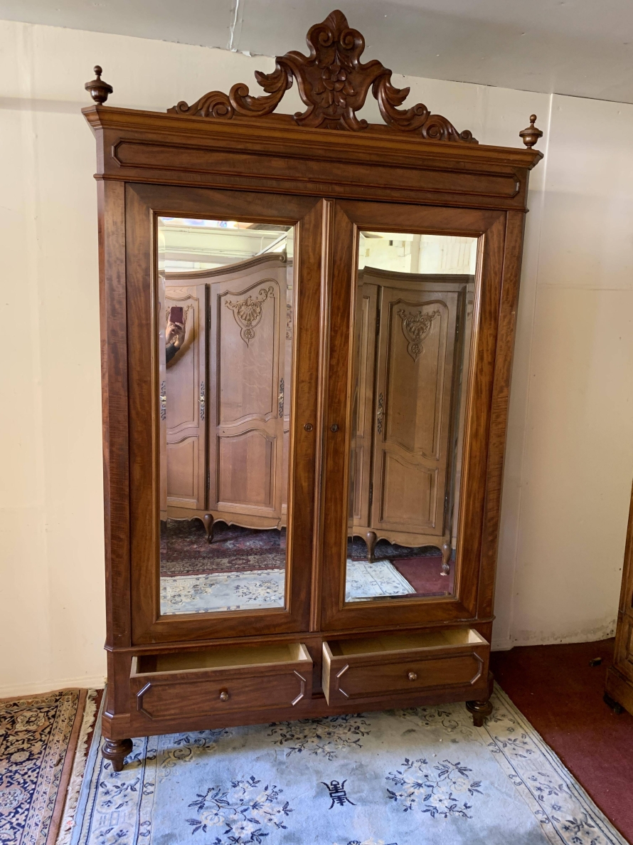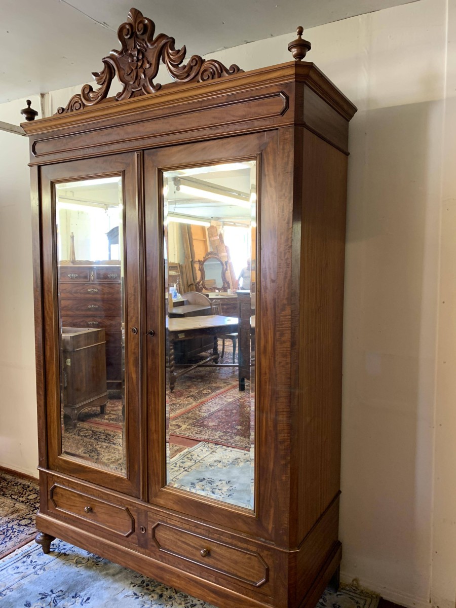 This fabulous armoire dates circa 1885. Fabulously carved crest to the top with turned finials to the sides. Having a pair of lockable full length bevel edged mirrored doors. The doors open to reveal a metal hanging rail. Below are a pair of drawers, each drawer having a turned knob handle. This outstanding armoire stands on two turned feet to the front. Please note this armoire splits down for easy transportation and delivery into any home.