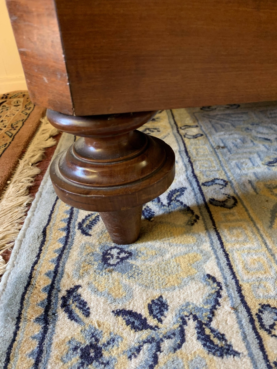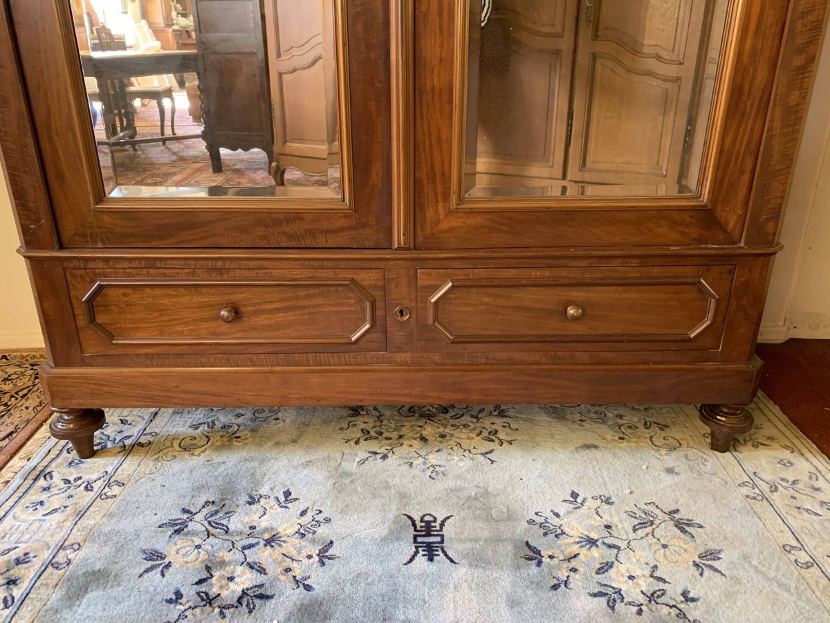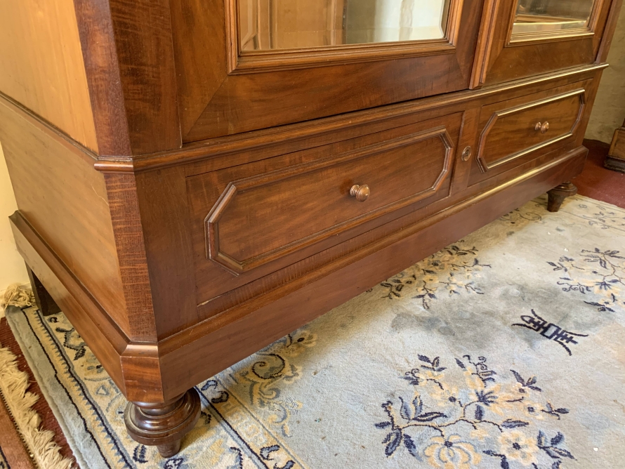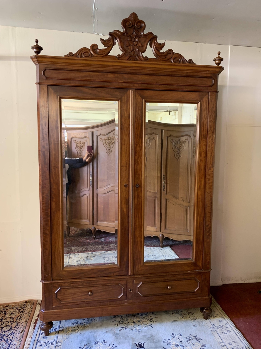 This fabulous armoire dates circa 1885. Fabulously carved crest to the top with turned finials to the sides. Having a pair of lockable full length bevel edged mirrored doors. The doors open to reveal a metal hanging rail. Below are a pair of drawers, each drawer having a turned knob handle. This outstanding armoire stands on two turned feet to the front. Please note this armoire splits down for easy transportation and delivery into any home.