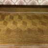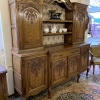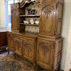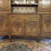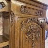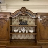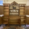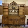 The shaped oversailing top rises to a fabulous central carving, below are two shaped glass panels. The central open section has two shaped removable shelves and three fielded panels. The central section is flanked by a pair of finely carved recessed panelled lockable doors, each door opens to reveal two removable shelves. The base section has a parquetry inlaid top and a brakefront central section consisting of a carved drawer, with ornate brass handles which sits above a pair of finely carved recessed panelled doors, the doors open to reveal a removable shelf. The brakefront central section is flanked by a pair of finely carved lockable recessed panelled doors, each door opens to reveal a removable shelf. Fielded panelled sides, shaped carved skirt, this is a stunning item of French furniture.
