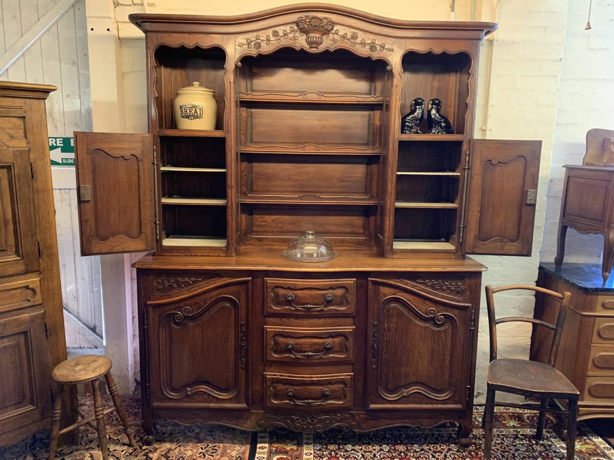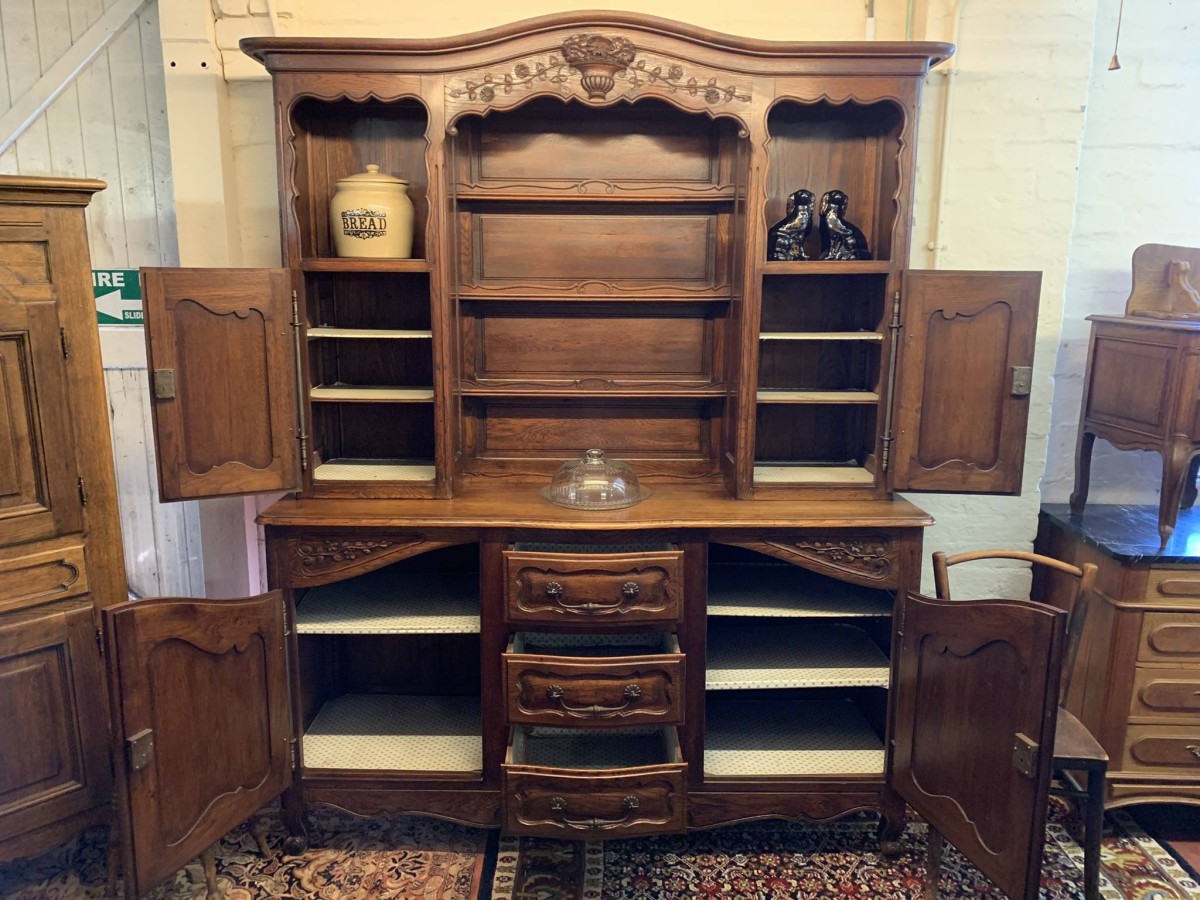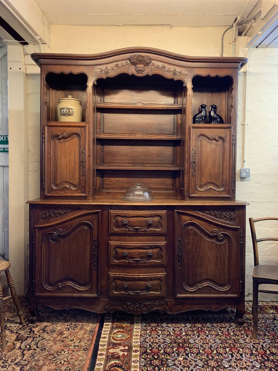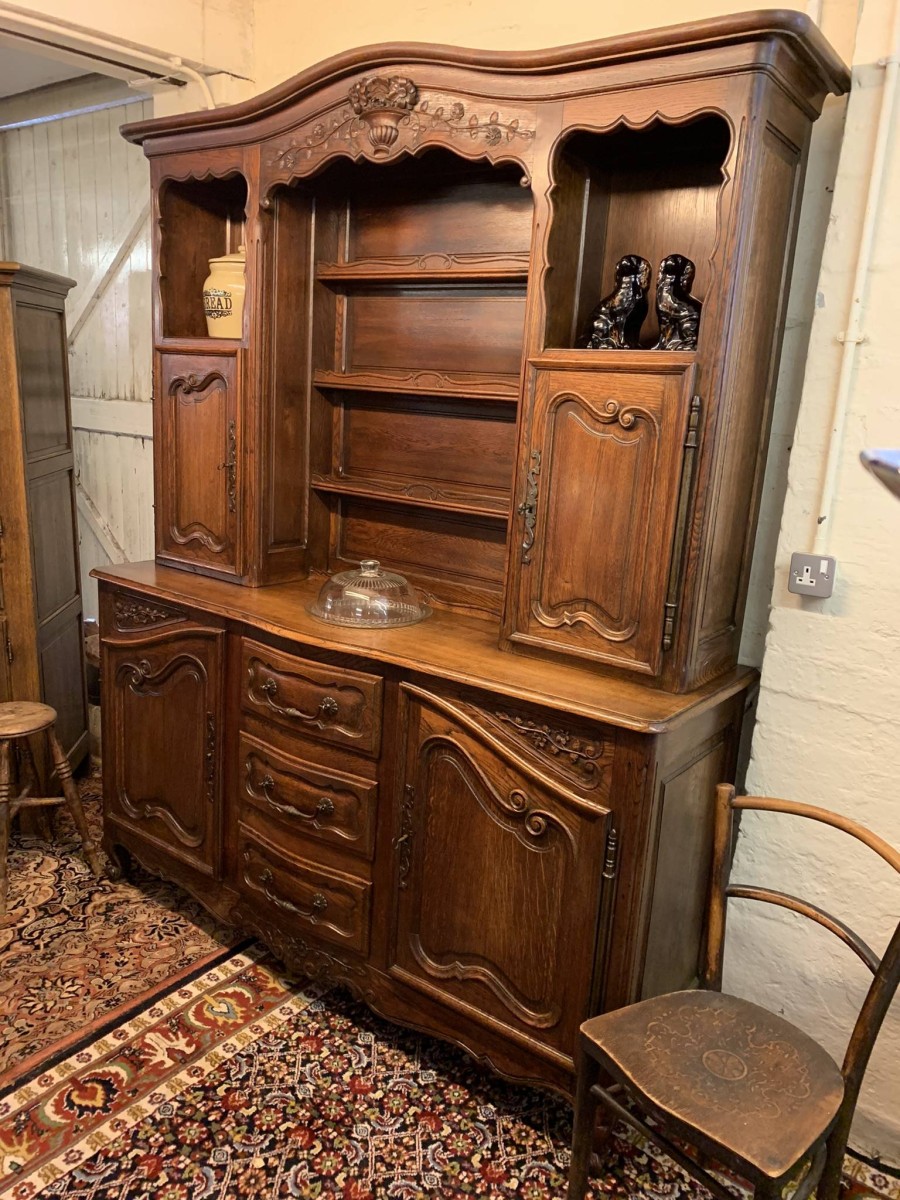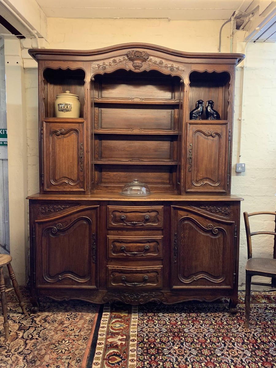 This beautiful French dresser dates circa 1900 and is in excellent condition. The shaped oversailing top has a fabulous central carving. Three central open shelves, flanked by open shelves with a lockable recessed panelled cupboard door below. The doors open to reveal two removable shelves. The base section has three curved central drawers, each drawer having a large brass handle. The drawers are flanked by a pair of lockable recessed panelled doors, each door opens to reveal a removable shelf. Recessed panelled sides, shaped skirt with fabulous central carving this stunning dresser stands on two carved cabriole shaped legs to the front.