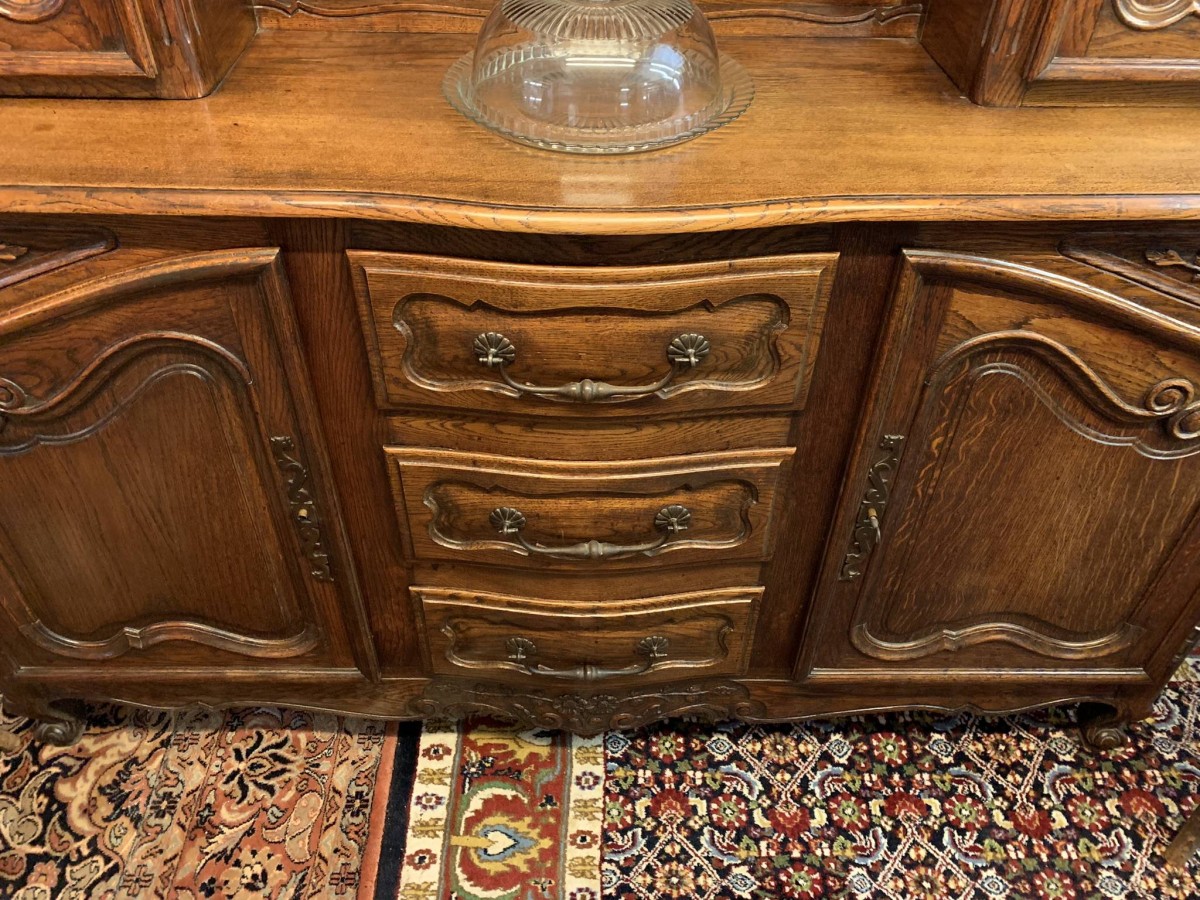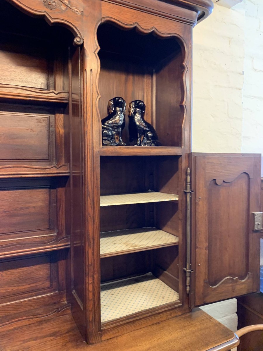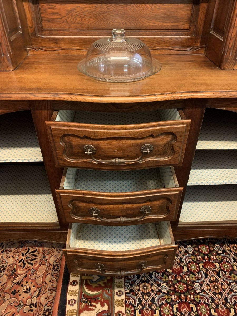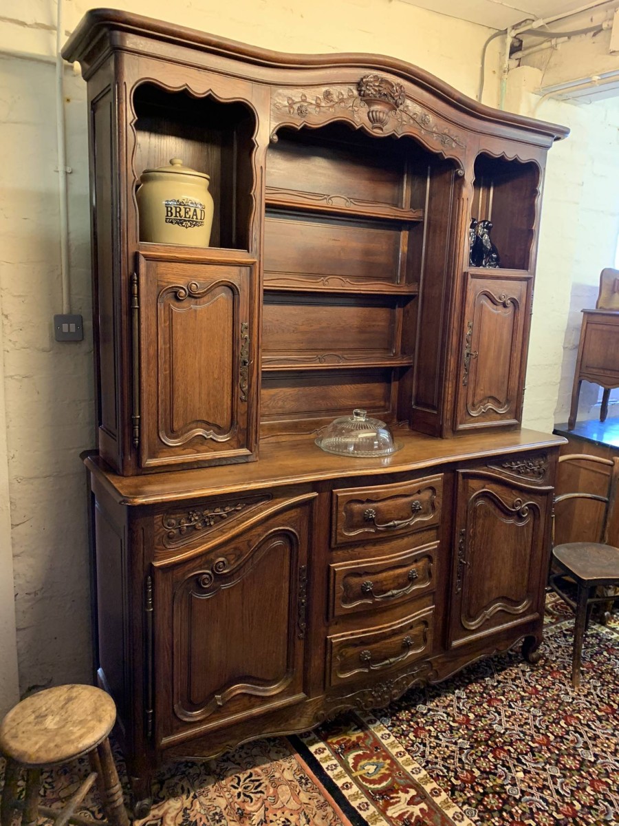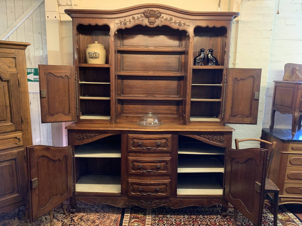 This beautiful French dresser dates circa 1900 and is in excellent condition. The shaped oversailing top has a fabulous central carving. Three central open shelves, flanked by open shelves with a lockable recessed panelled cupboard door below. The doors open to reveal two removable shelves. The base section has three curved central drawers, each drawer having a large brass handle. The drawers are flanked by a pair of lockable recessed panelled doors, each door opens to reveal a removable shelf. Recessed panelled sides, shaped skirt with fabulous central carving this stunning dresser stands on two carved cabriole shaped legs to the front.