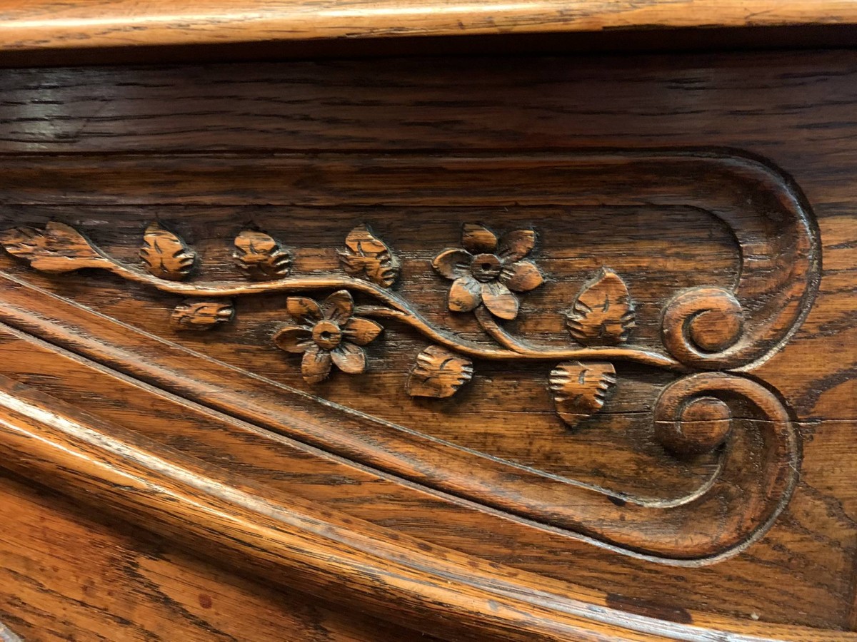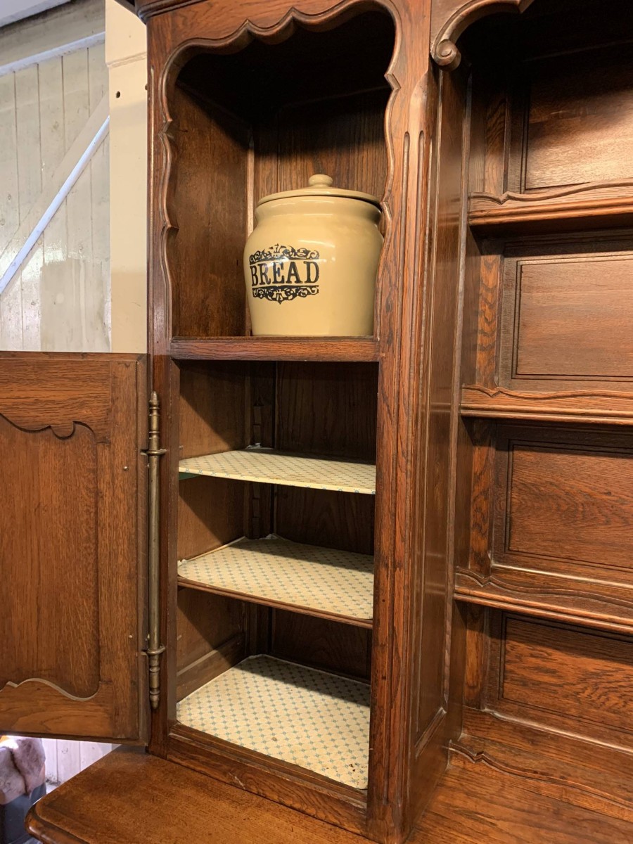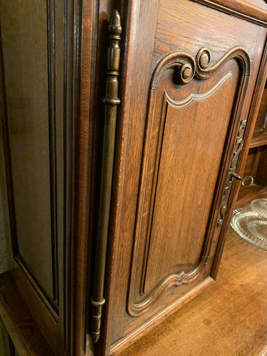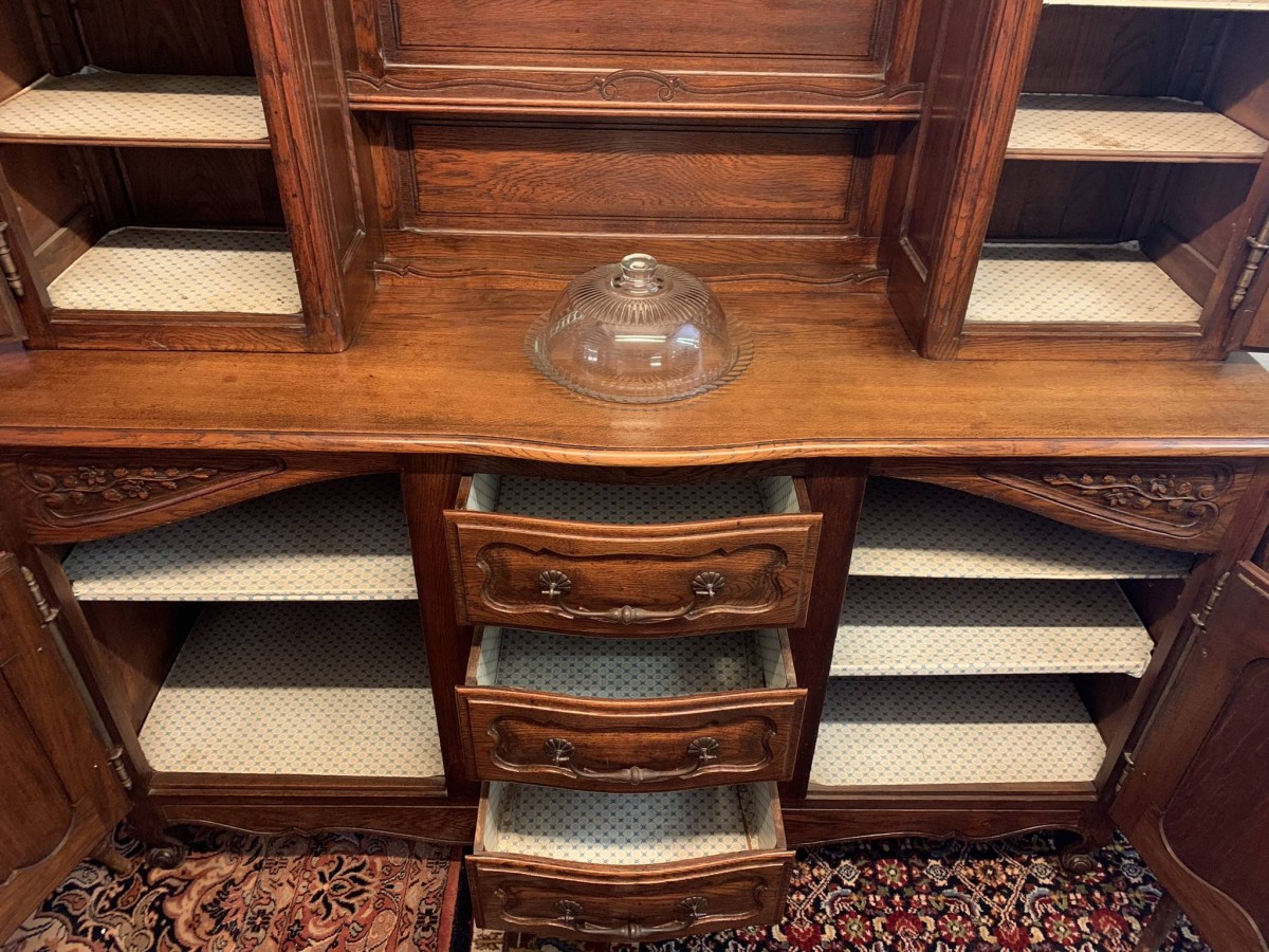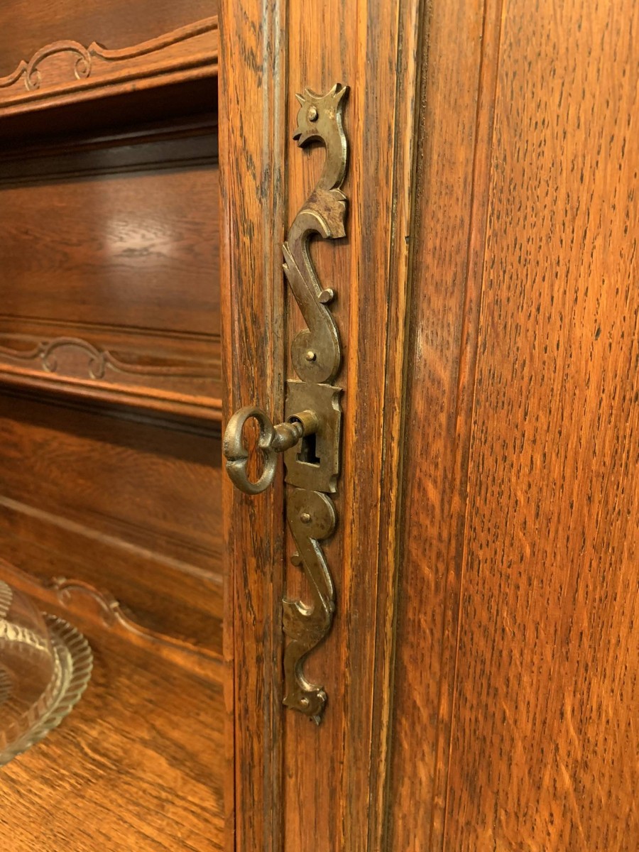 This beautiful French dresser dates circa 1900 and is in excellent condition. The shaped oversailing top has a fabulous central carving. Three central open shelves, flanked by open shelves with a lockable recessed panelled cupboard door below. The doors open to reveal two removable shelves. The base section has three curved central drawers, each drawer having a large brass handle. The drawers are flanked by a pair of lockable recessed panelled doors, each door opens to reveal a removable shelf. Recessed panelled sides, shaped skirt with fabulous central carving this stunning dresser stands on two carved cabriole shaped legs to the front.