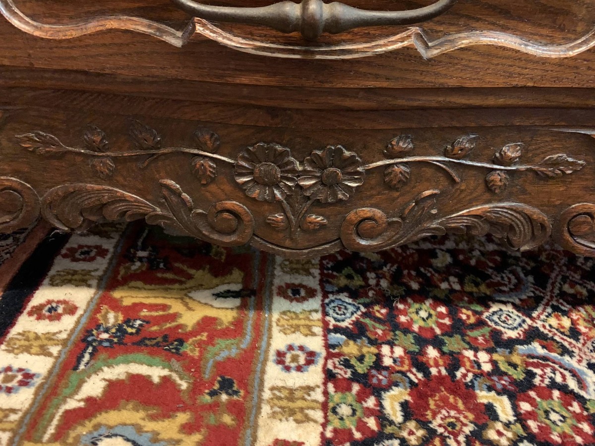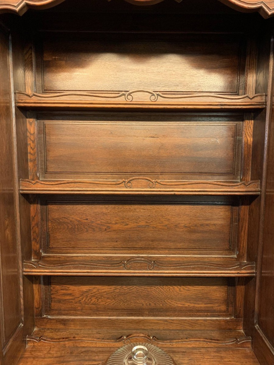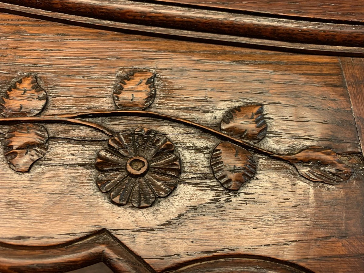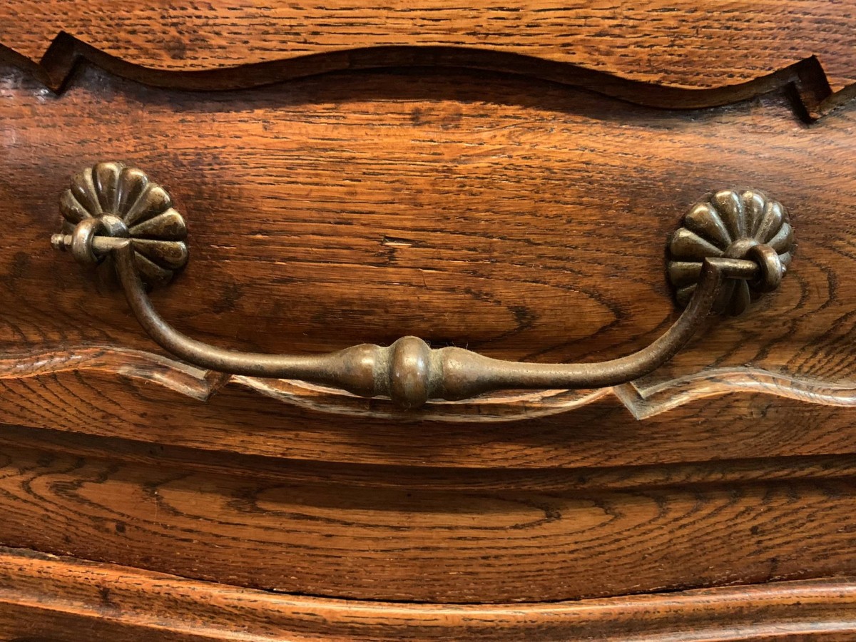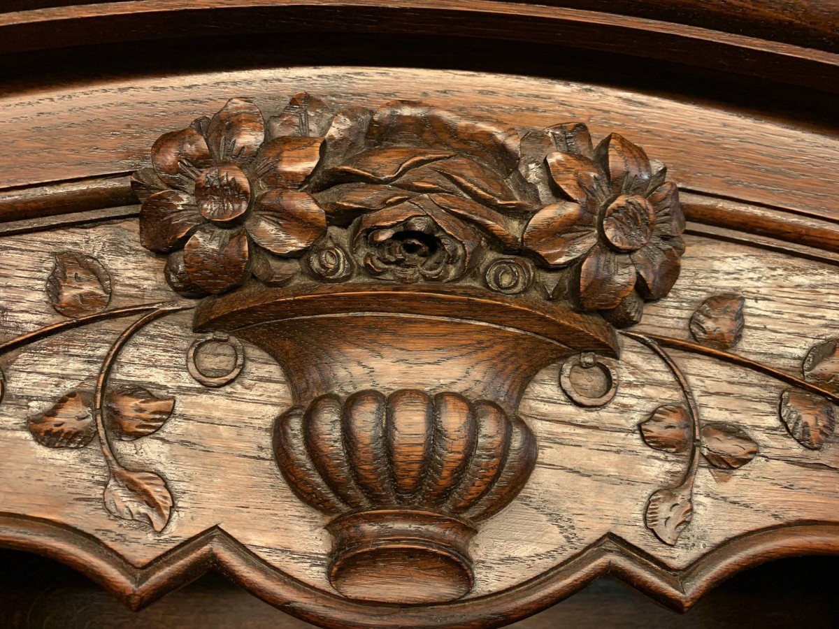 This beautiful French dresser dates circa 1900 and is in excellent condition. The shaped oversailing top has a fabulous central carving. Three central open shelves, flanked by open shelves with a lockable recessed panelled cupboard door below. The doors open to reveal two removable shelves. The base section has three curved central drawers, each drawer having a large brass handle. The drawers are flanked by a pair of lockable recessed panelled doors, each door opens to reveal a removable shelf. Recessed panelled sides, shaped skirt with fabulous central carving this stunning dresser stands on two carved cabriole shaped legs to the front.