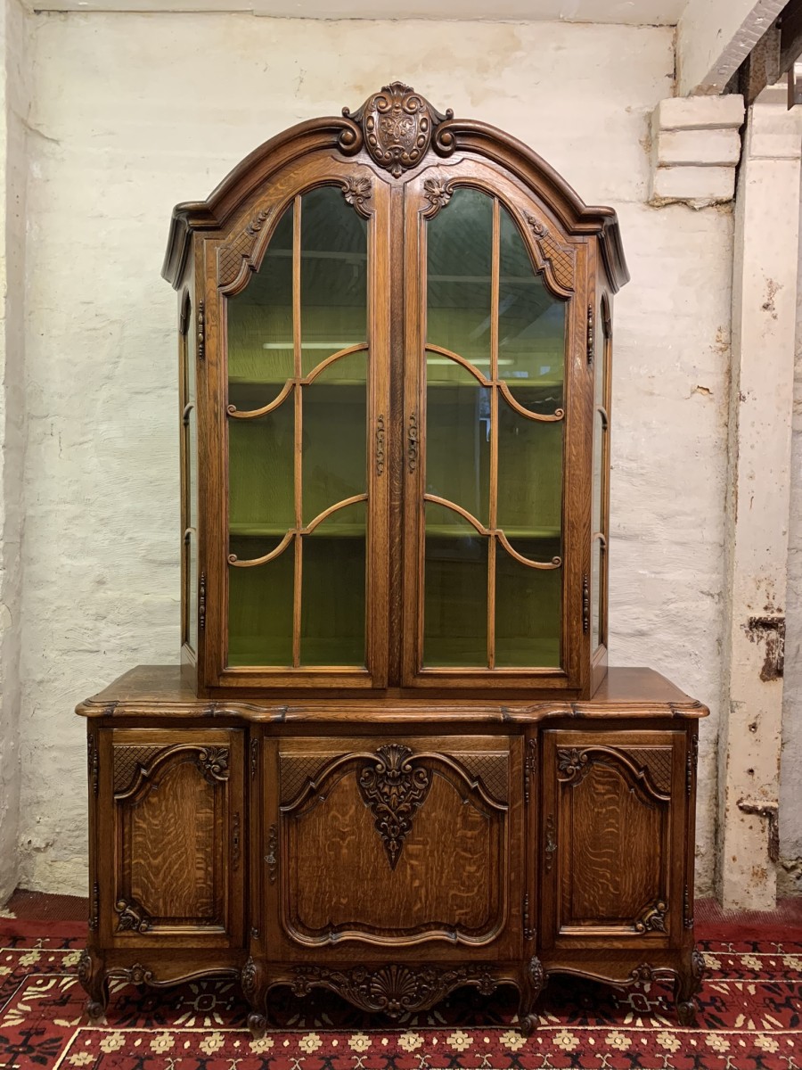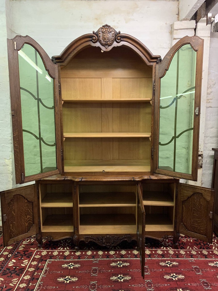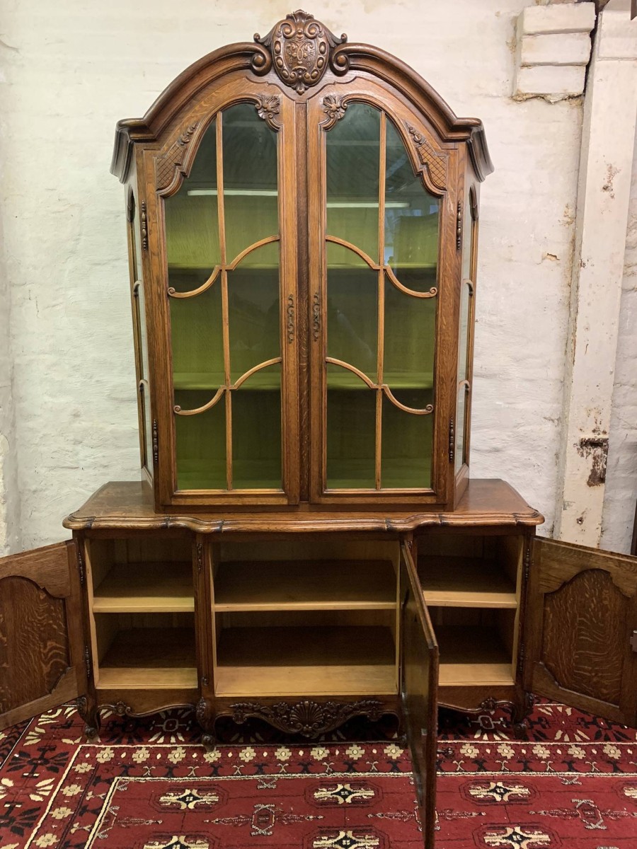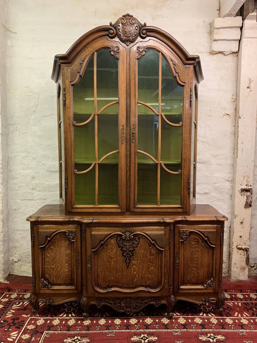 This fabulous French vitrine is in excellent condition and dates circa 1910. The top section rises to a beautifully carved central crest. Below are a pair of lockable glazed doors, each door having brass hinges and decorative brass escutcheon, carving to the top with shaped wood barring decoration. The sides are also glazed with shaped wood barring. The doors open to reveal two wooden shelves. The base section has a shaped top which sits above a central brakefront lockable carved recessed panelled door, the door opens to reveal a removable wooden shelf , this central brakefront door is flanked by a pair of carved recessed panelled lockable doors, the doors open to reveal a removable shelf. Recessed panelled sides, shaped skirt with fabulous central carving this stunning French vitrine stands on six carved cabriole shaped legs.