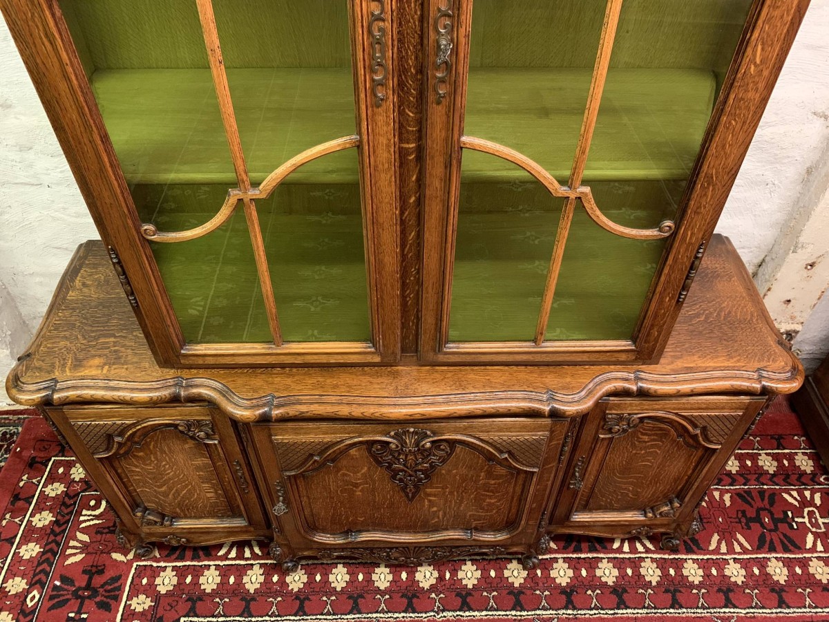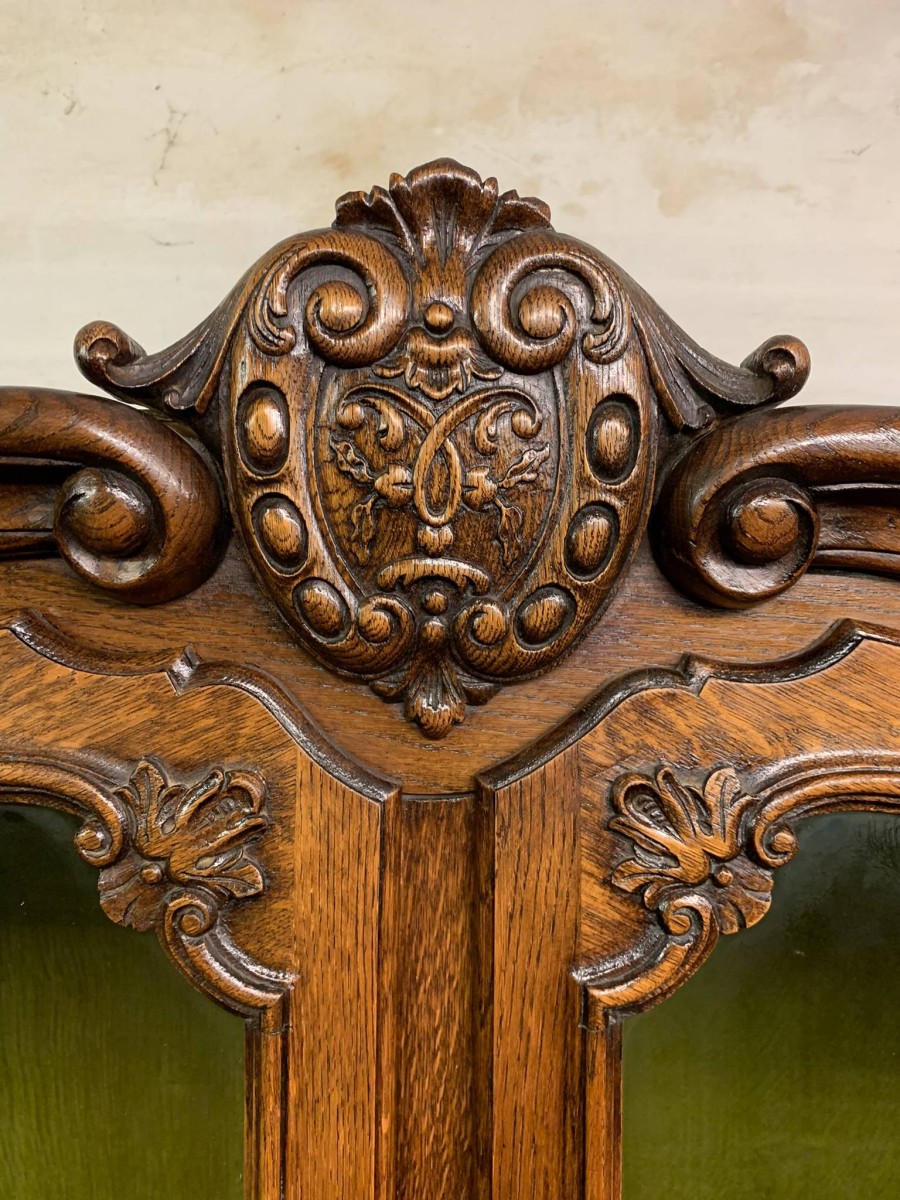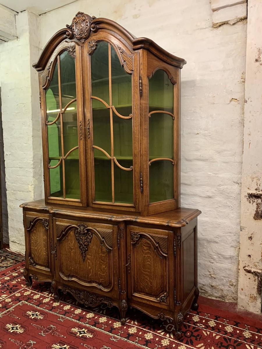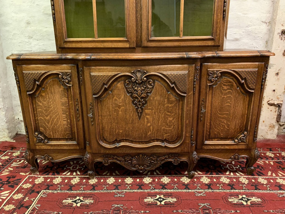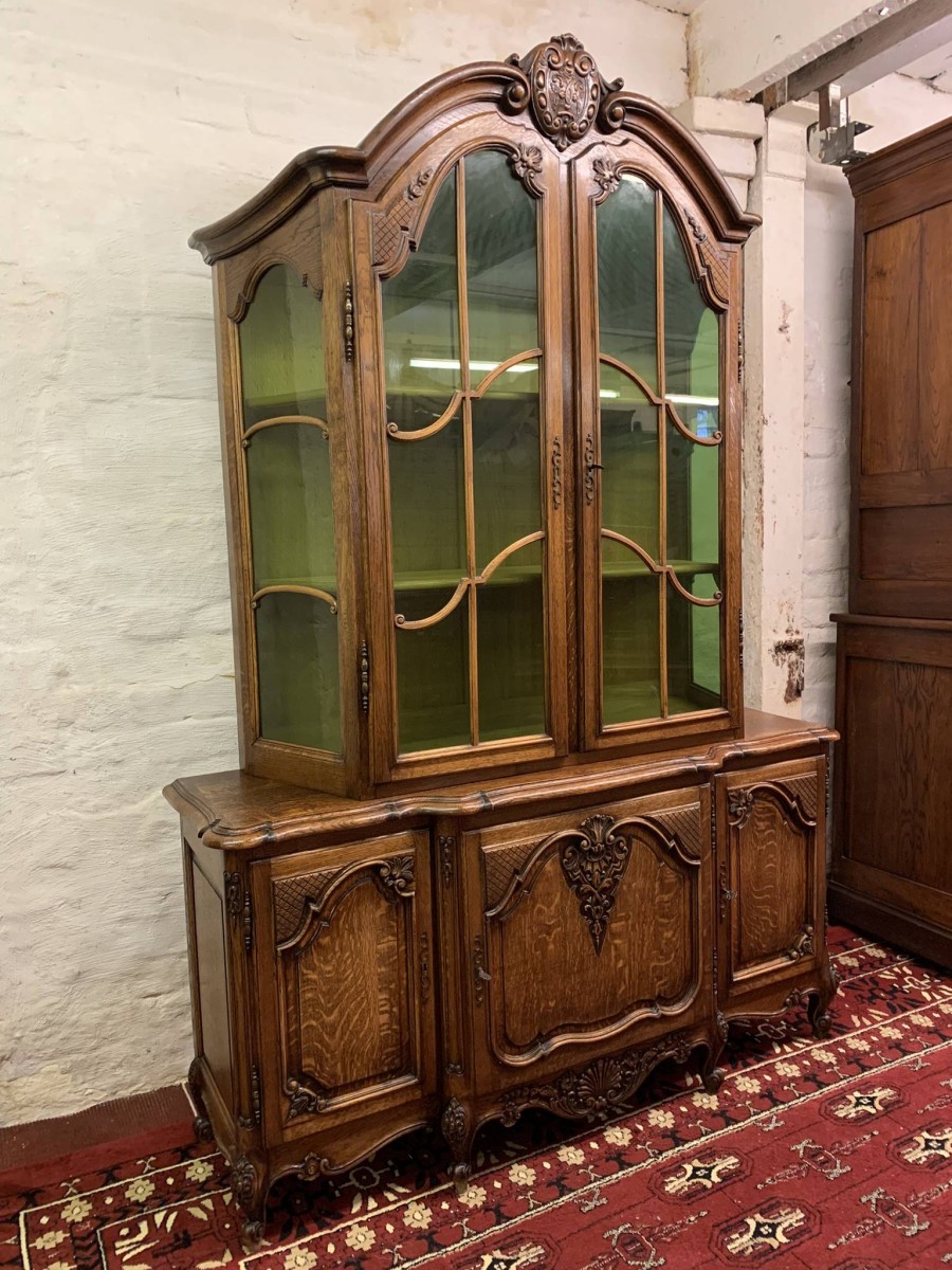 This fabulous French vitrine is in excellent condition and dates circa 1910. The top section rises to a beautifully carved central crest. Below are a pair of lockable glazed doors, each door having brass hinges and decorative brass escutcheon, carving to the top with shaped wood barring decoration. The sides are also glazed with shaped wood barring. The doors open to reveal two wooden shelves. The base section has a shaped top which sits above a central brakefront lockable carved recessed panelled door, the door opens to reveal a removable wooden shelf , this central brakefront door is flanked by a pair of carved recessed panelled lockable doors, the doors open to reveal a removable shelf. Recessed panelled sides, shaped skirt with fabulous central carving this stunning French vitrine stands on six carved cabriole shaped legs.