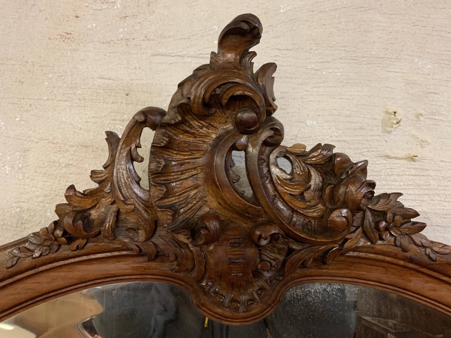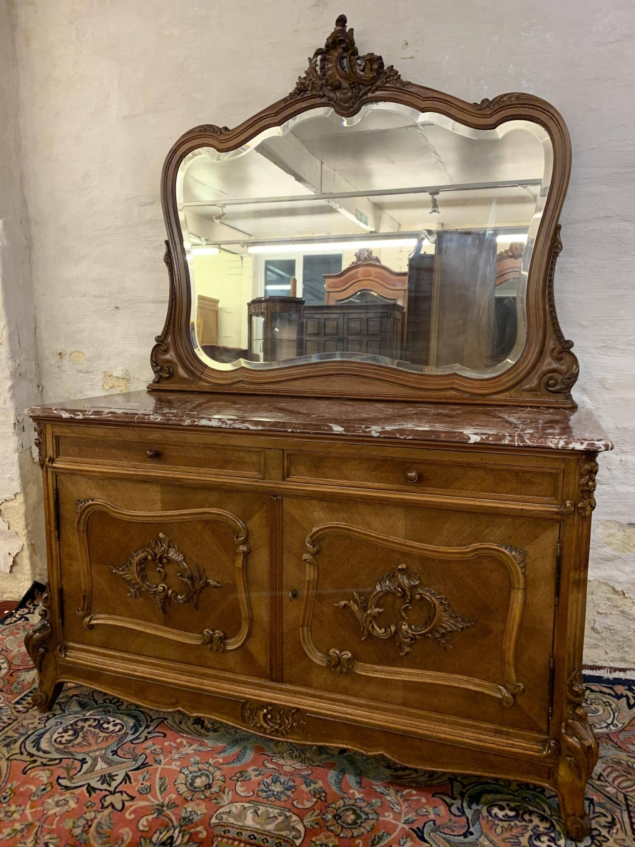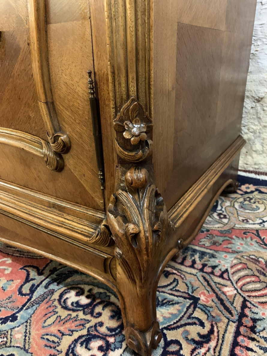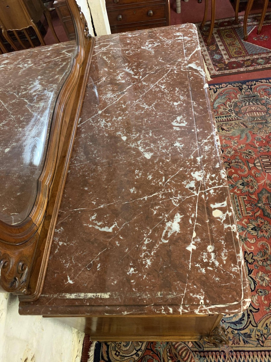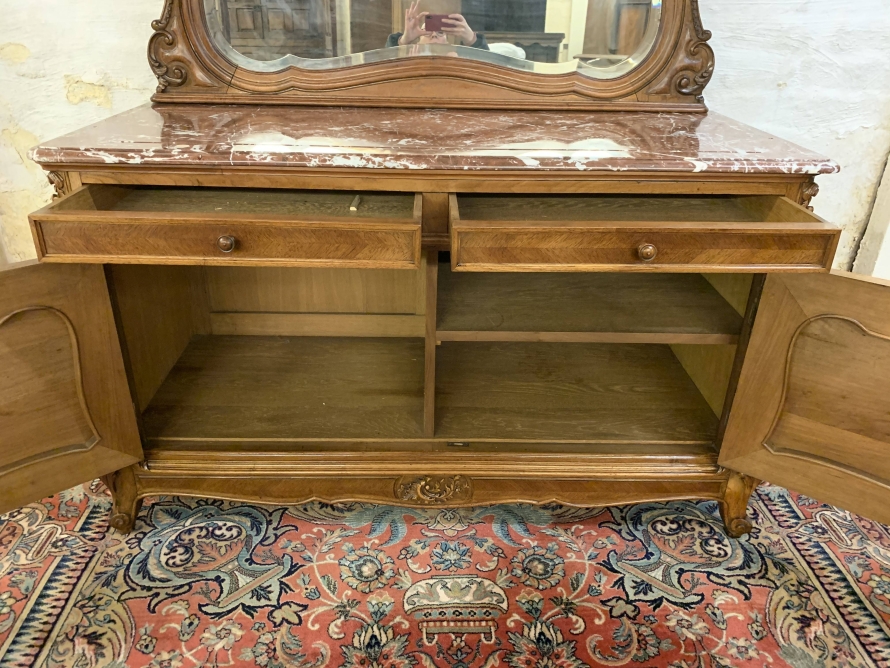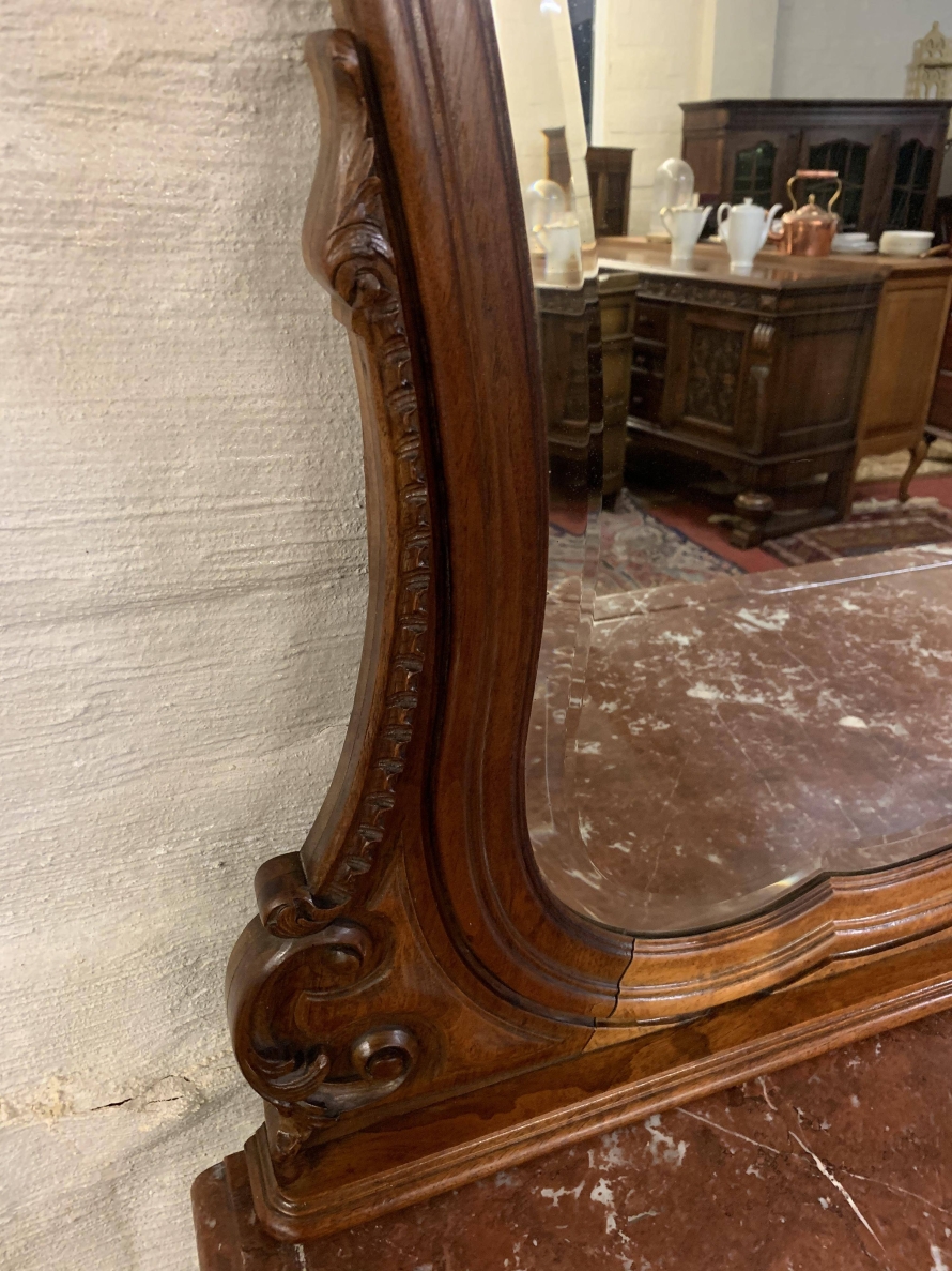 The detachable shaped bevelled mirror back is housed in a wonderfully shaped frame which rises to a beautiful carved crest. The commode has a marble top. Below are a pair of drawers which sit above a pair of lockable carved cupboard doors the left-hand door opens to reveal good sized storage, the right-hand door opens to reveal a removable shelf. Quartered walnut throughout, shaped skirt with central carving, this stunning commode sits on a pair of carved shaped cabriole legs to the front.