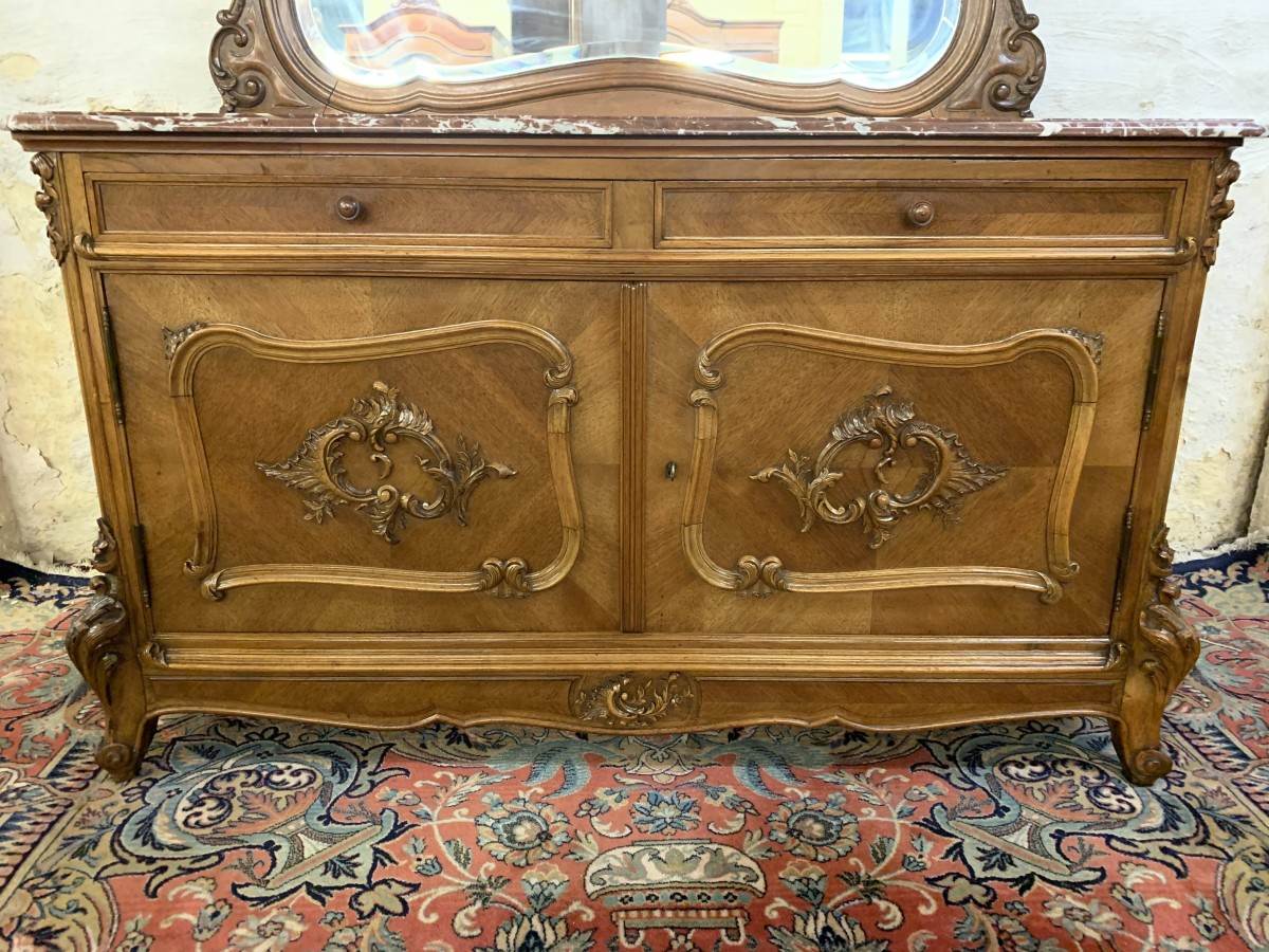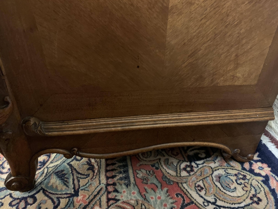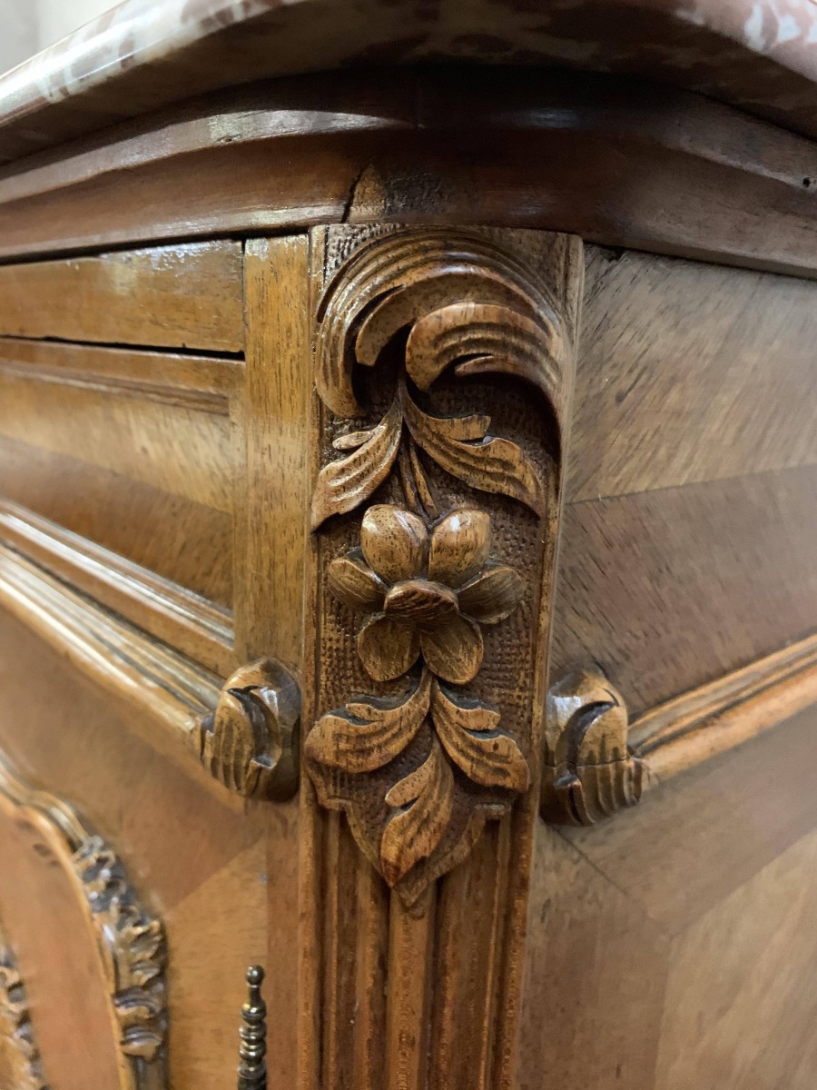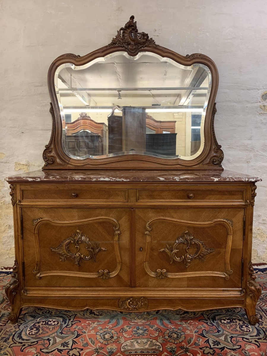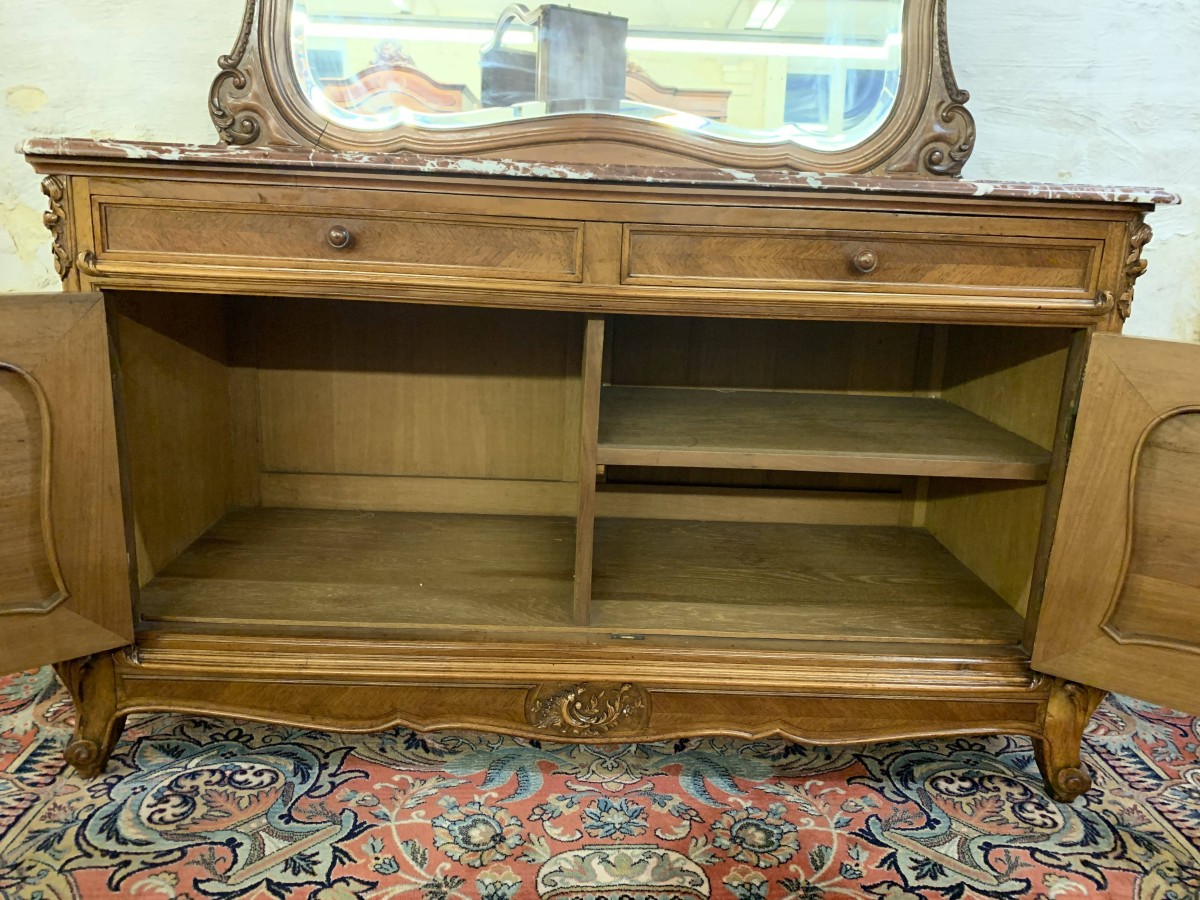 The detachable shaped bevelled mirror back is housed in a wonderfully shaped frame which rises to a beautiful carved crest. The commode has a marble top. Below are a pair of drawers which sit above a pair of lockable carved cupboard doors the left-hand door opens to reveal good sized storage, the right-hand door opens to reveal a removable shelf. Quartered walnut throughout, shaped skirt with central carving, this stunning commode sits on a pair of carved shaped cabriole legs to the front.