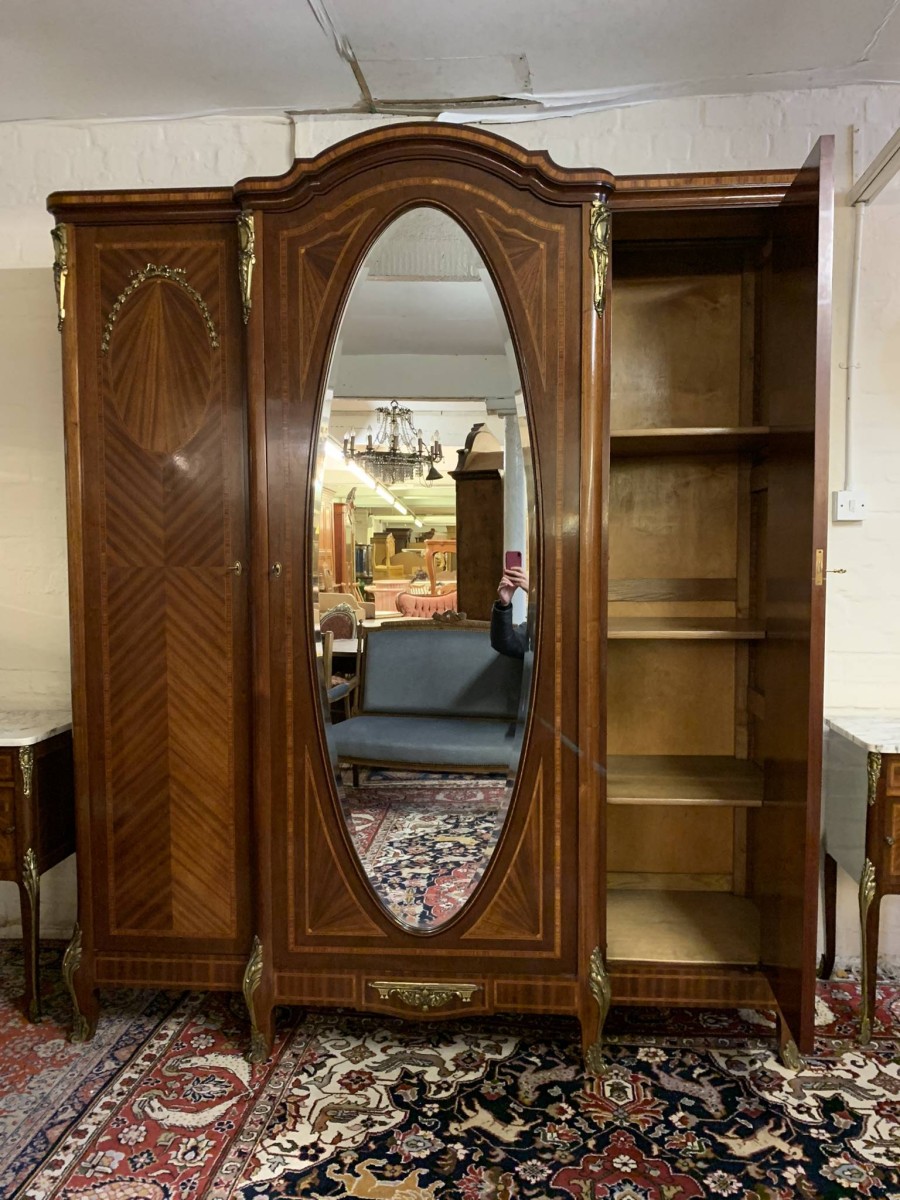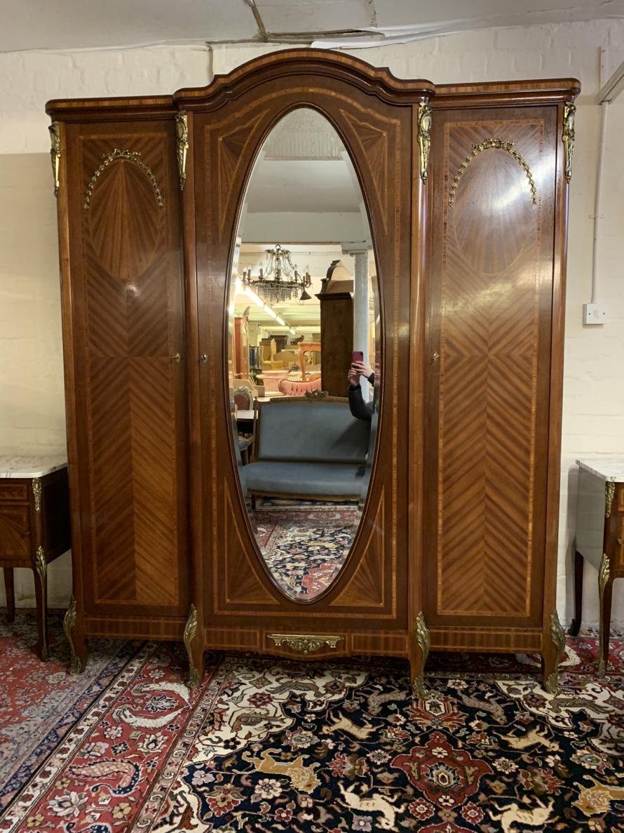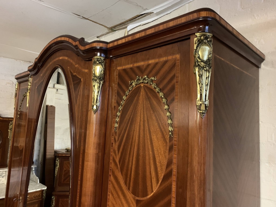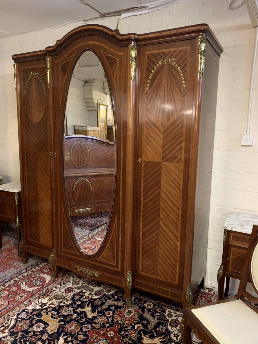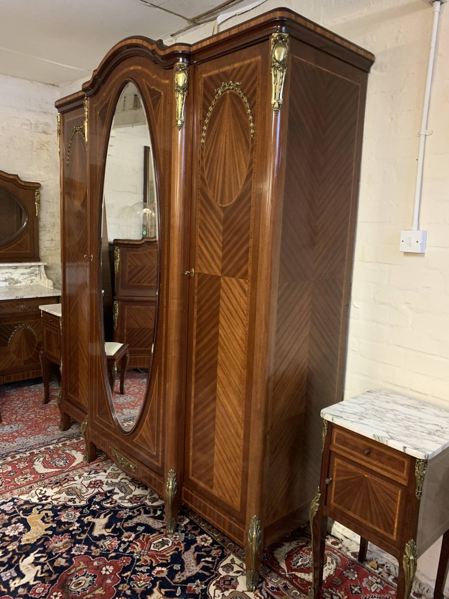 This stunning French antique armoire is in excellent condition and dates circa 1880. The shaped oversailing top sits above a full length bevel edged oval mirrored door. The door opens to reveal a hanging rail with a storage drawer below. The left-hand door and right-hand door open to reveal a hanging rail above three adjustable and removable shelves. The doors having exquisite in lay with gilt mount decoration. Inlaid sides, shaped skirt with central gilt mount this outstanding quality armoire stands on four cabriole shaped legs to the front, each leg having stunning gilt mounts. Please note we are also listing a matching pair of marble top bedside cabinets and a marble top mirrored washstand.