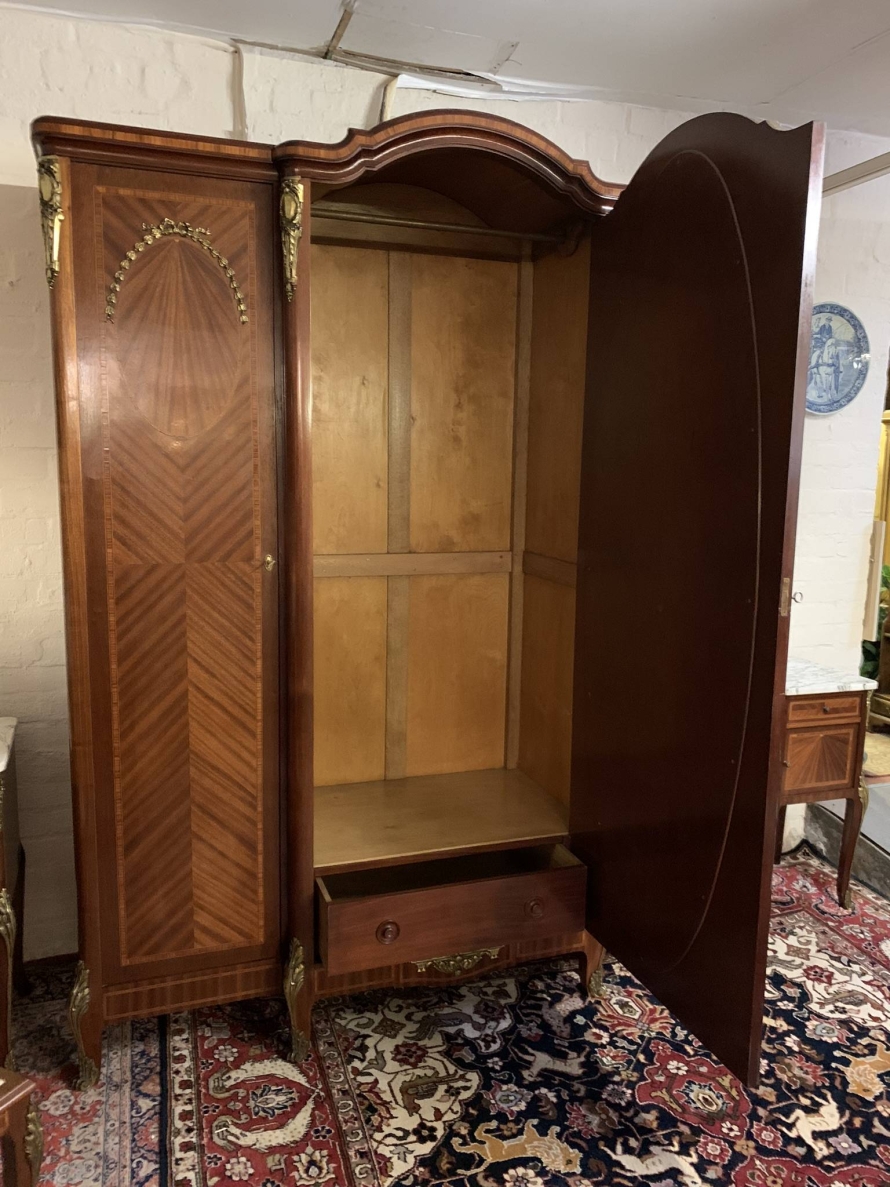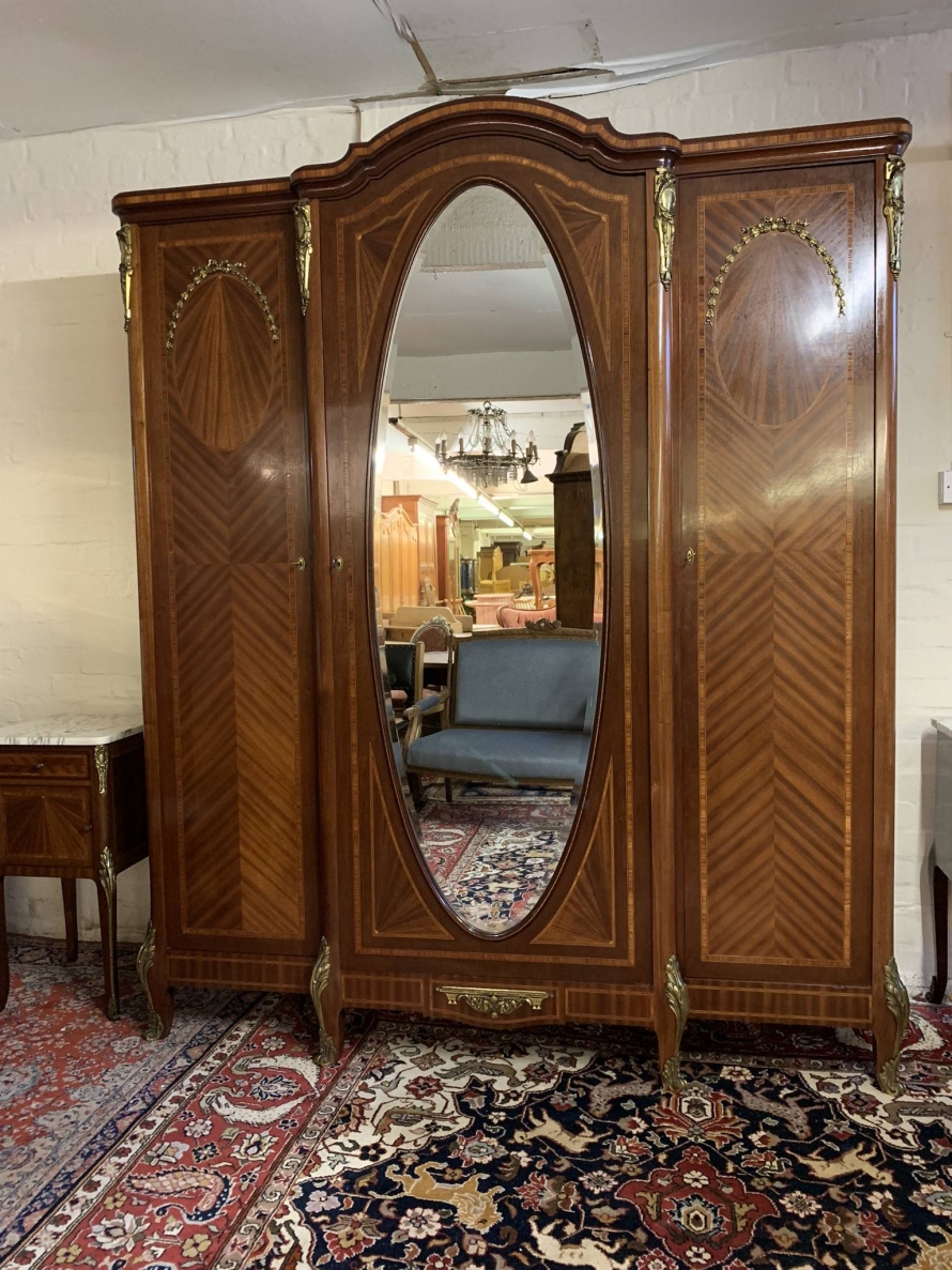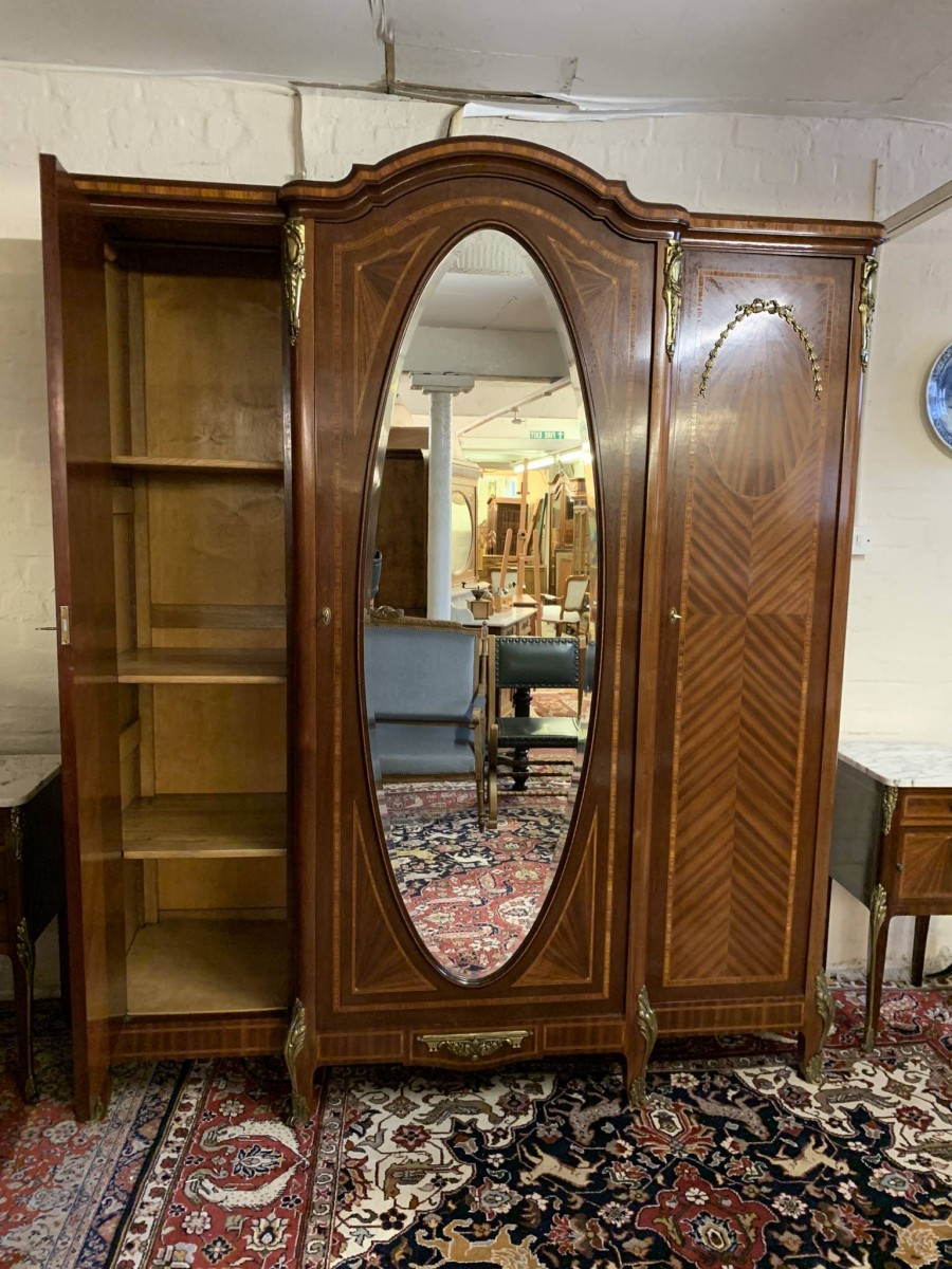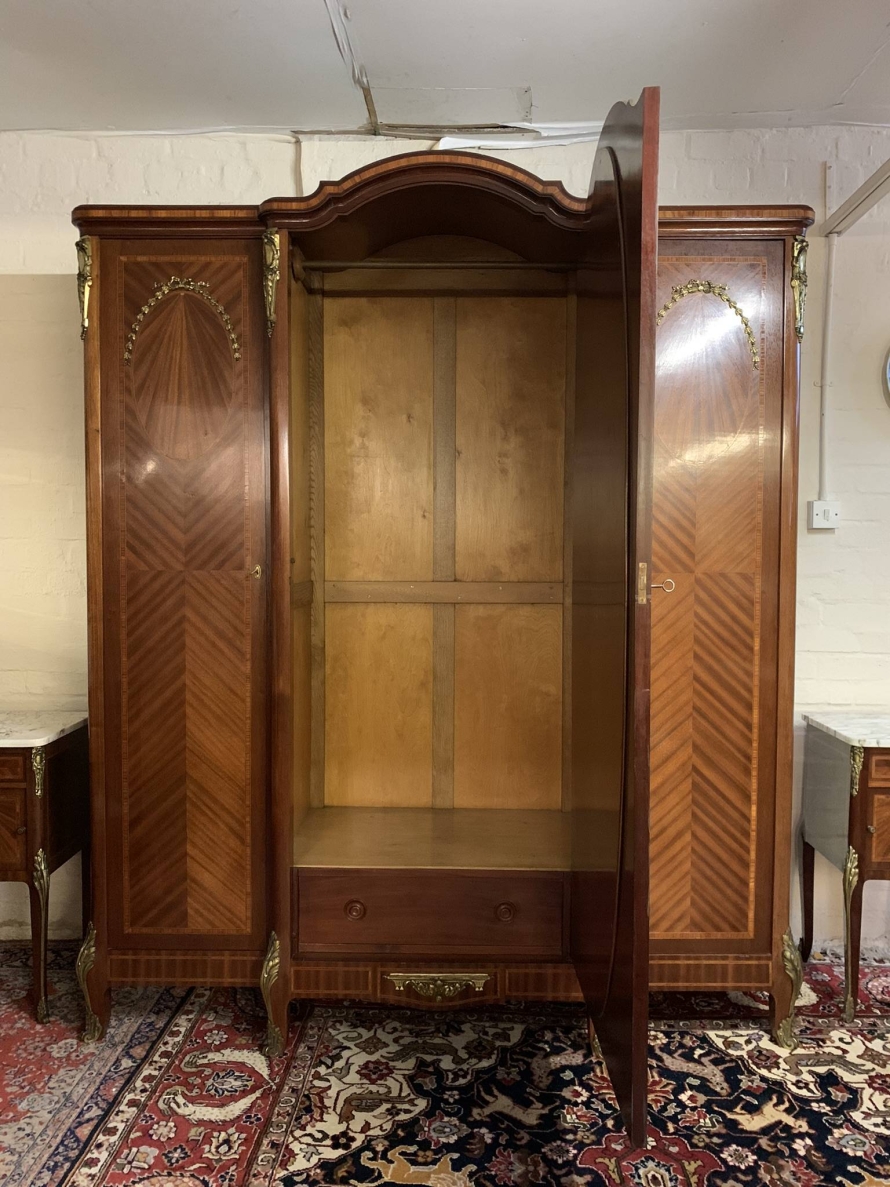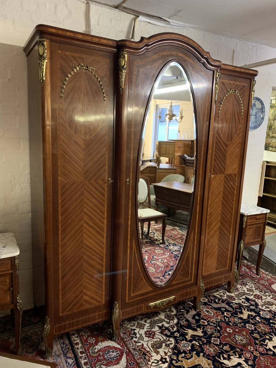 This stunning French antique armoire is in excellent condition and dates circa 1880. The shaped oversailing top sits above a full length bevel edged oval mirrored door. The door opens to reveal a hanging rail with a storage drawer below. The left-hand door and right-hand door open to reveal a hanging rail above three adjustable and removable shelves. The doors having exquisite in lay with gilt mount decoration. Inlaid sides, shaped skirt with central gilt mount this outstanding quality armoire stands on four cabriole shaped legs to the front, each leg having stunning gilt mounts. Please note we are also listing a matching pair of marble top bedside cabinets and a marble top mirrored washstand.