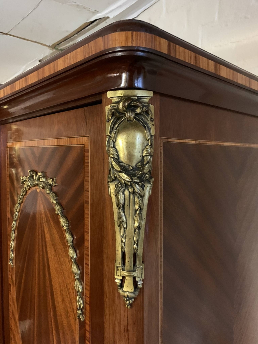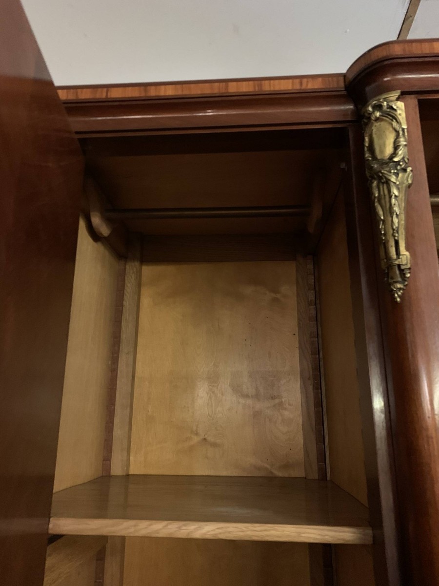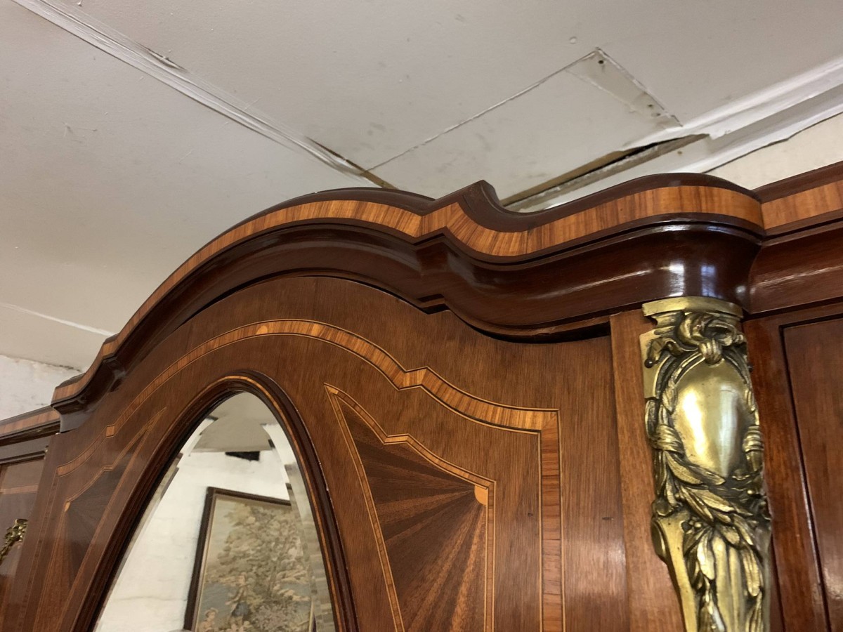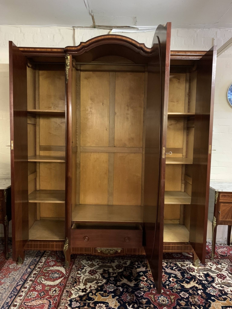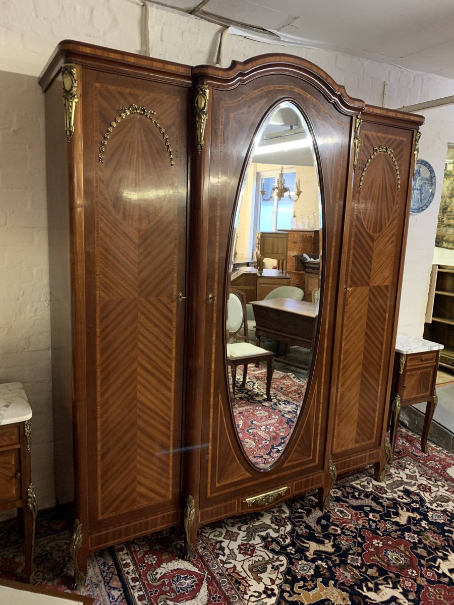 This stunning French antique armoire is in excellent condition and dates circa 1880. The shaped oversailing top sits above a full length bevel edged oval mirrored door. The door opens to reveal a hanging rail with a storage drawer below. The left-hand door and right-hand door open to reveal a hanging rail above three adjustable and removable shelves. The doors having exquisite in lay with gilt mount decoration. Inlaid sides, shaped skirt with central gilt mount this outstanding quality armoire stands on four cabriole shaped legs to the front, each leg having stunning gilt mounts. Please note we are also listing a matching pair of marble top bedside cabinets and a marble top mirrored washstand.