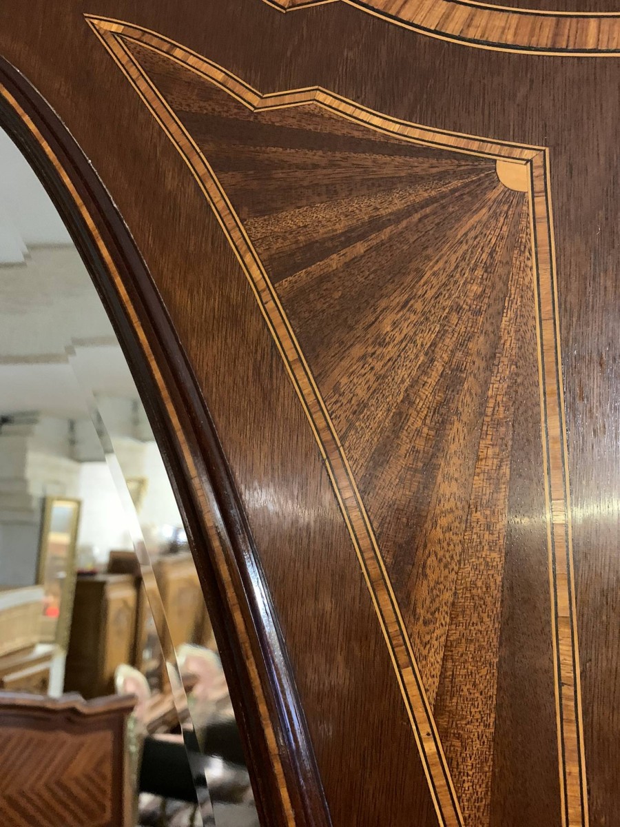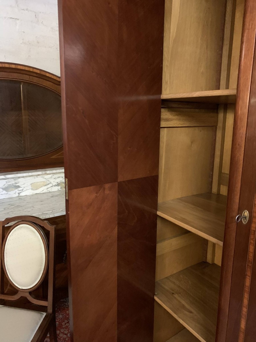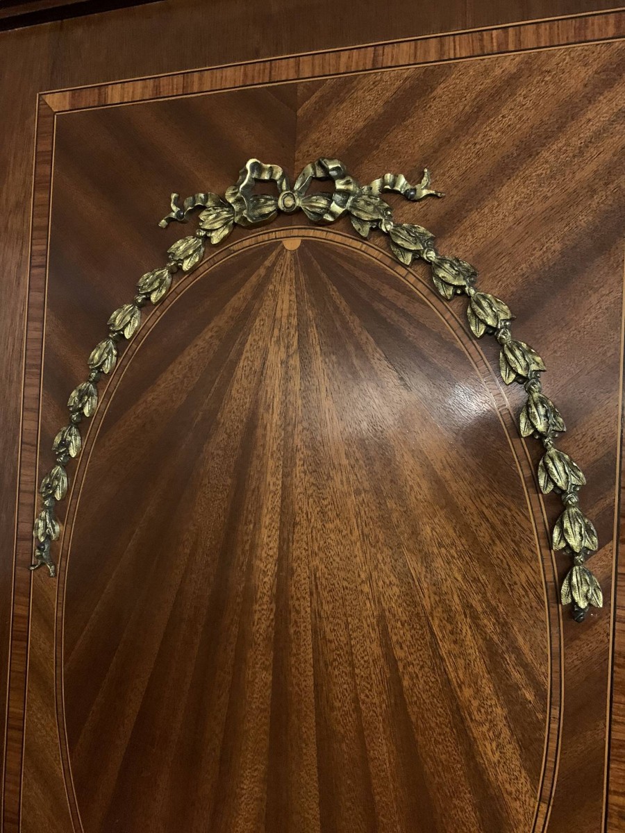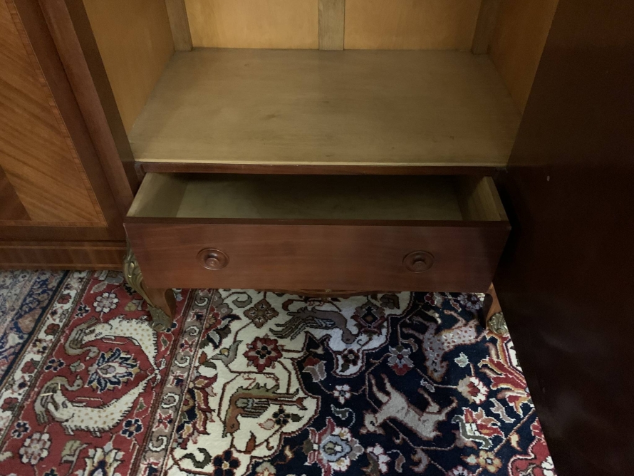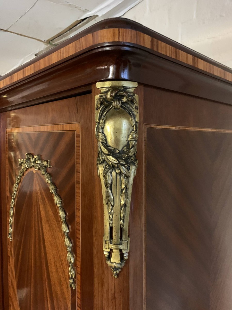 This stunning French antique armoire is in excellent condition and dates circa 1880. The shaped oversailing top sits above a full length bevel edged oval mirrored door. The door opens to reveal a hanging rail with a storage drawer below. The left-hand door and right-hand door open to reveal a hanging rail above three adjustable and removable shelves. The doors having exquisite in lay with gilt mount decoration. Inlaid sides, shaped skirt with central gilt mount this outstanding quality armoire stands on four cabriole shaped legs to the front, each leg having stunning gilt mounts. Please note we are also listing a matching pair of marble top bedside cabinets and a marble top mirrored washstand.