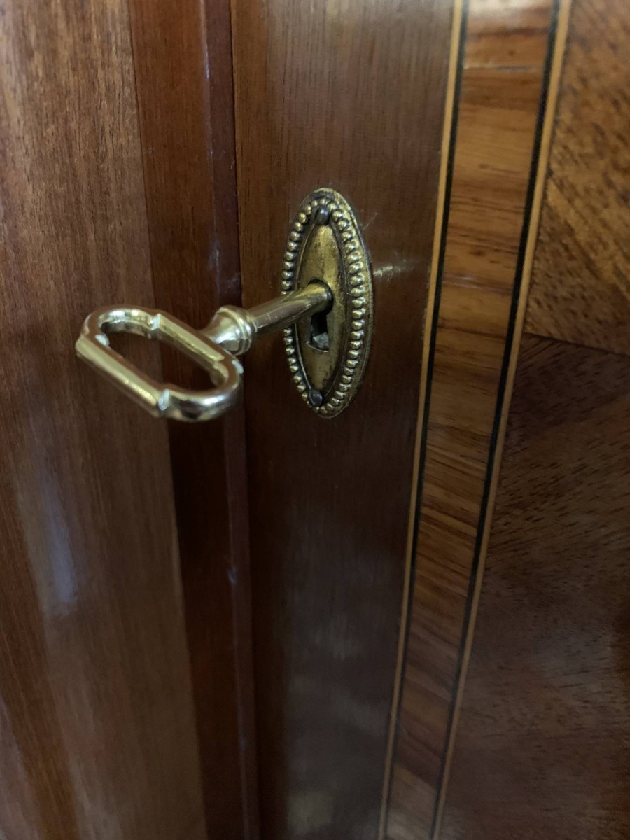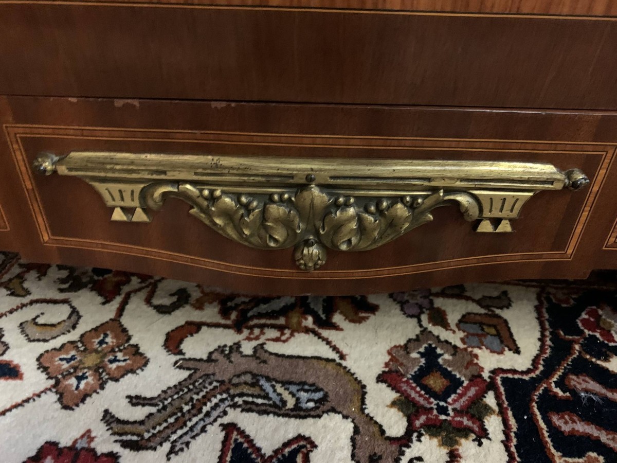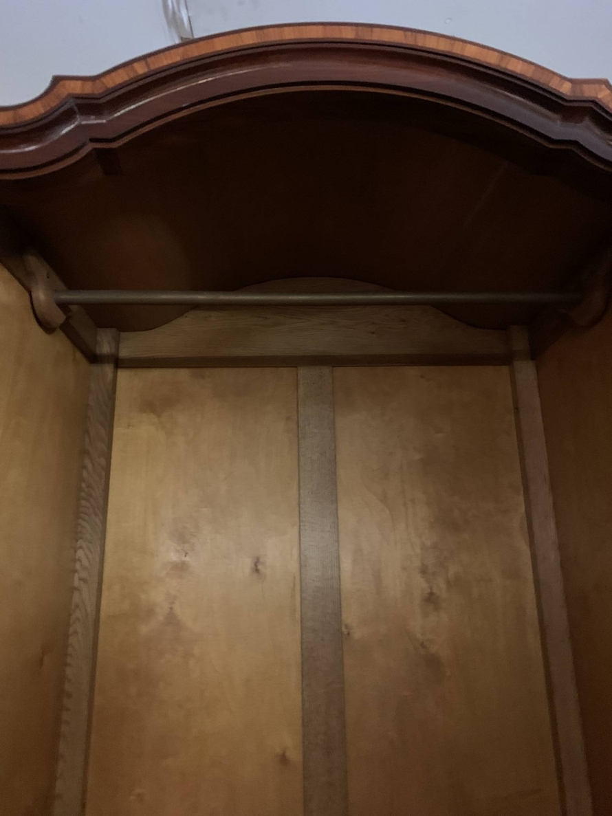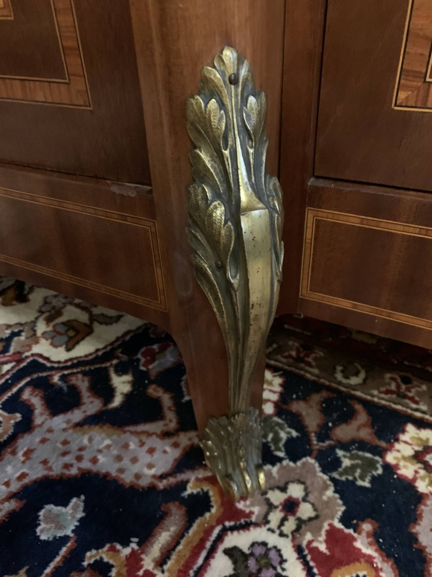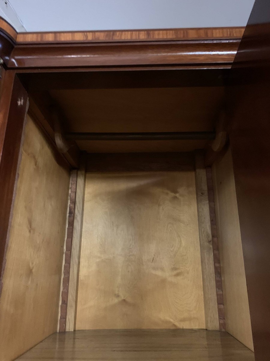 This stunning French antique armoire is in excellent condition and dates circa 1880. The shaped oversailing top sits above a full length bevel edged oval mirrored door. The door opens to reveal a hanging rail with a storage drawer below. The left-hand door and right-hand door open to reveal a hanging rail above three adjustable and removable shelves. The doors having exquisite in lay with gilt mount decoration. Inlaid sides, shaped skirt with central gilt mount this outstanding quality armoire stands on four cabriole shaped legs to the front, each leg having stunning gilt mounts. Please note we are also listing a matching pair of marble top bedside cabinets and a marble top mirrored washstand.