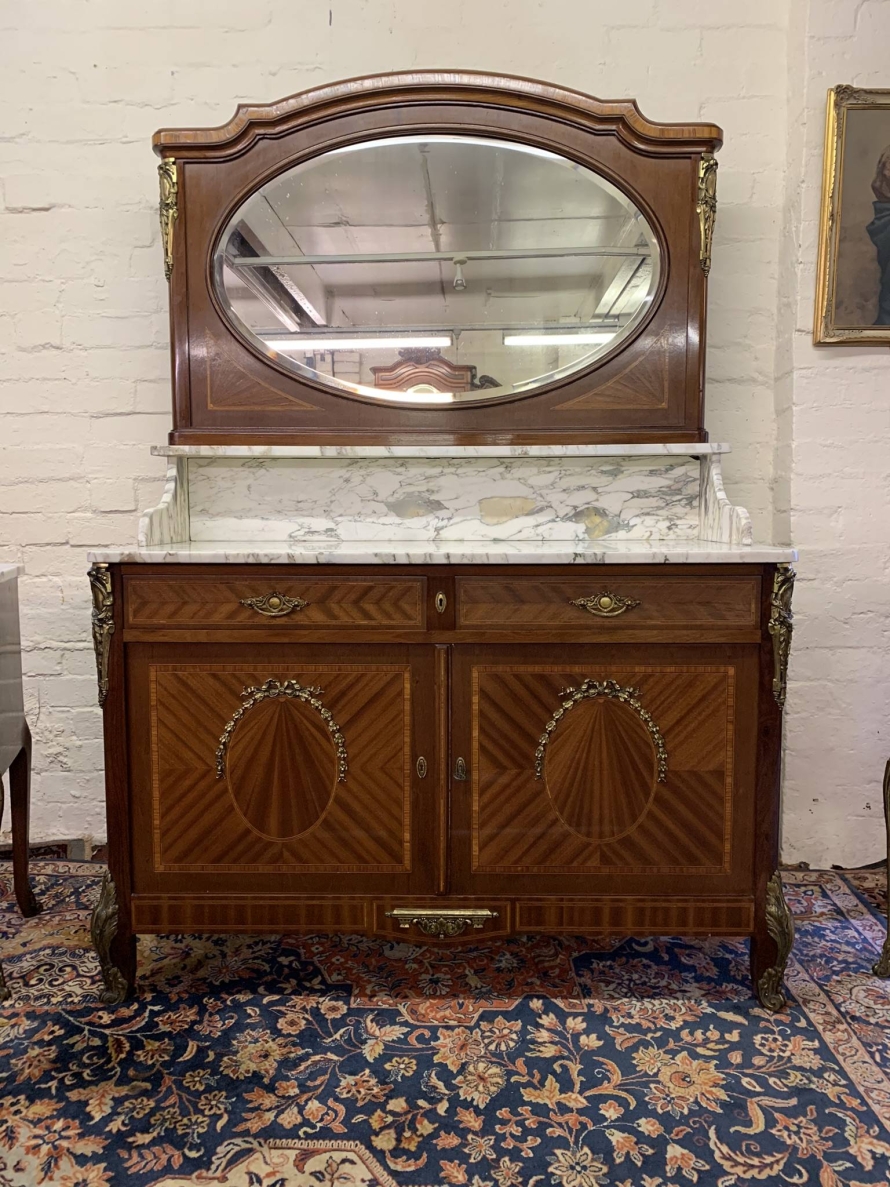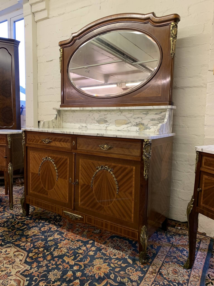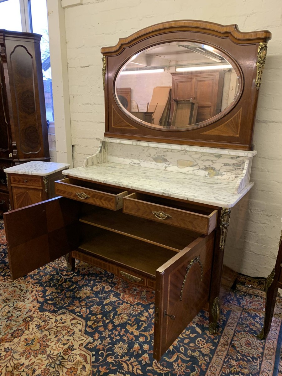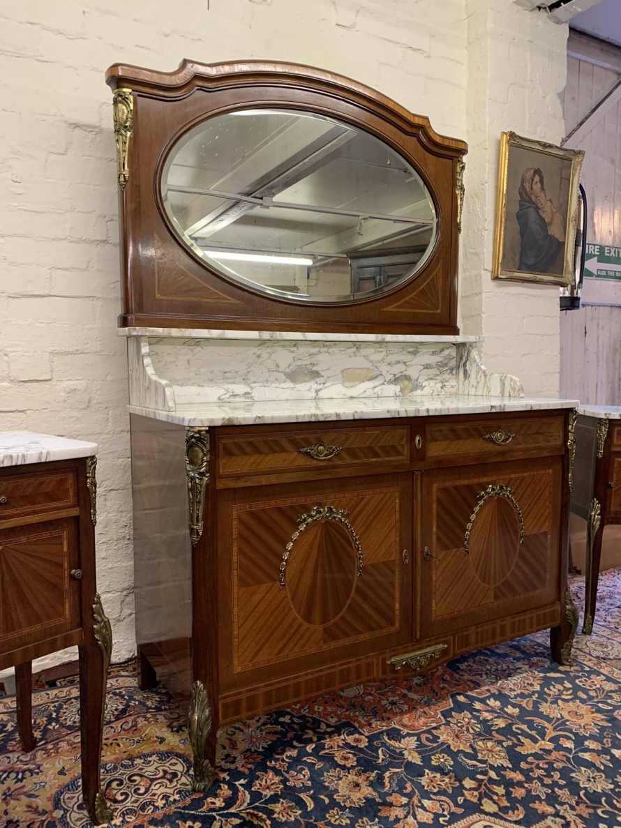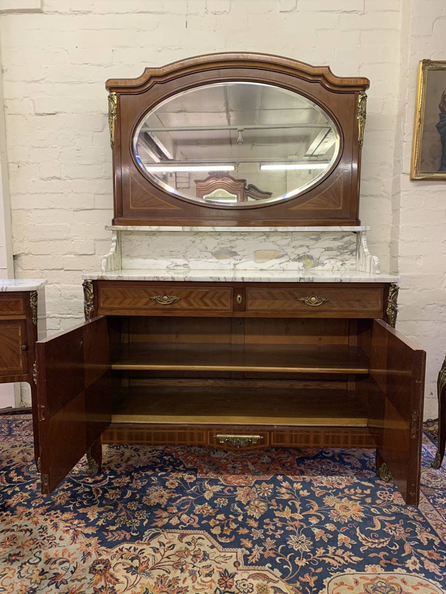 This antique washstand dates circa 1890. The shaped inlaid mirror has fabulous gilt mounts. The marble top sits above two drawers, each drawer is inlaid and has an ornate brass handle. Below are a pair of lockable cupboard doors, each door is inlaid and has guilt mounts, the doors open to reveal a removable wooden shelf. Inlaid sides, this fabulous washstand sits on two cabriole shaped legs to the front which have ornate gilt mounts. Please note there is a slight historical damage to the marble shelf an one of the marble up stands which is shown in the photograph but doesn't detract from the beauty of the item. Please note we are also listing a pair of matching marble top bedside cabinets and mirrored armoire.