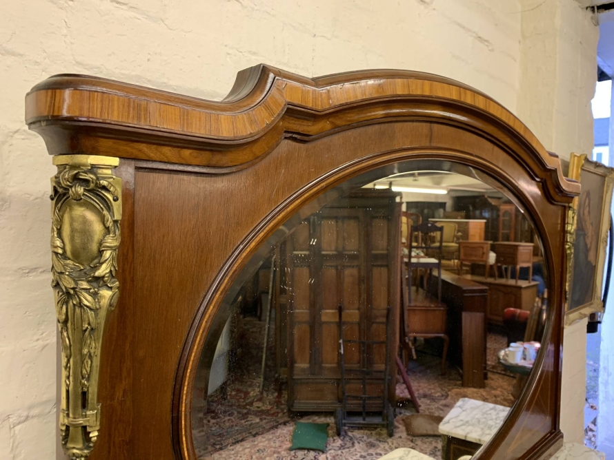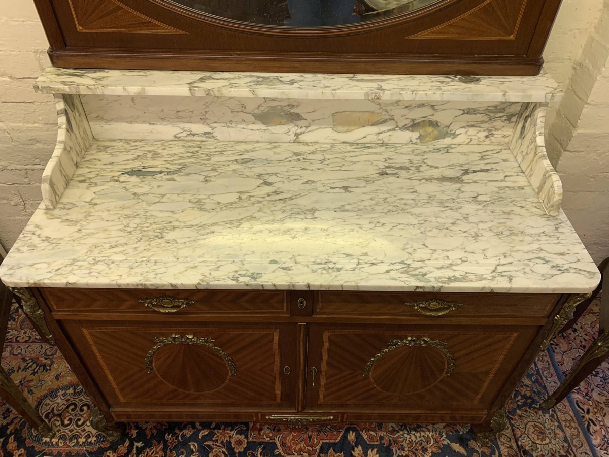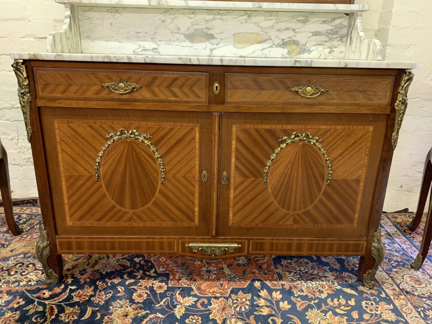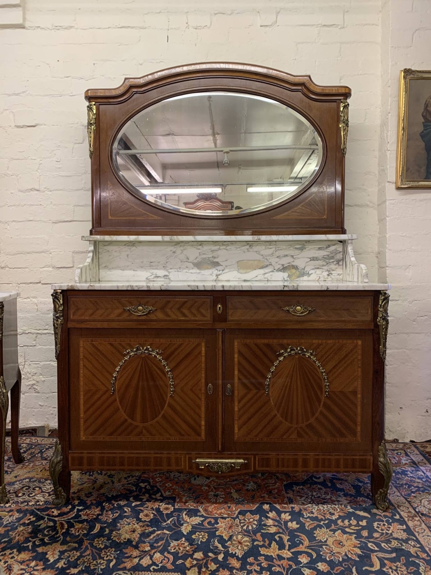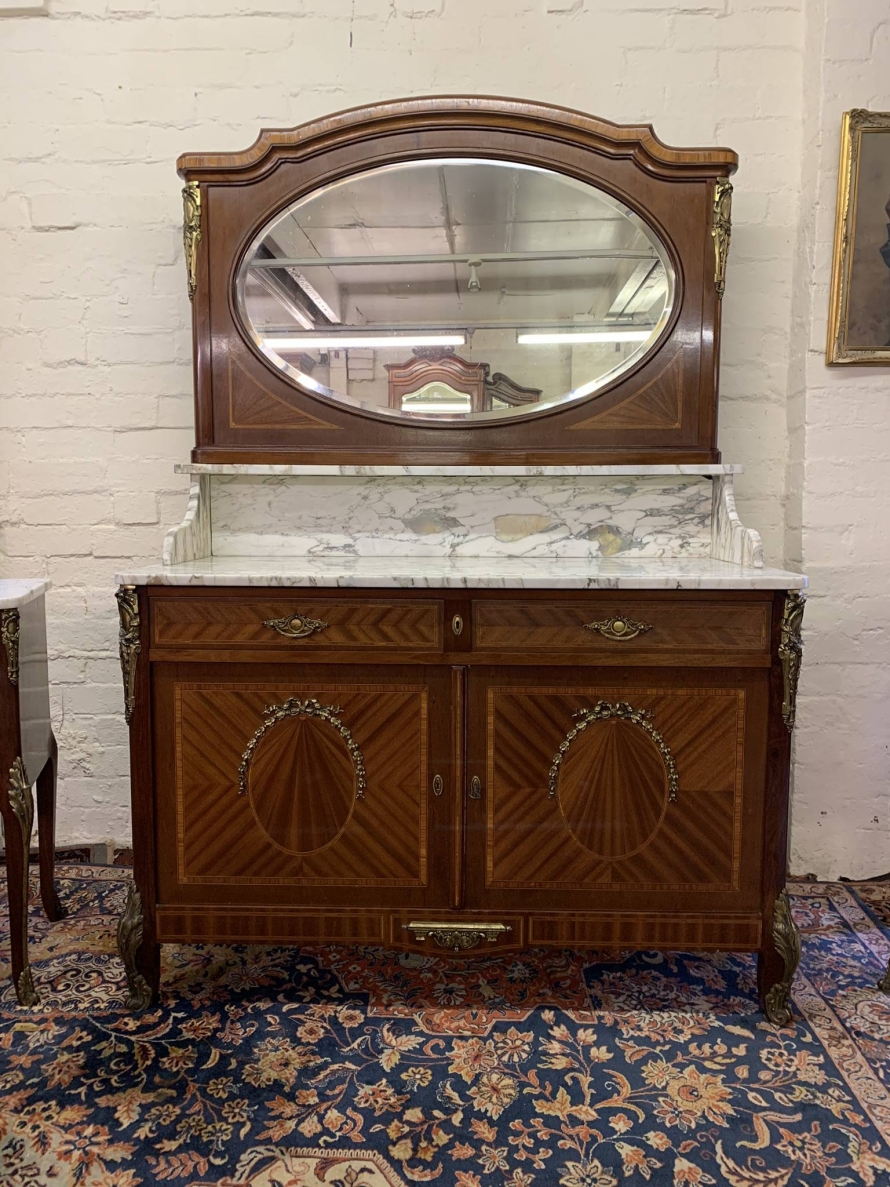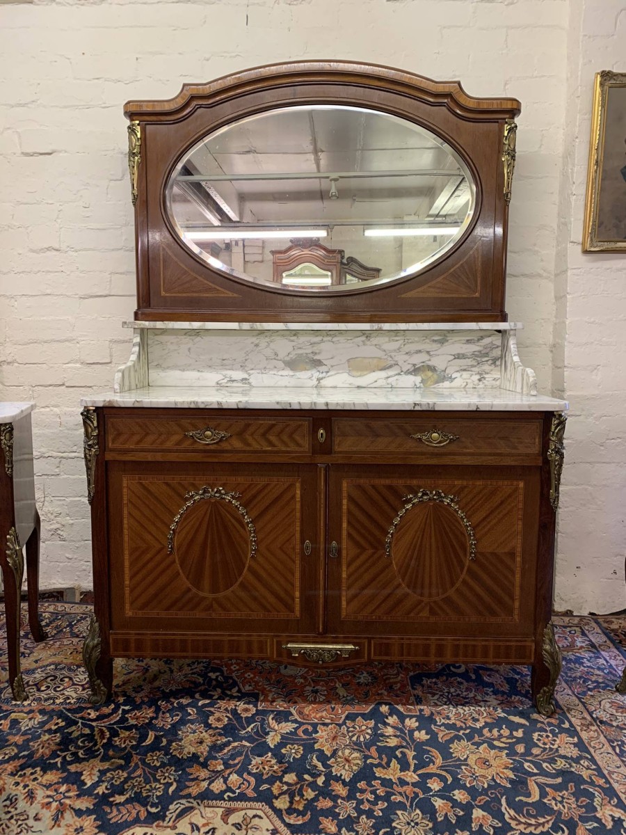 This antique washstand dates circa 1890. The shaped inlaid mirror has fabulous gilt mounts. The marble top sits above two drawers, each drawer is inlaid and has an ornate brass handle. Below are a pair of lockable cupboard doors, each door is inlaid and has guilt mounts, the doors open to reveal a removable wooden shelf. Inlaid sides, this fabulous washstand sits on two cabriole shaped legs to the front which have ornate gilt mounts. Please note there is a slight historical damage to the marble shelf an one of the marble up stands which is shown in the photograph but doesn't detract from the beauty of the item. Please note we are also listing a pair of matching marble top bedside cabinets and mirrored armoire.