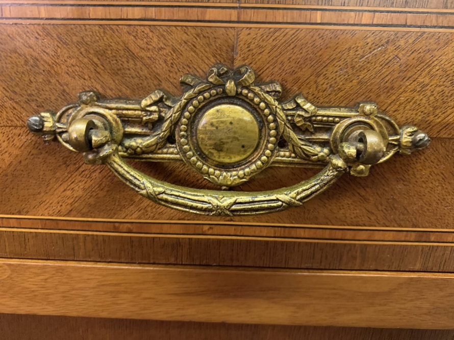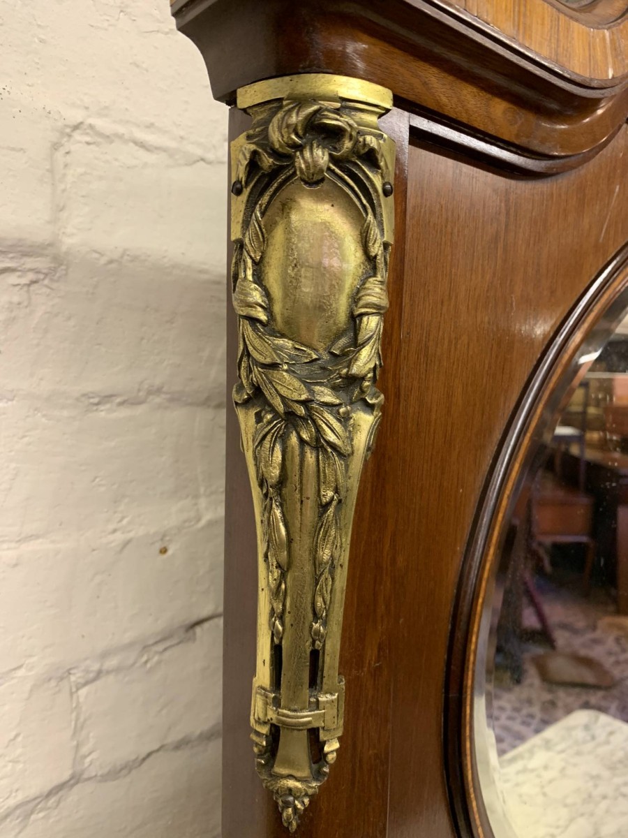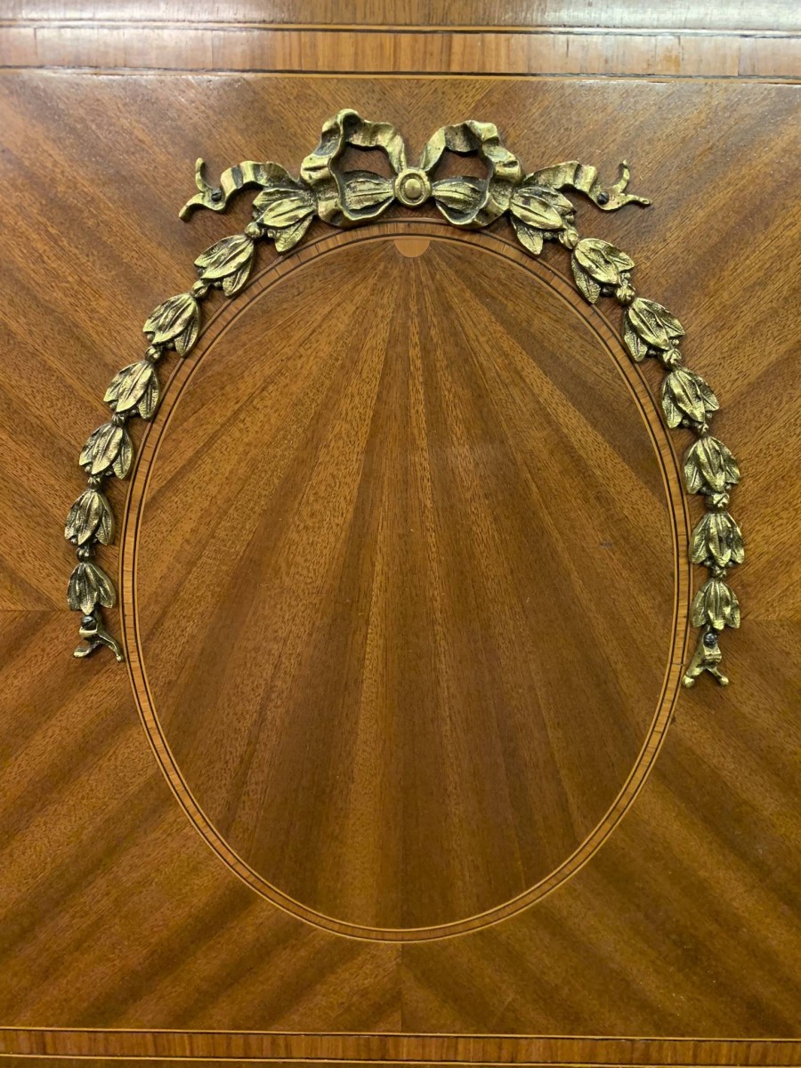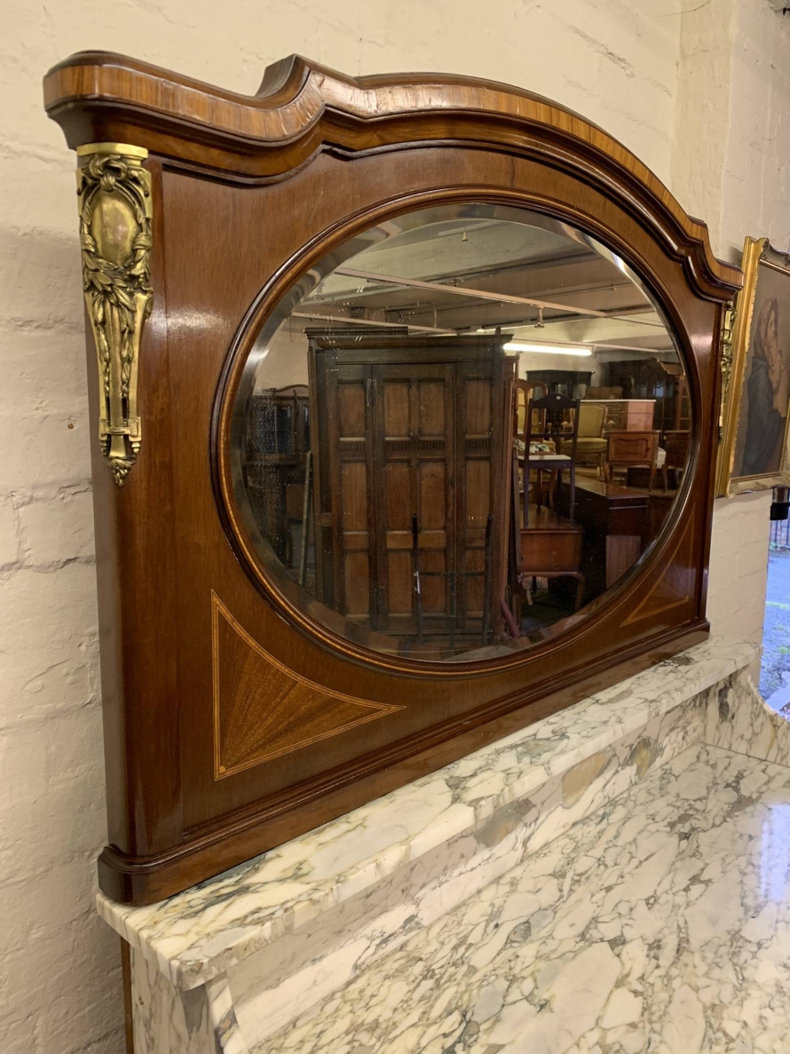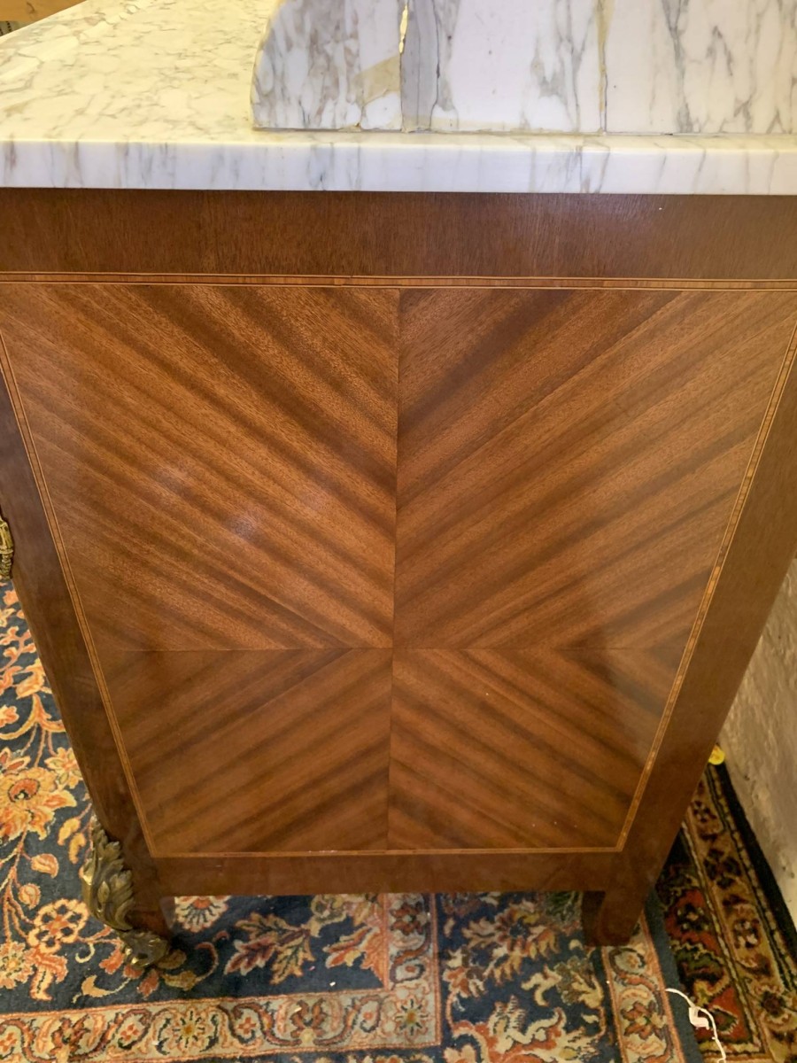 This antique washstand dates circa 1890. The shaped inlaid mirror has fabulous gilt mounts. The marble top sits above two drawers, each drawer is inlaid and has an ornate brass handle. Below are a pair of lockable cupboard doors, each door is inlaid and has guilt mounts, the doors open to reveal a removable wooden shelf. Inlaid sides, this fabulous washstand sits on two cabriole shaped legs to the front which have ornate gilt mounts. Please note there is a slight historical damage to the marble shelf an one of the marble up stands which is shown in the photograph but doesn't detract from the beauty of the item. Please note we are also listing a pair of matching marble top bedside cabinets and mirrored armoire.