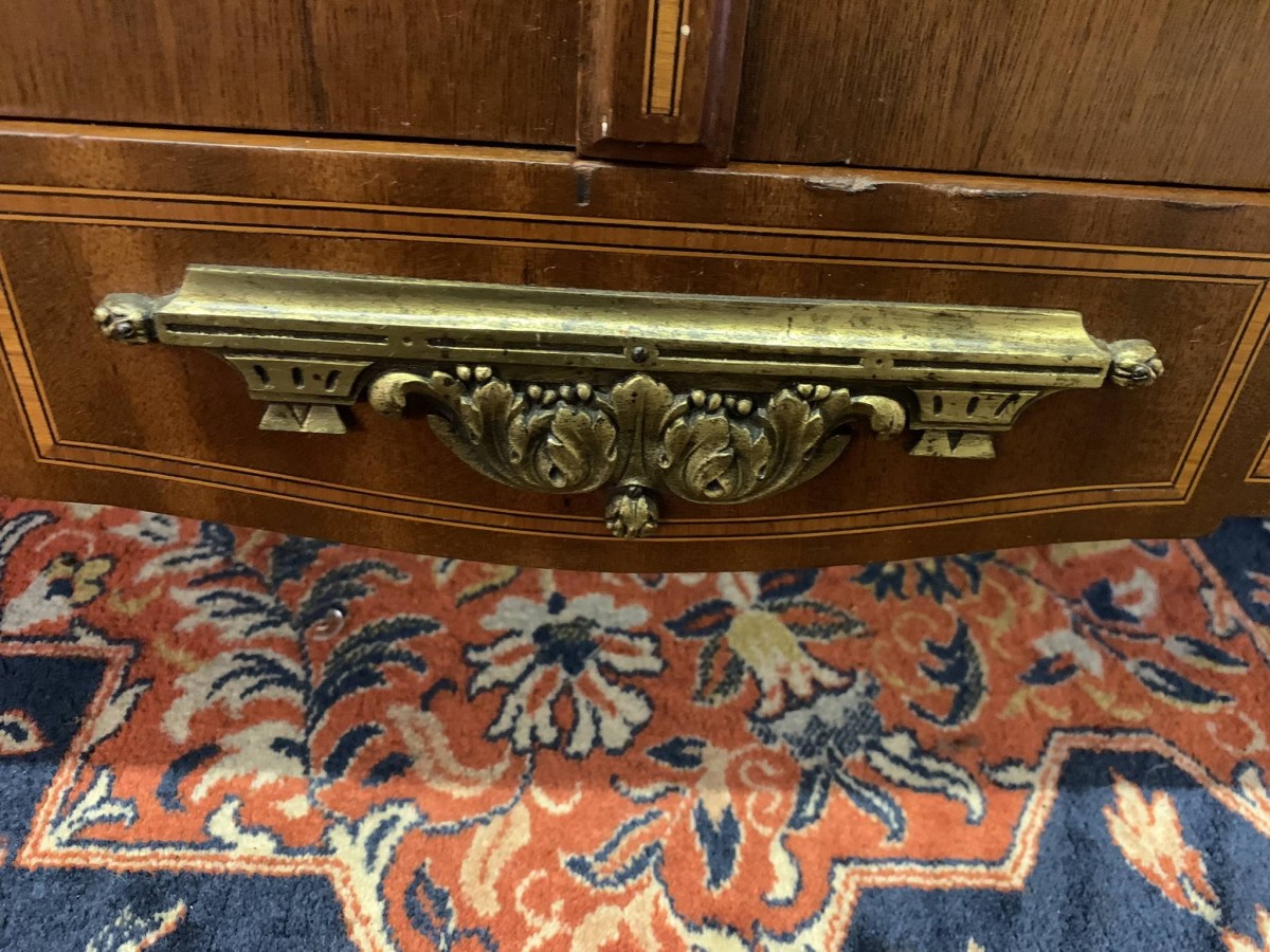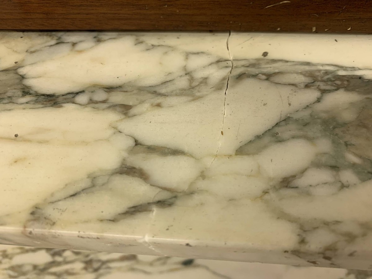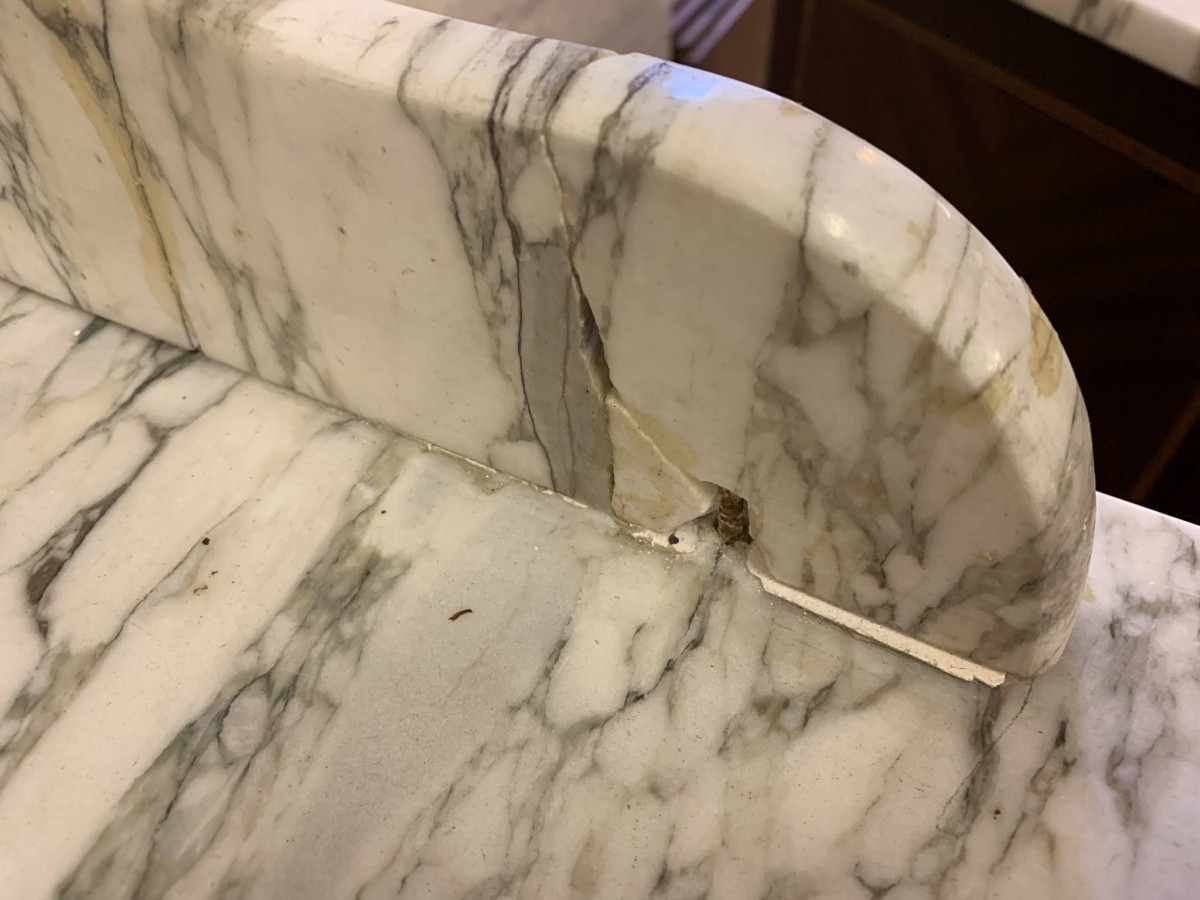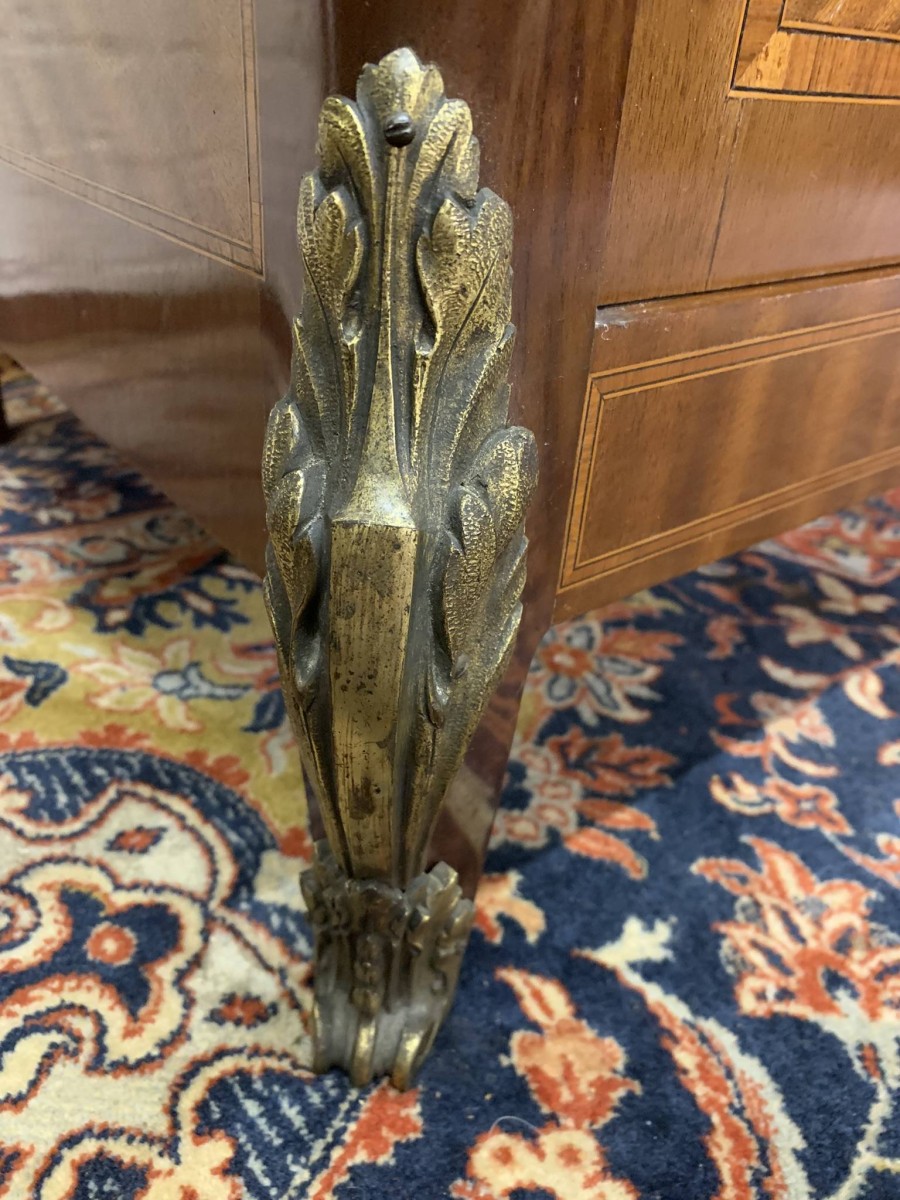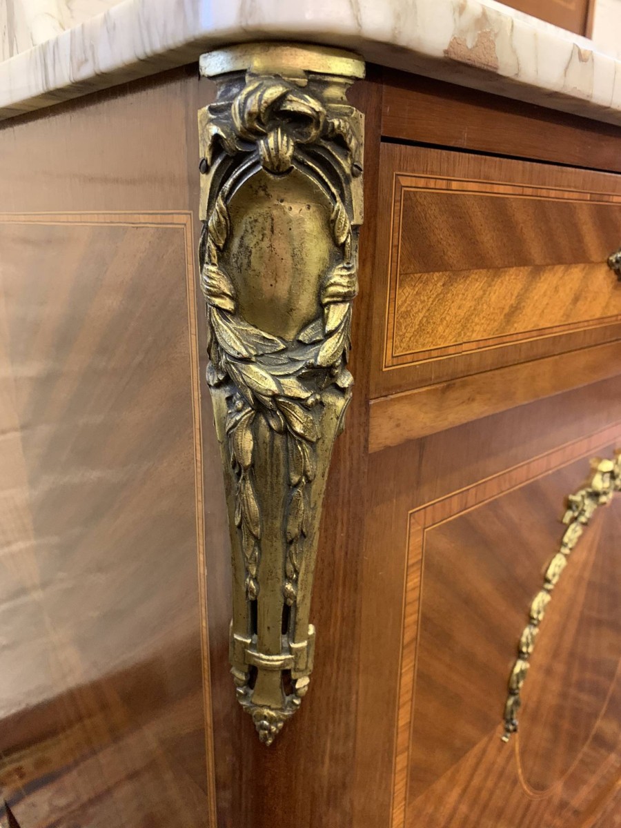 This antique washstand dates circa 1890. The shaped inlaid mirror has fabulous gilt mounts. The marble top sits above two drawers, each drawer is inlaid and has an ornate brass handle. Below are a pair of lockable cupboard doors, each door is inlaid and has guilt mounts, the doors open to reveal a removable wooden shelf. Inlaid sides, this fabulous washstand sits on two cabriole shaped legs to the front which have ornate gilt mounts. Please note there is a slight historical damage to the marble shelf an one of the marble up stands which is shown in the photograph but doesn't detract from the beauty of the item. Please note we are also listing a pair of matching marble top bedside cabinets and mirrored armoire.