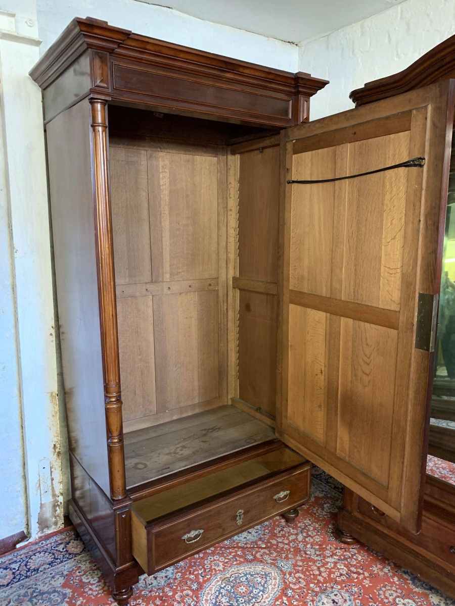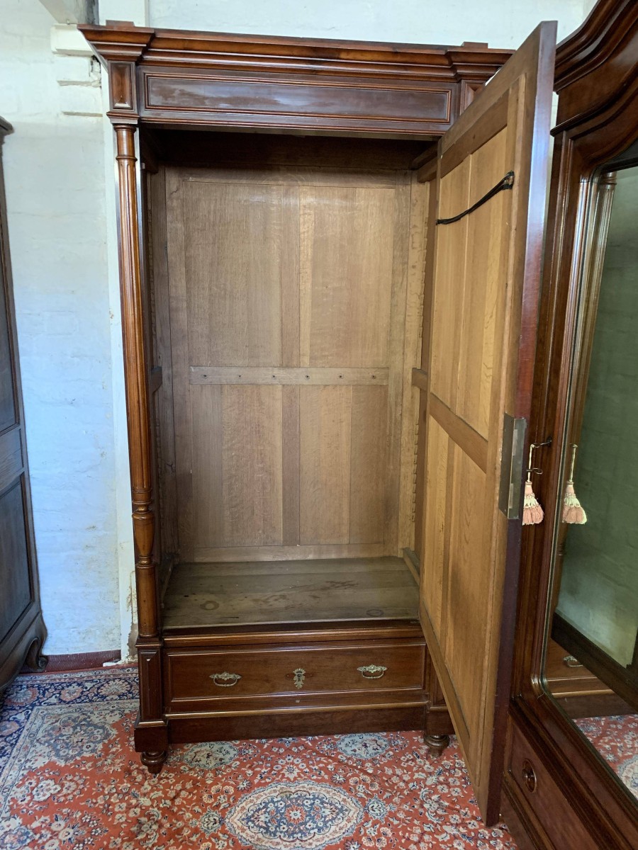 This super French armoire dates circa 1890. The stepped cornice sits above a lockable bevel edged full length mirrored door, the door opens to reveal a hanging rail. The door is flanked by a pair of elegant reeded columns. There is a drawer below the mirrored door which has a pair of ornate brass handles. This fabulous armoire sits on two turned feet to the front.