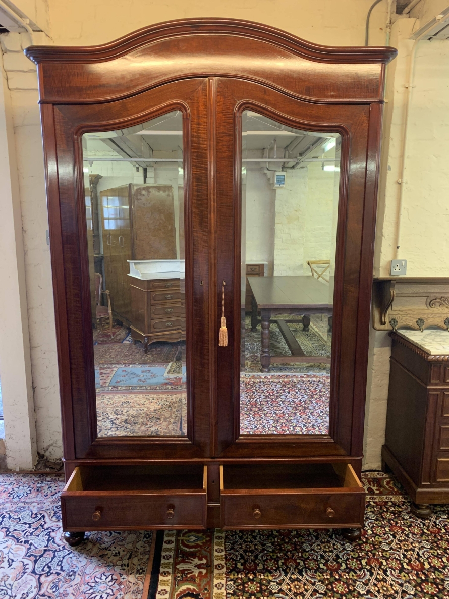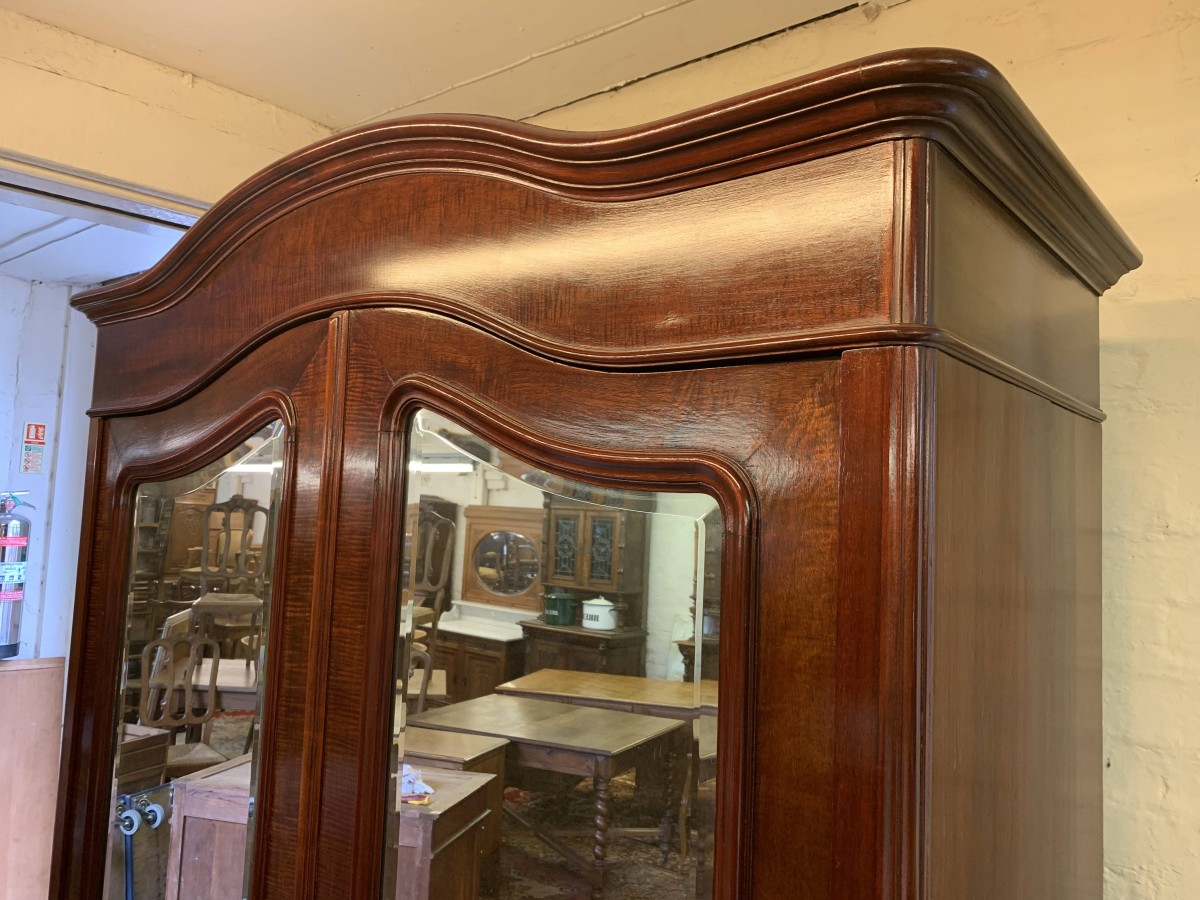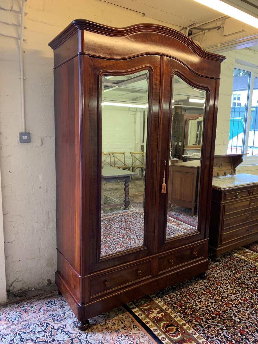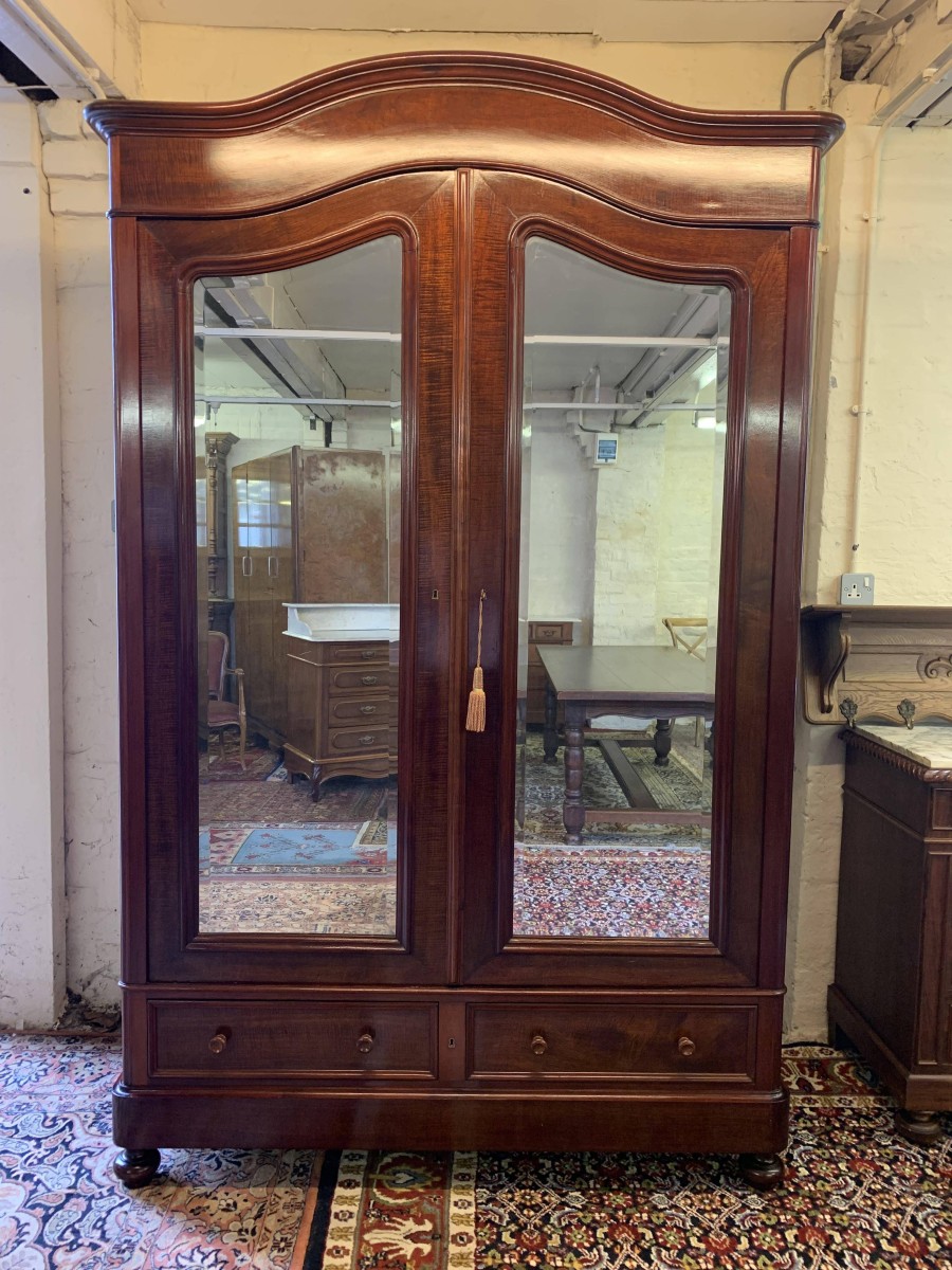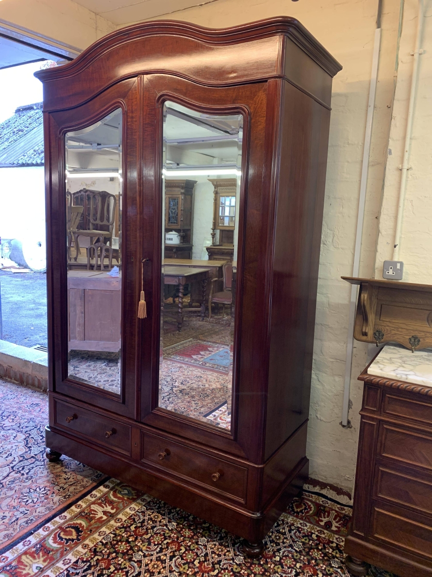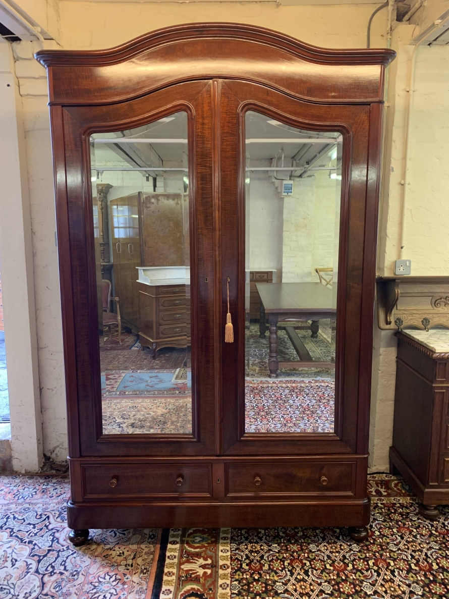 Made in stunning mahogany this French armoire dates circa 1890. The shaped top sits above a pair of lockable shaped bevelled mirrored doors. The doors open to reveal a shelf a above a brass hanging rail. Below are a pair of drawers, each drawer having a pair of turned handles. This stunning armoire sits on two turned feet to the front. Please note this armoire completely splits down for easy transportation and delivery into any home.