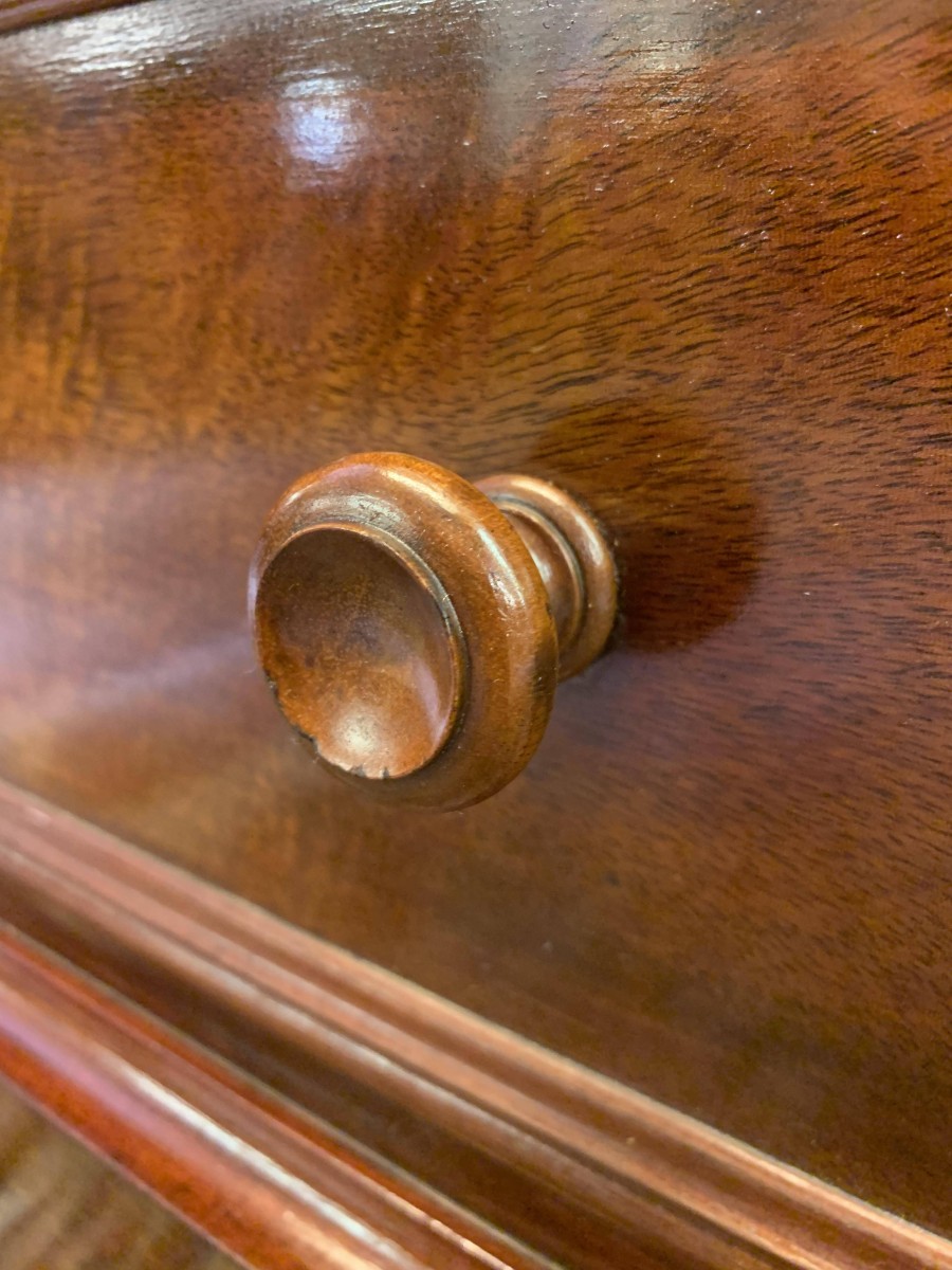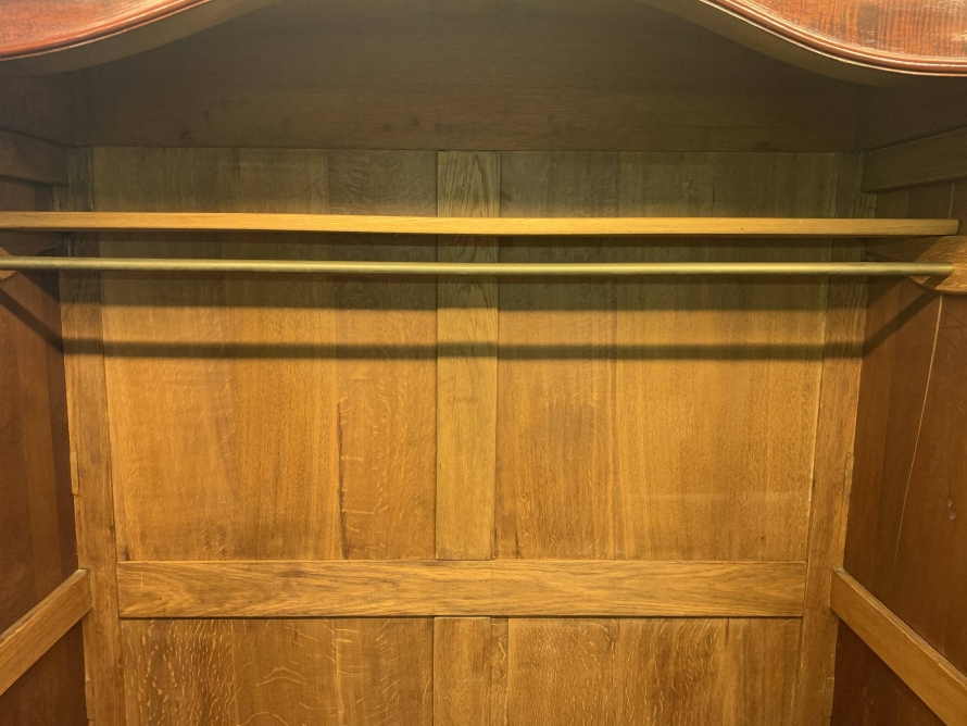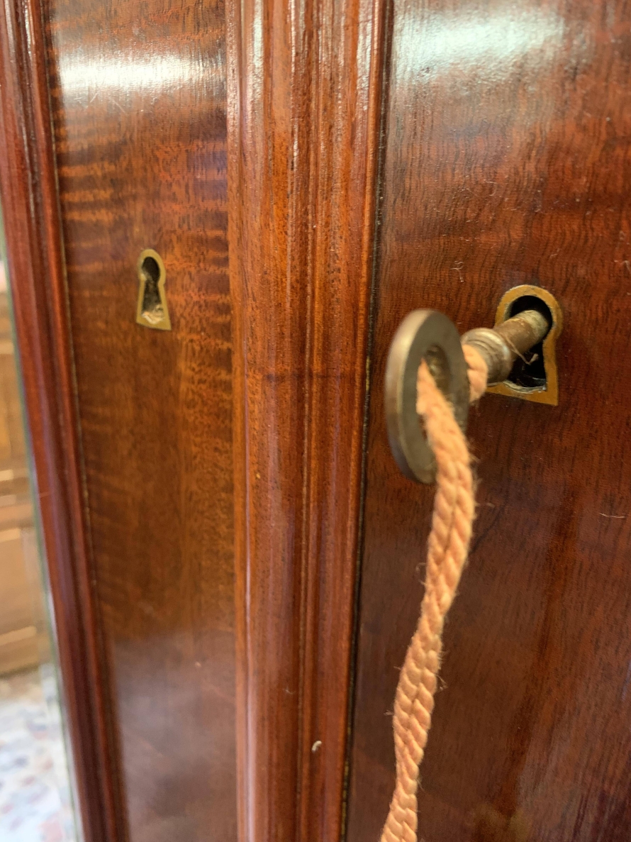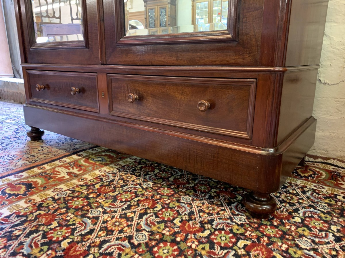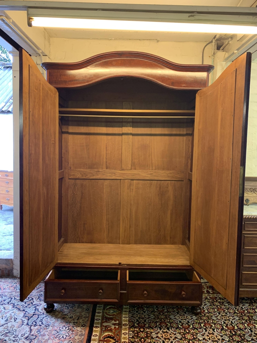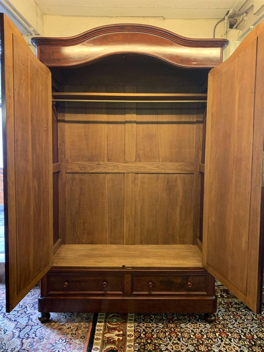Made in stunning mahogany this French armoire dates circa 1890. The shaped top sits above a pair of lockable shaped bevelled mirrored doors. The doors open to reveal a shelf a above a brass hanging rail. Below are a pair of drawers, each drawer having a pair of turned handles. This stunning armoire sits on two turned feet to the front. Please note this armoire completely splits down for easy transportation and delivery into any home.