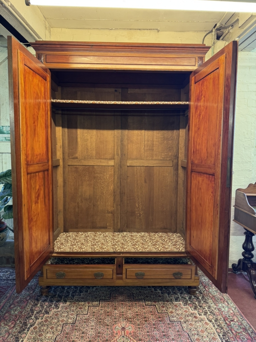 The over sailing top sits above a pair of lockable full length bevel edged mirrored doors, the doors open to reveal a hanging rail with a shelf above. With two drawers below and standing on two fabulous turned feet to the front. Please note the armoire completely splits down for easy transportation and delivery into any home.